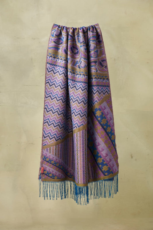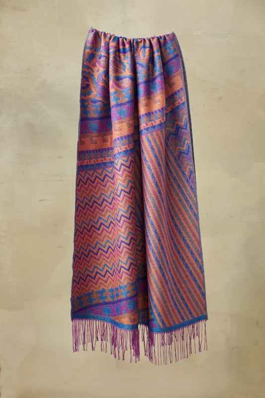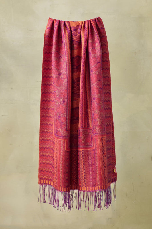Floral motifs and geometric designs in intense colours on this baby alpaca and silk shawl...