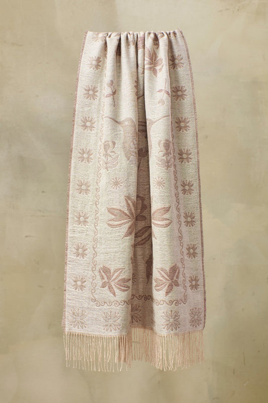 Floral designs and bird motifs feature on this baby alpaca and silk shawl.