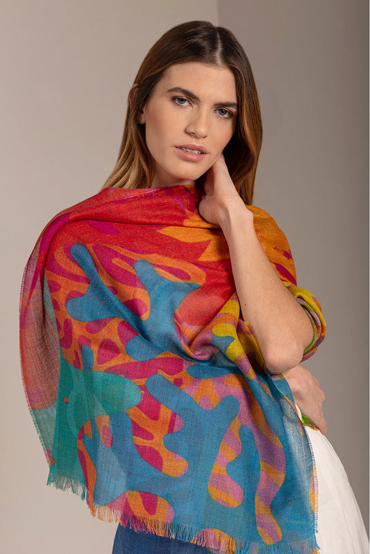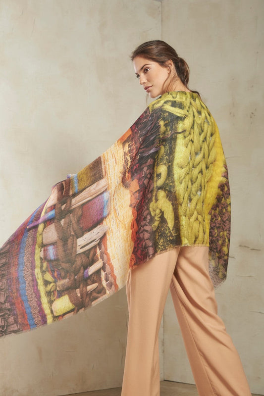 Elegant pashmina in baby alpaca and silk, with colorful graphics inspired by Peruvian retablos.