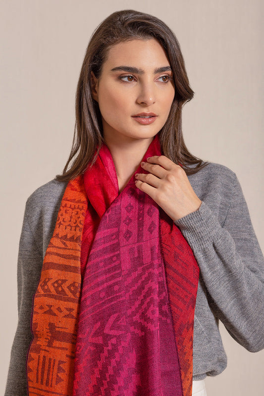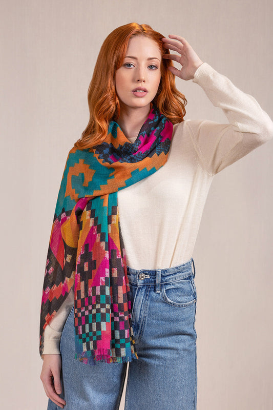Abstract shapes and rich colours embellish our soft Vetro pashmina, the perfect accessory to complement...