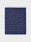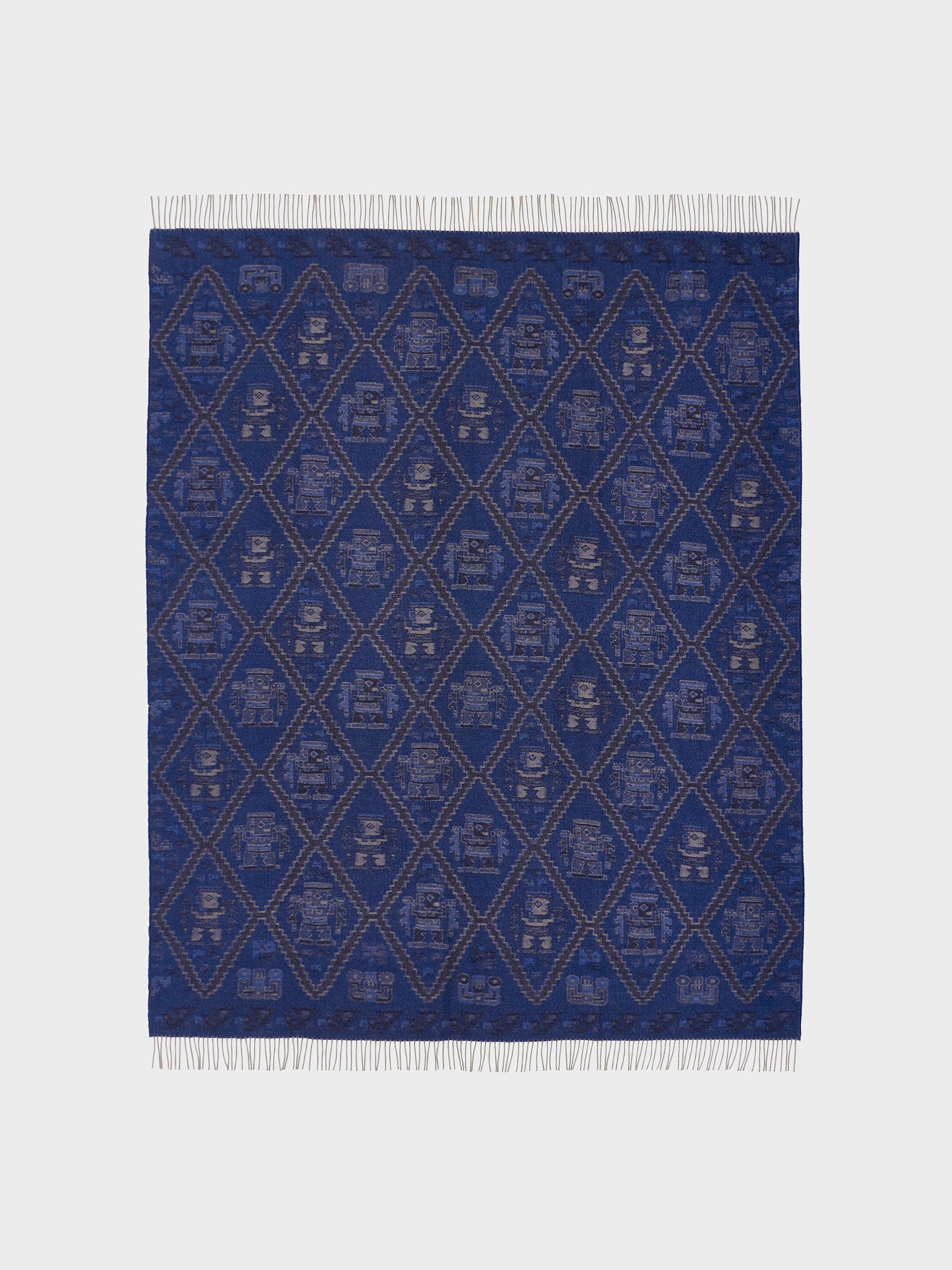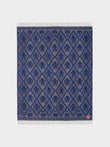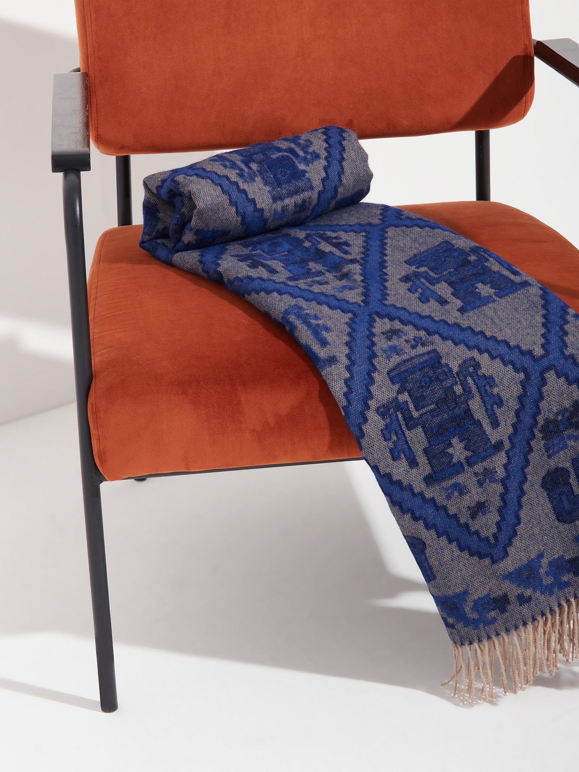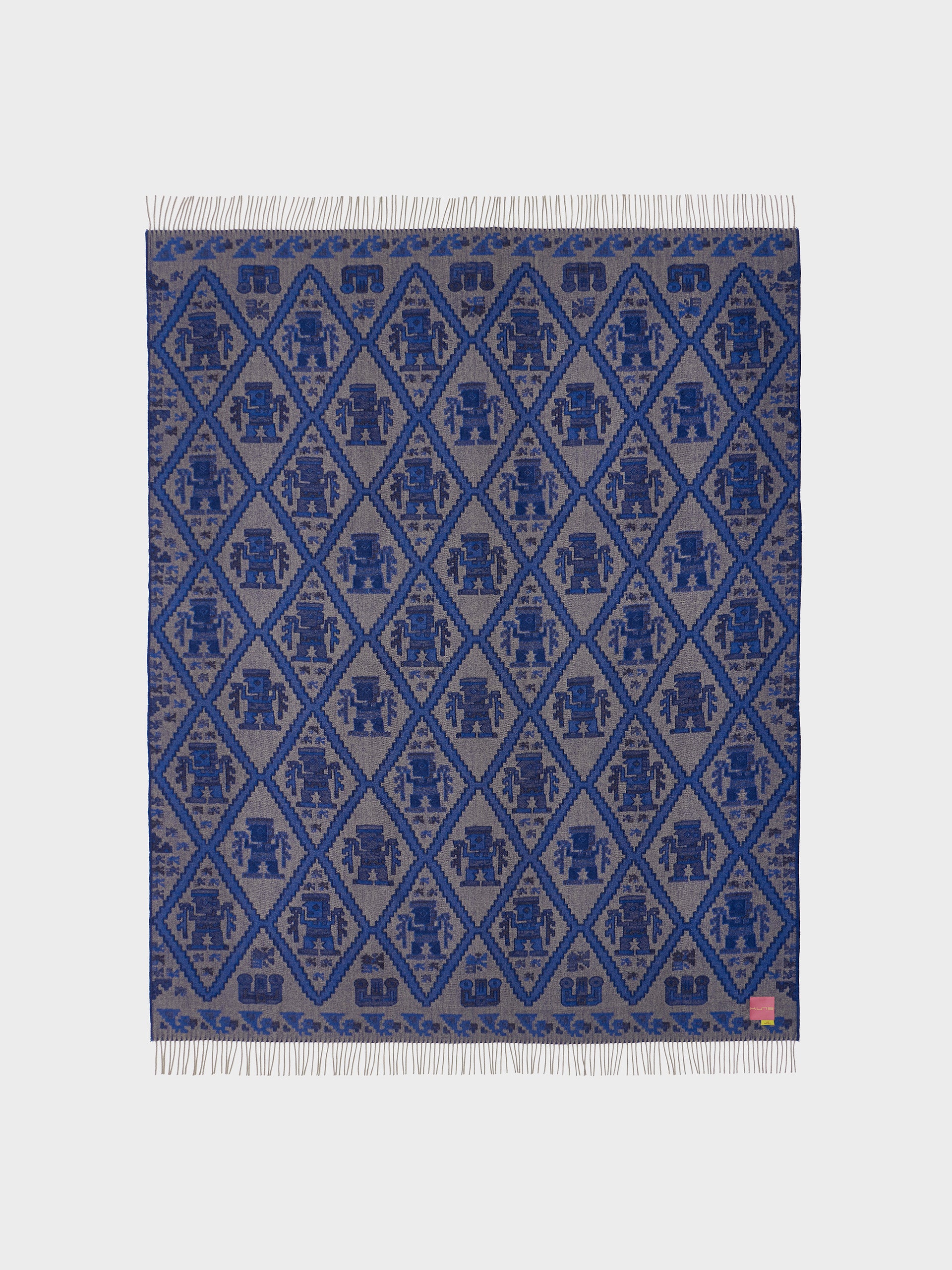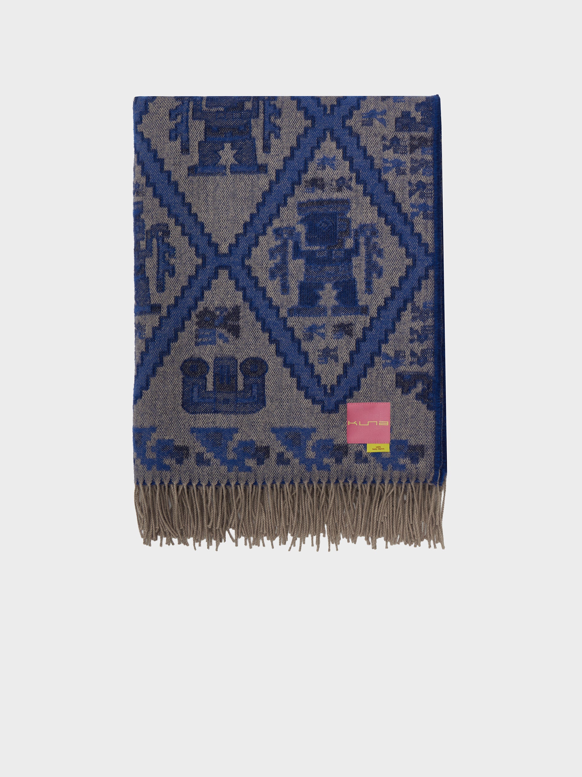 Mochica 2 blanket in blue, made from 100% baby alpaca using a double-sided Jacquard technique. Measuring 200/184 x 145 cm, it is inspired by the Mochica culture, reinterpreting its ancestral legacy in a design inspired by indigenous culture. | Predominant material: Baby Alpaca