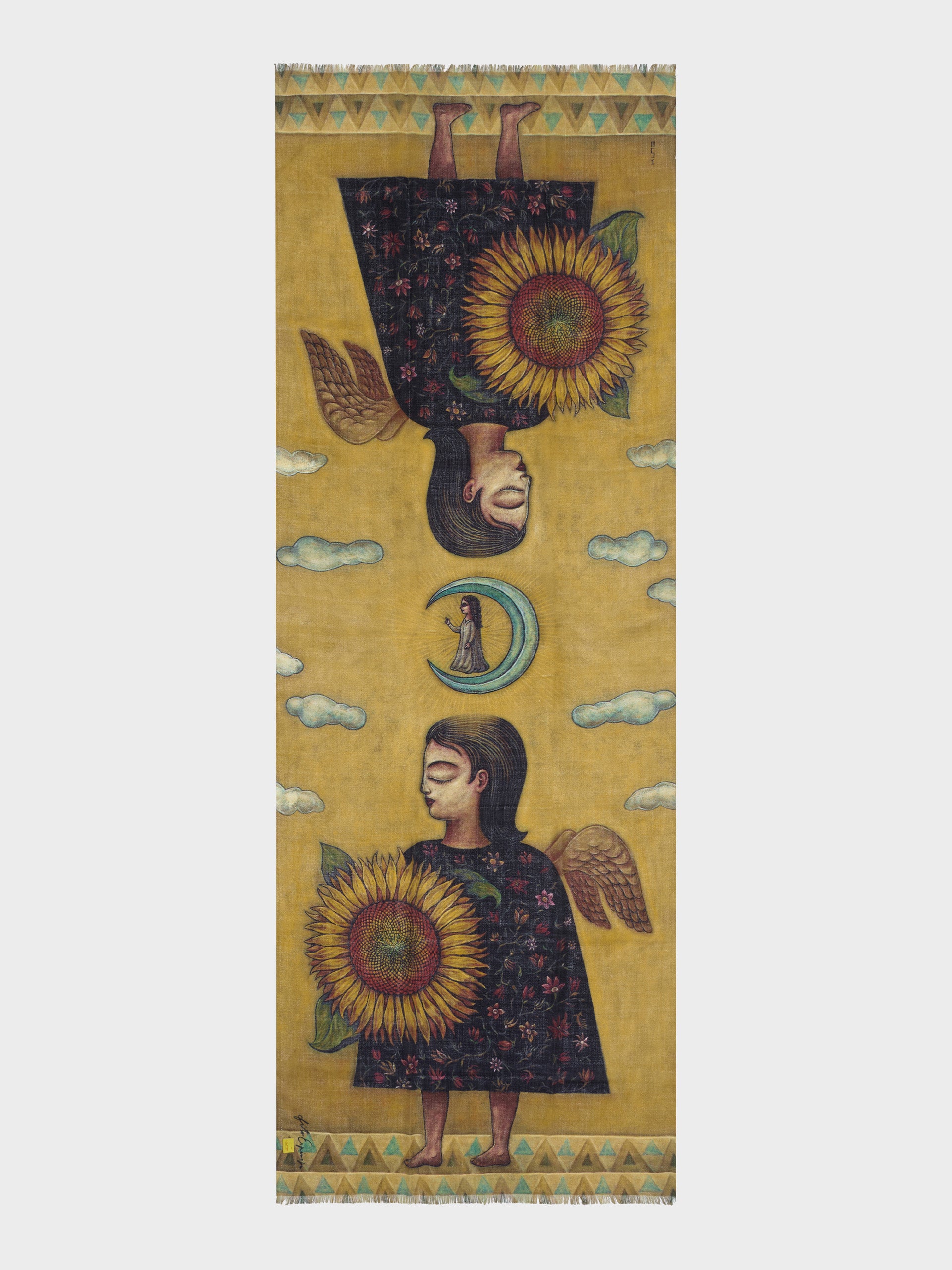 Inspired by the aesthetics of the Cusco School, this painting represents the balance between the purpose symbolized by the sun (sunflower) and the feminine principle represented by the woman and the influence of the moon. This elegant stole was inspired by our artist Fito Espinoza and is made from baby alpaca and silk. | Predominant material: Baby Alpaca