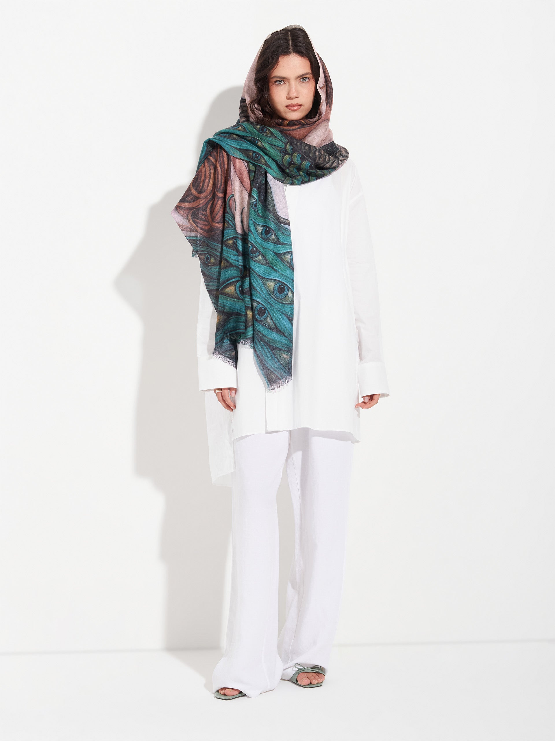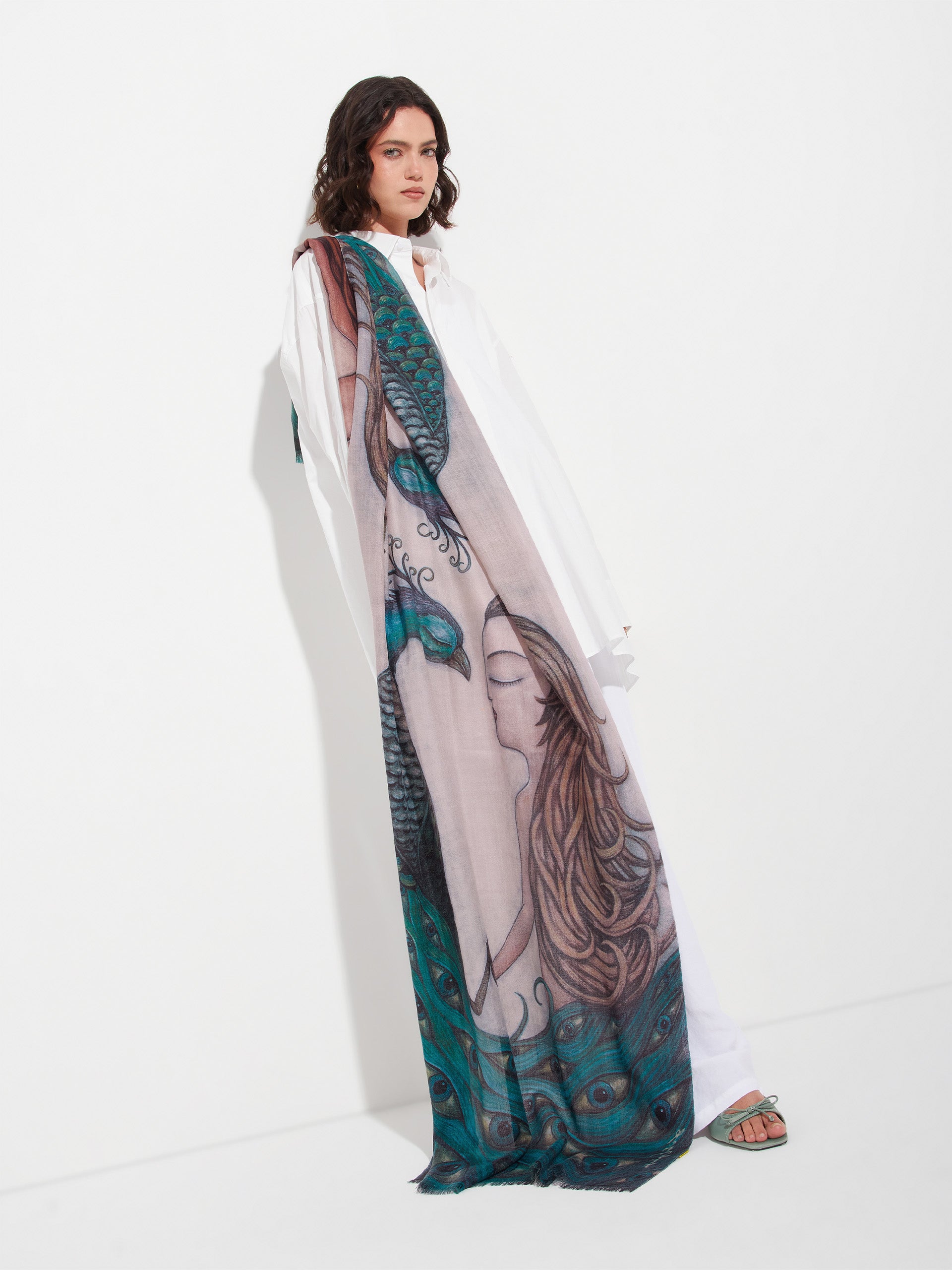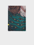 The majesty and beauty of this bird, whose tail resembles hundreds of eyes, symbolizes for me the consciousness and wisdom of nature that is given to those who are open to receiving it. This majestic stole was inspired by our artist Fito Espinoza and is made of baby alpaca and silk. | Predominant material: Baby Alpaca