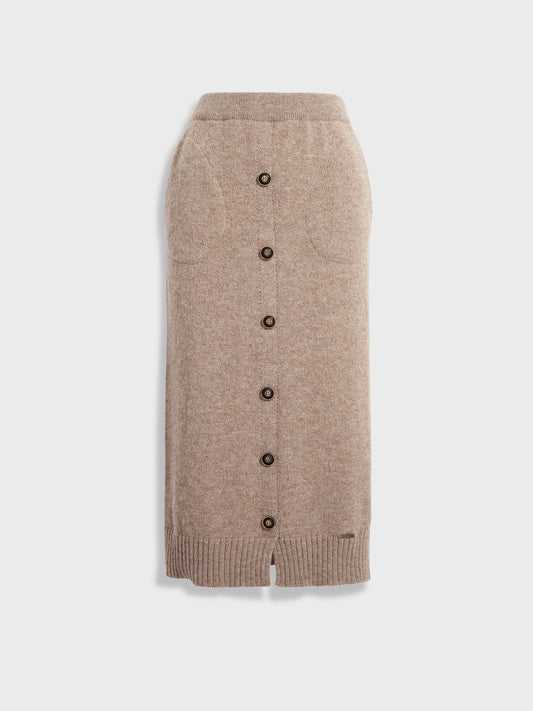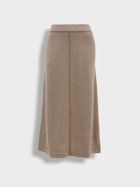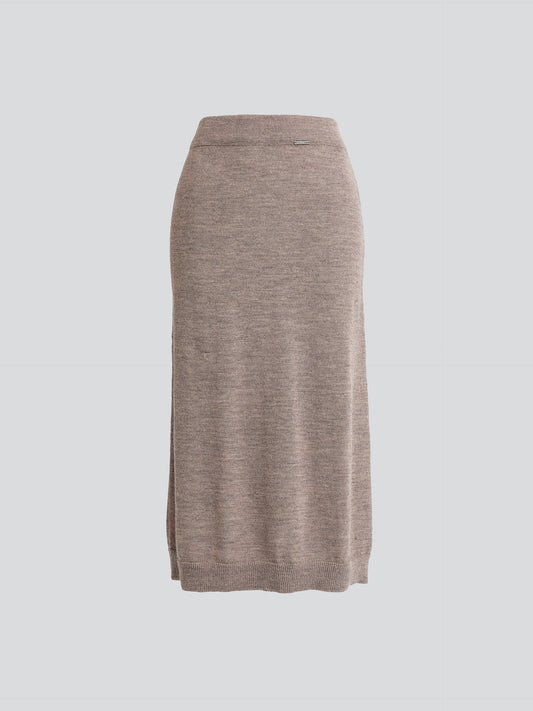 Brenda skirt in brown, knitted in jersey stitch with a classic half-English stitch design. Made...