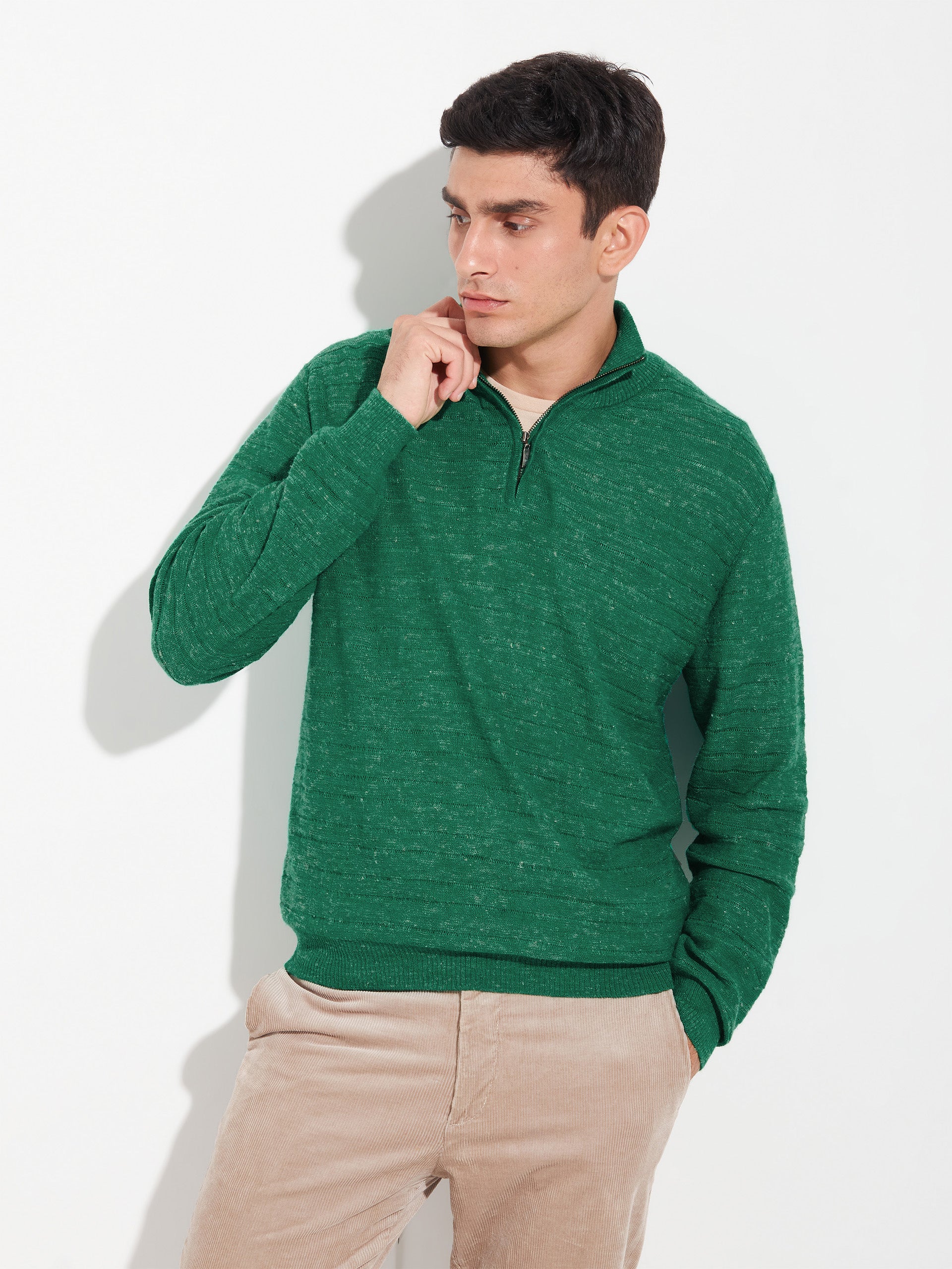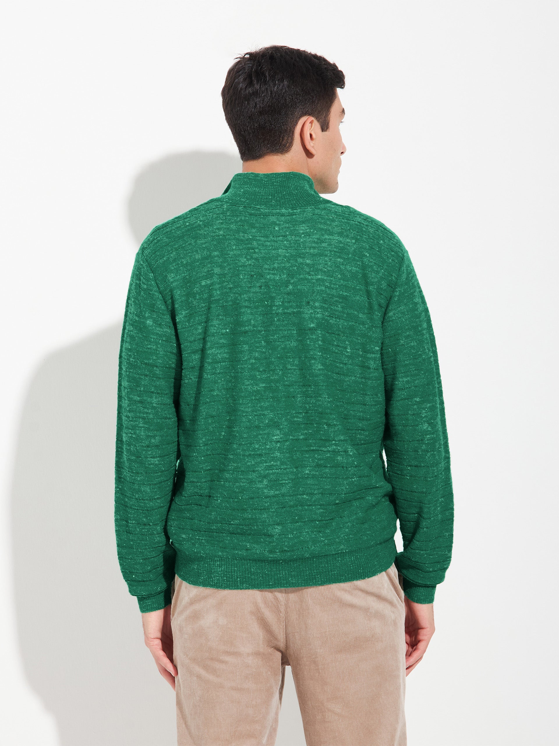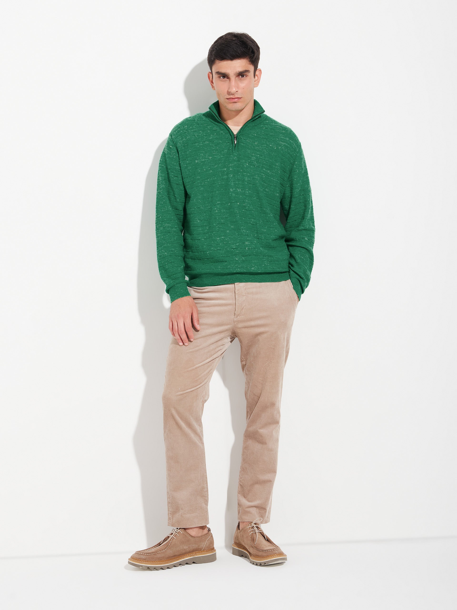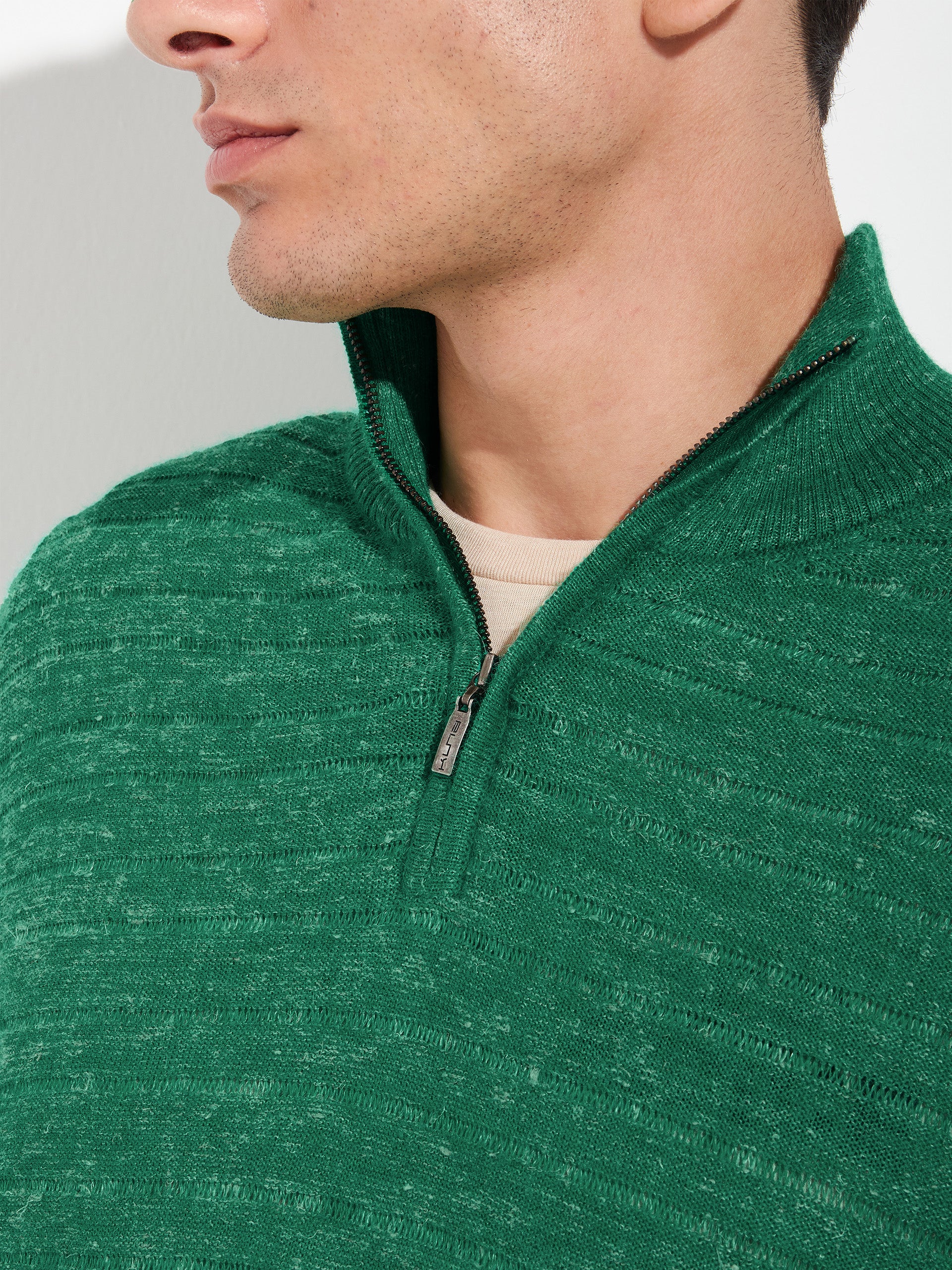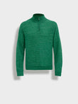 Zamir sweater in green, made from a blend of baby alpaca and linen. It features a troyer collar with closure and structured jersey knit, offering a sophisticated and comfortable texture, ideal for an elegant and modern style. | Predominant material: Baby Alpaca