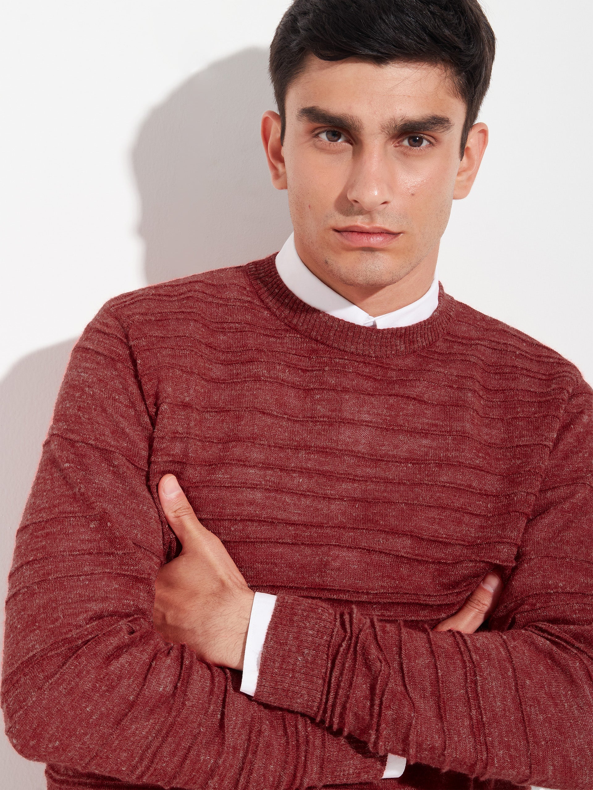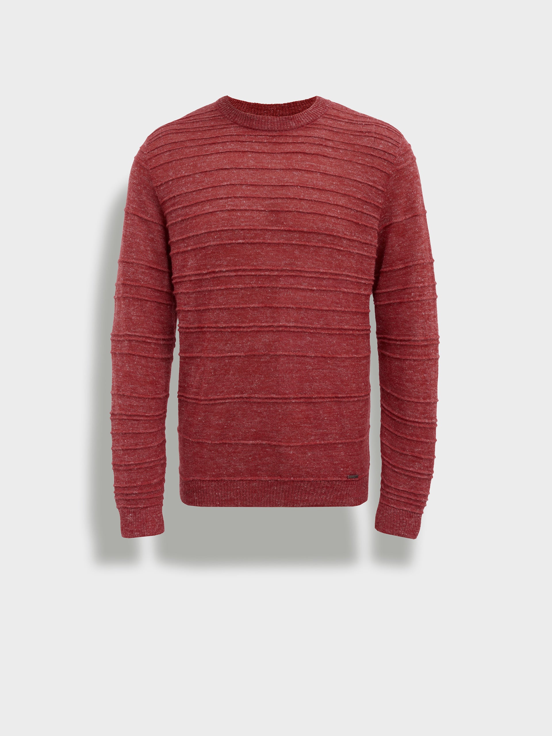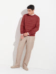 Zidane sweater in red, made from a blend of baby alpaca and linen. It features a round neck and structured jersey knit, providing a defined texture and contemporary style with the characteristic softness of baby alpaca. | Predominant material: Baby Alpaca
