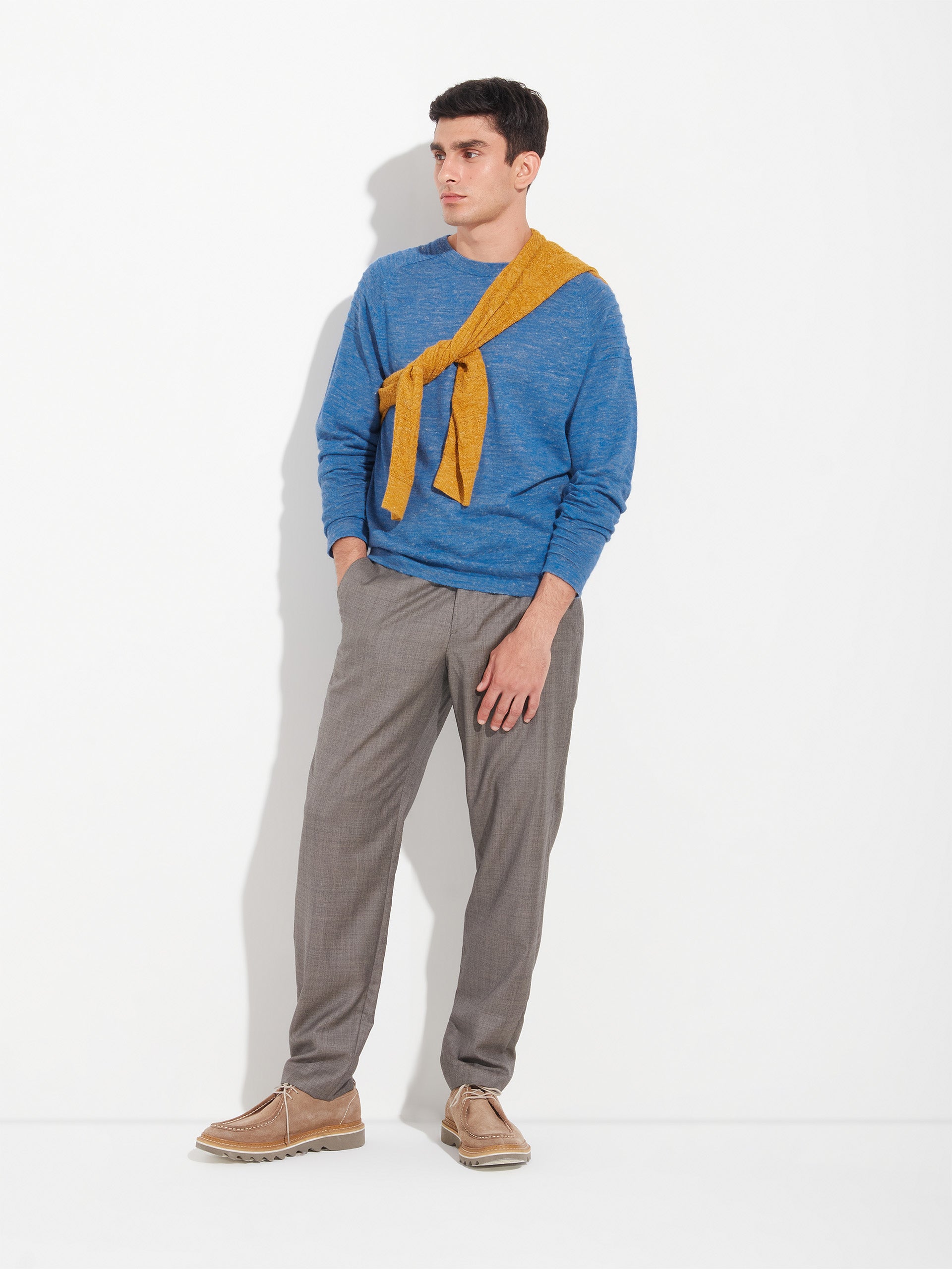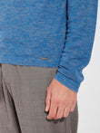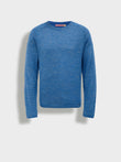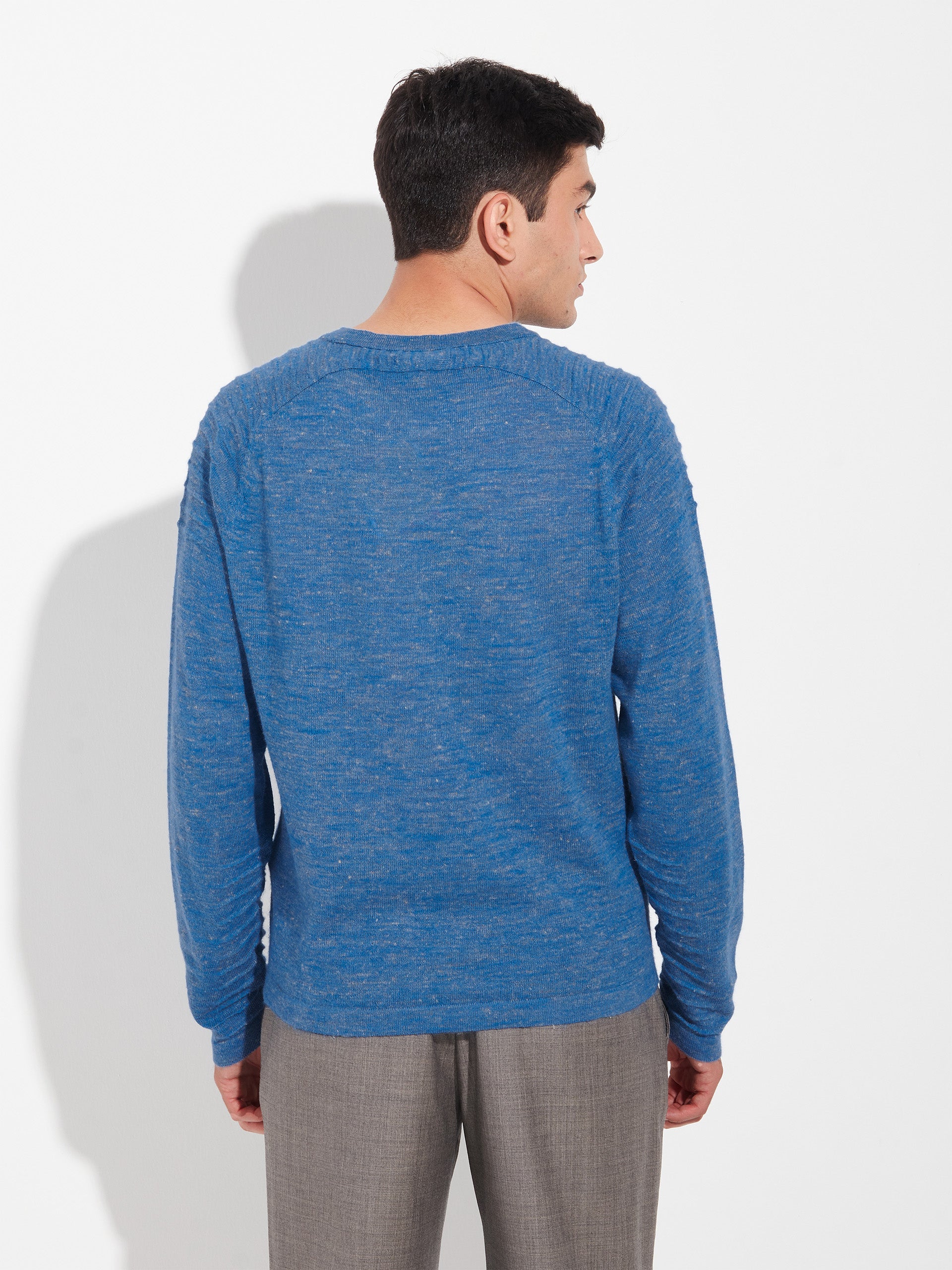 Zwei sweater in blue made from a blend of baby alpaca and linen. It features a round neck in stockinette stitch with delicate structured detailing on the shoulders and sleeves. Its soft, lightweight texture provides comfort and refined style. | Predominant material: Baby Alpaca
