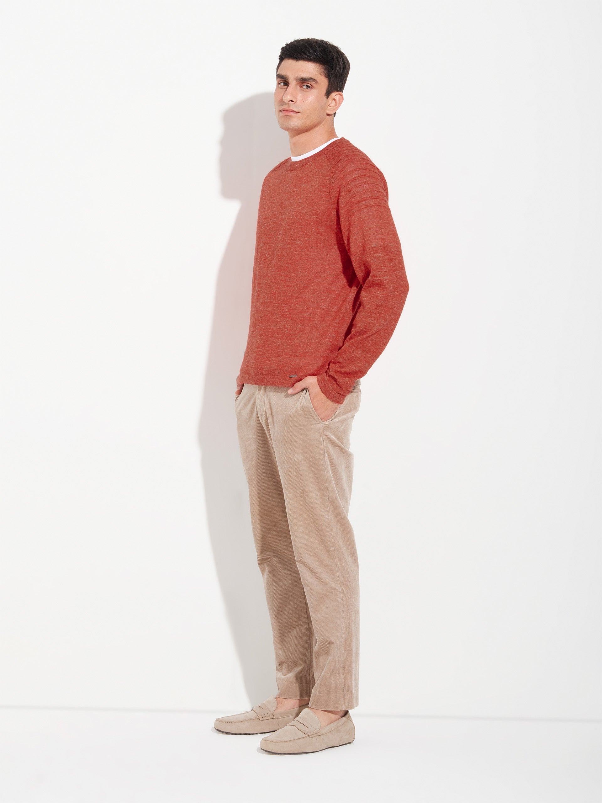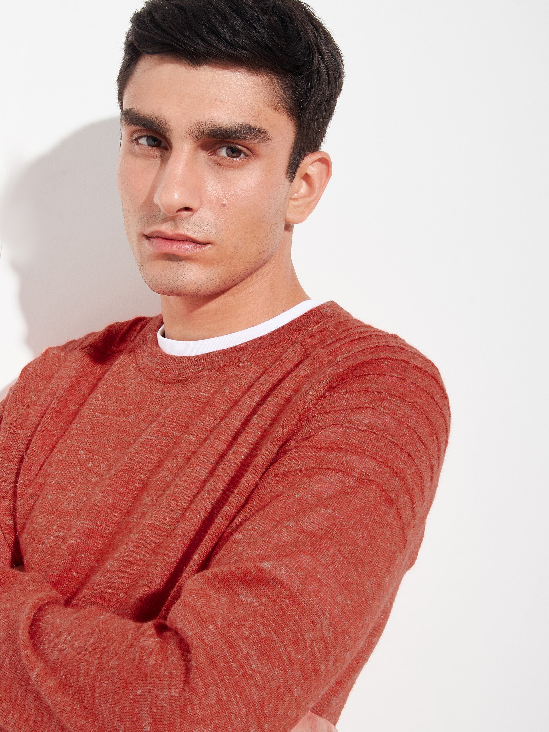 Zwei sweater in orange, made from a blend of baby alpaca and linen. It features a round neck in stockinette stitch with delicate structured detailing on the shoulders and sleeves. Its soft, lightweight texture provides comfort and refined style. | Predominant material: Baby Alpaca