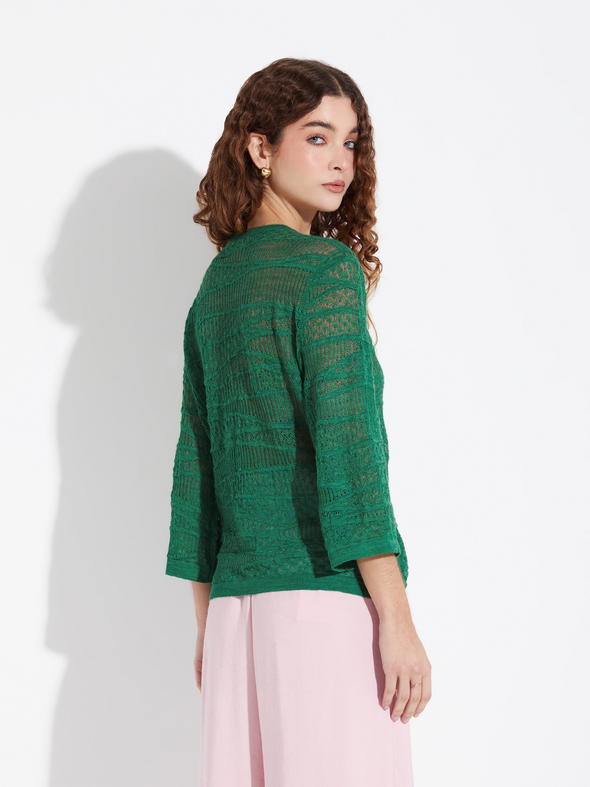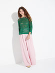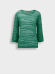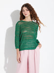 Zample sweater in pink, made from a blend of baby alpaca and silk. It features a round neckline and a delicate design with various pointelle stitches, along with three-quarter sleeves. Its soft texture and refined finish make it a feminine and elegant garment. | Predominant material: Baby Alpaca