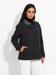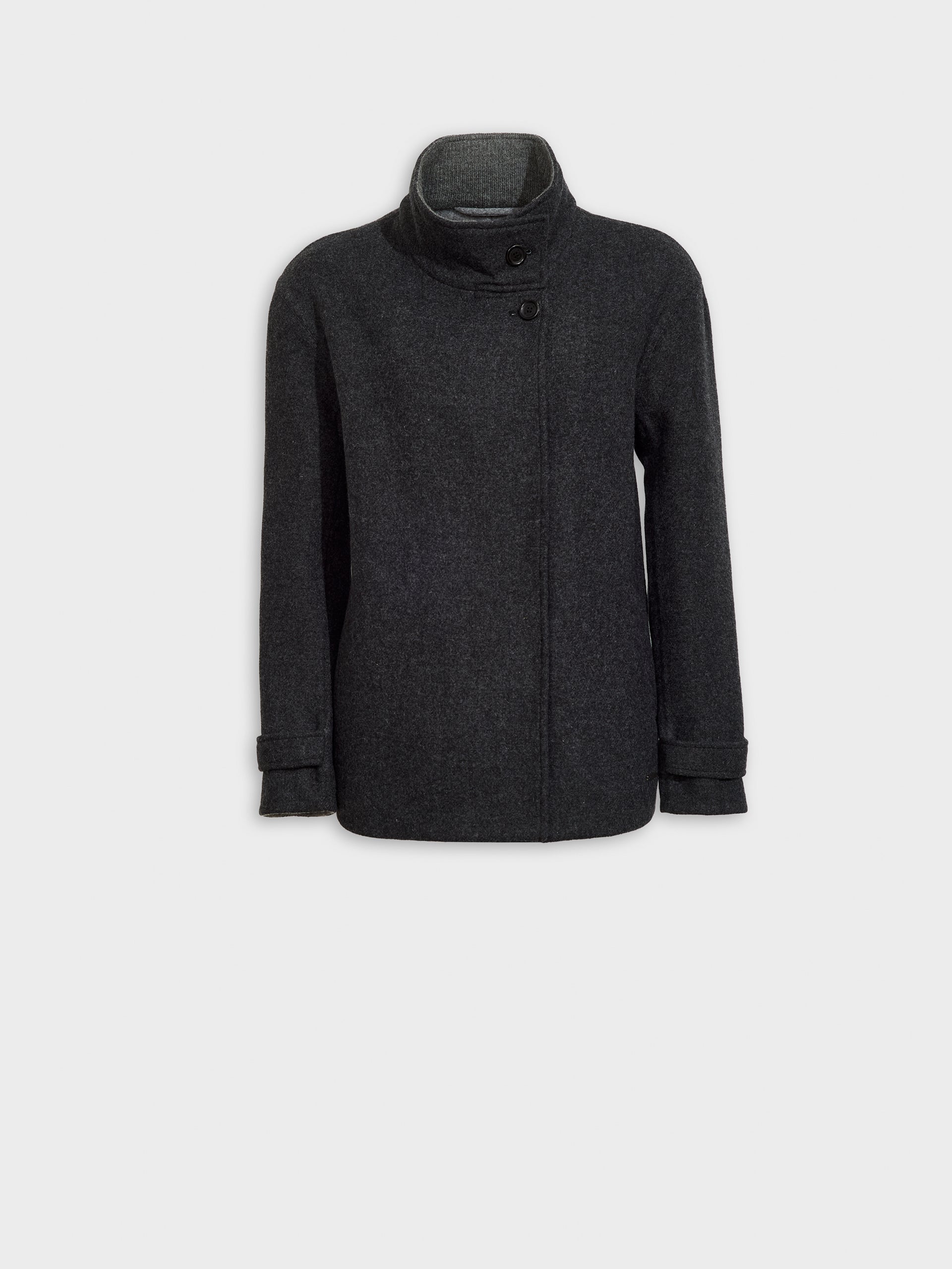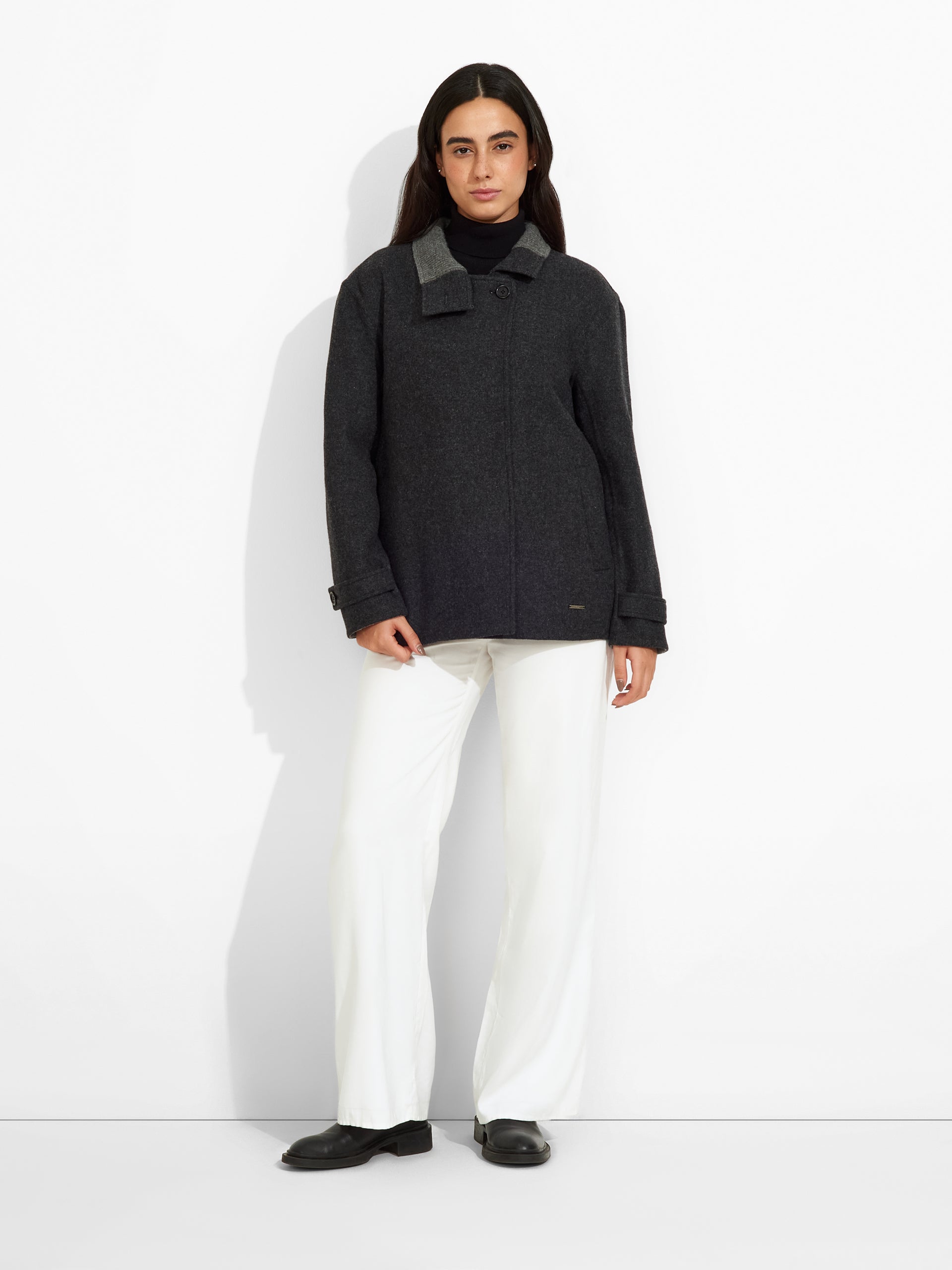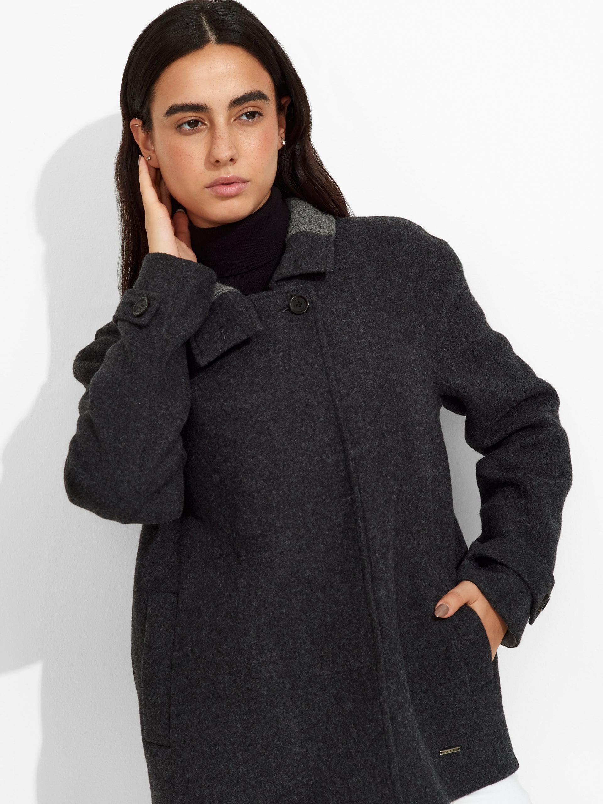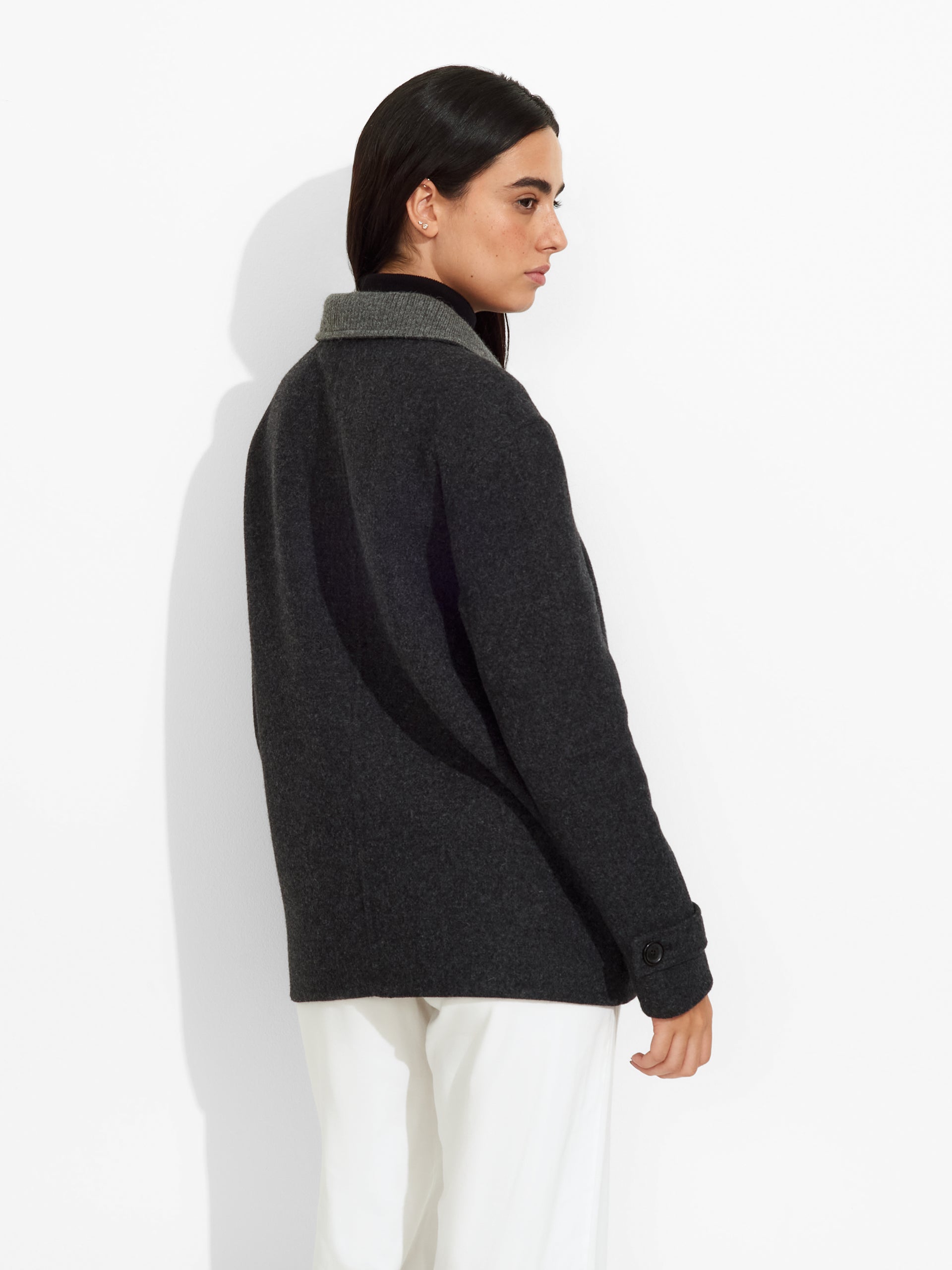 Zazie Coat in grey tone, with an oversized silhouette and unlined construction. Features horn buttons and metal snaps, with a contrasting knit fabric detail on the inside of the collar. Crafted from baby soft alpaca, wool, and nylon. | Predominant material: Baby Alpaca