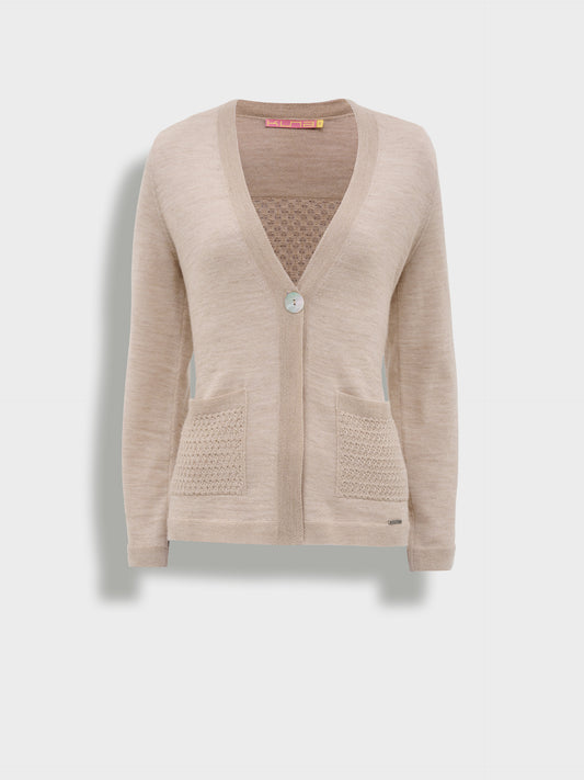Cárdigan Zafiro en tono crudo, confeccionado en punto liso con una silueta fluida y relajada....