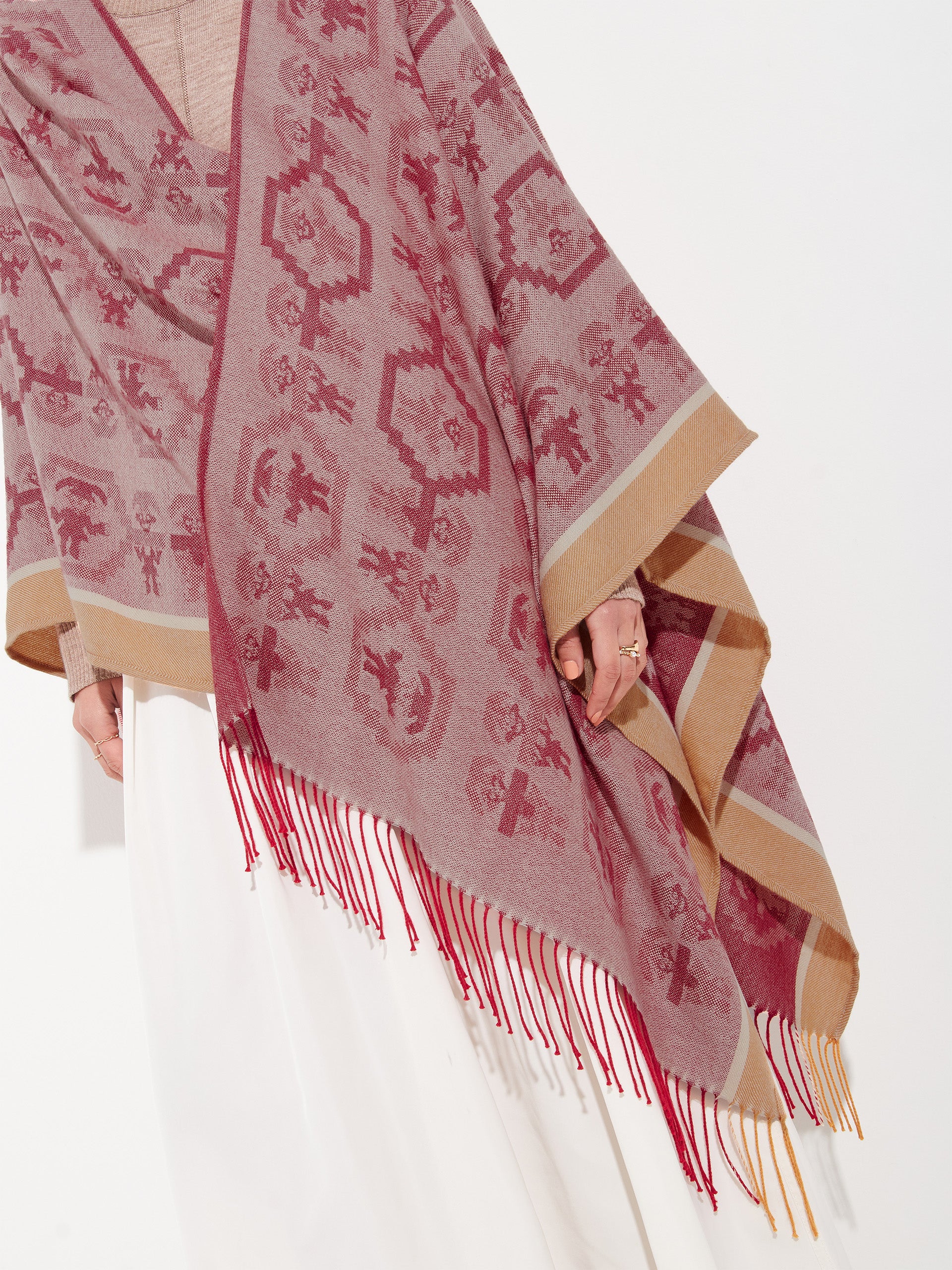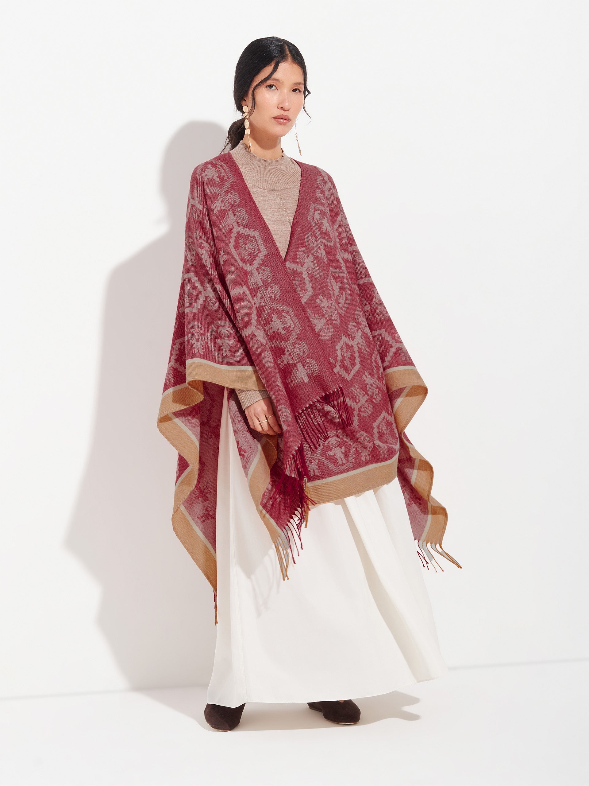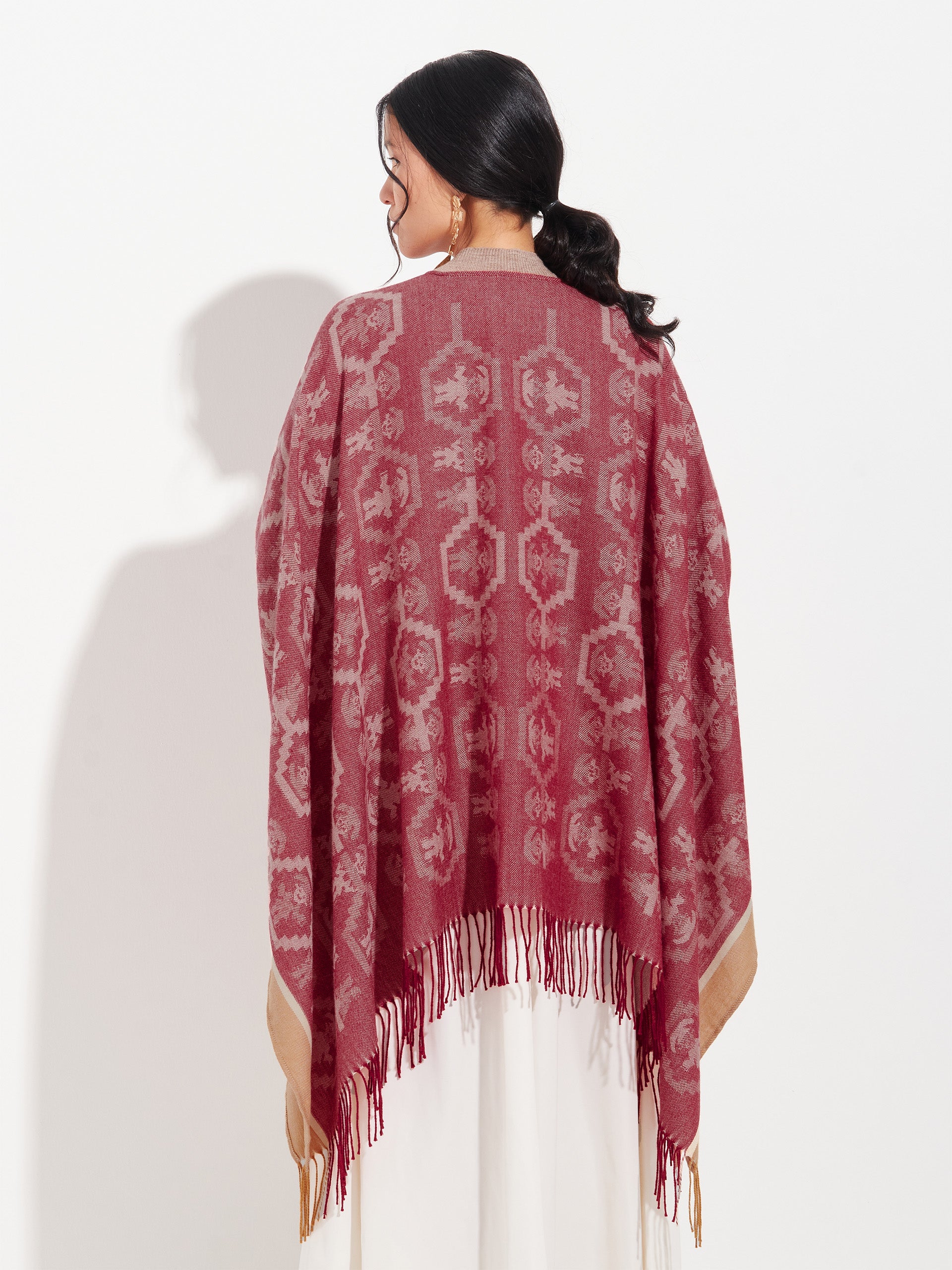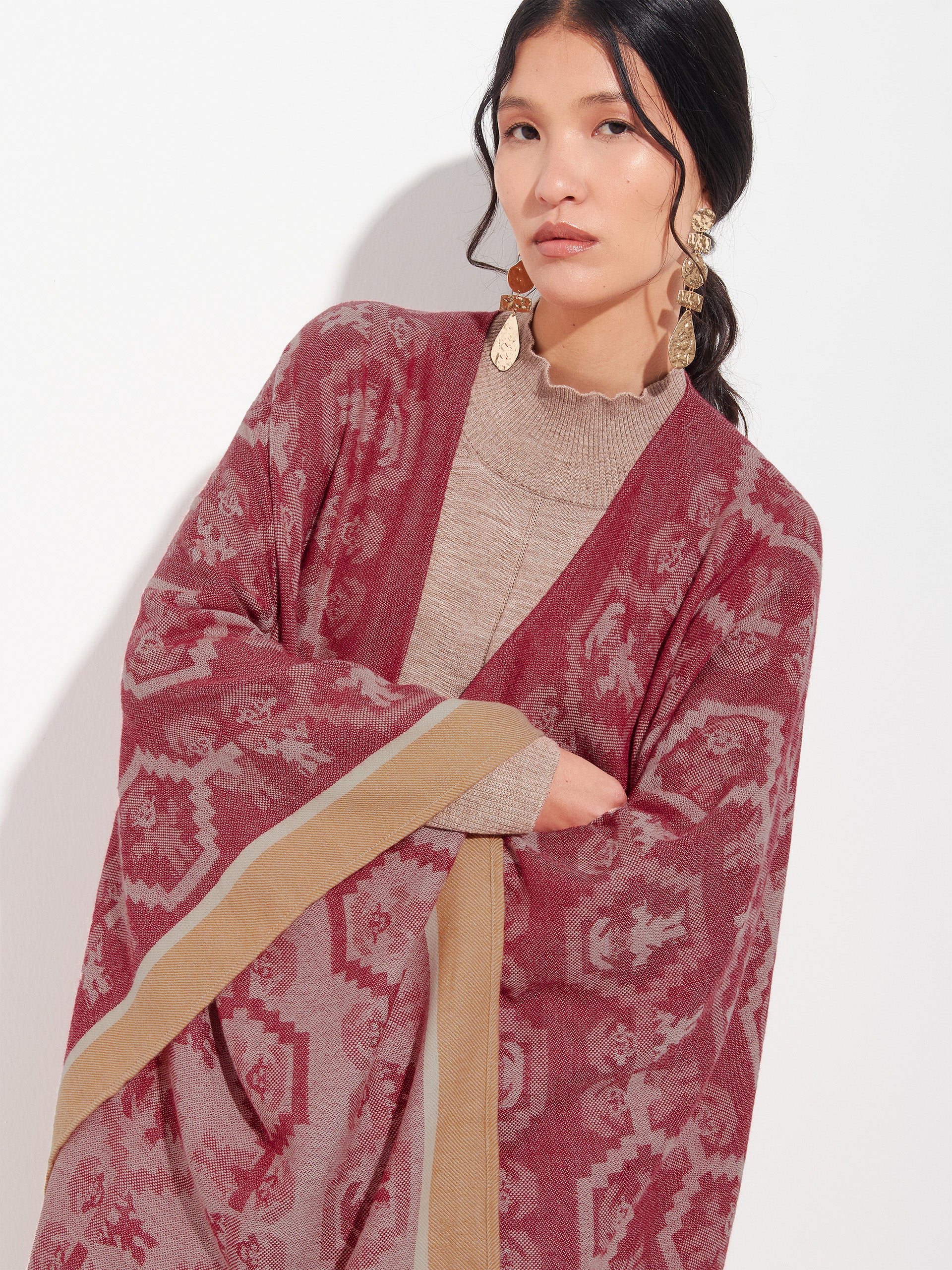 Chimu 12 poncho in red, made from 100% Royal Alpaca using the Jacquard satin technique (single fabric). This reversible garment, inspired by the Chimú culture, reflects the value of ancestral tradition through a design steeped in cultural identity. | Predominant material: Royal Alpaca