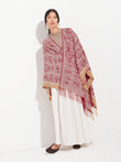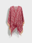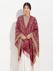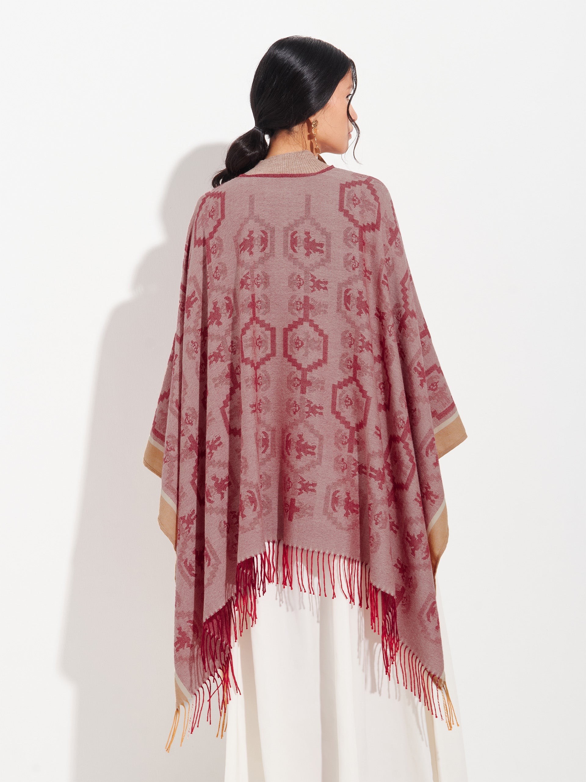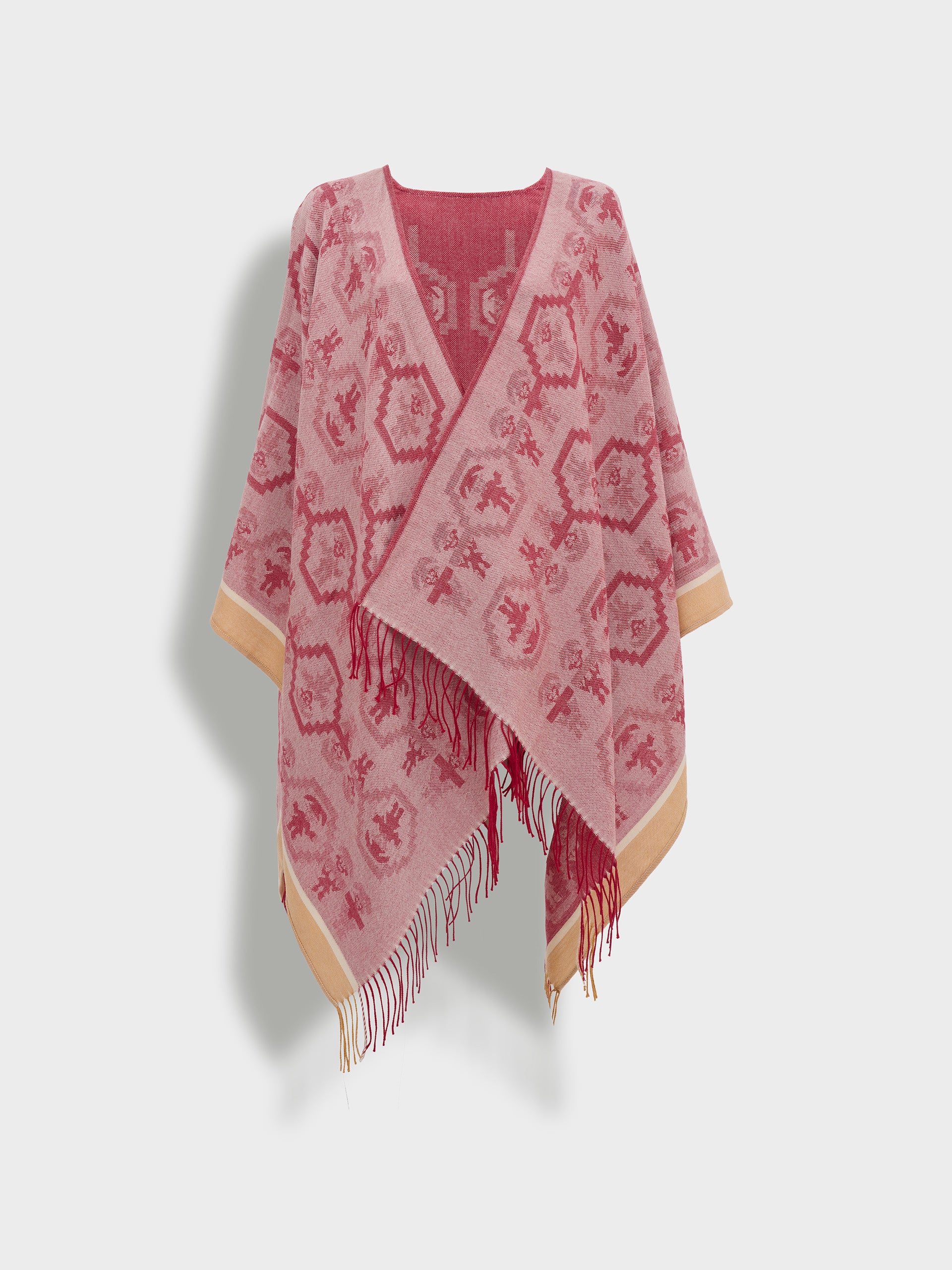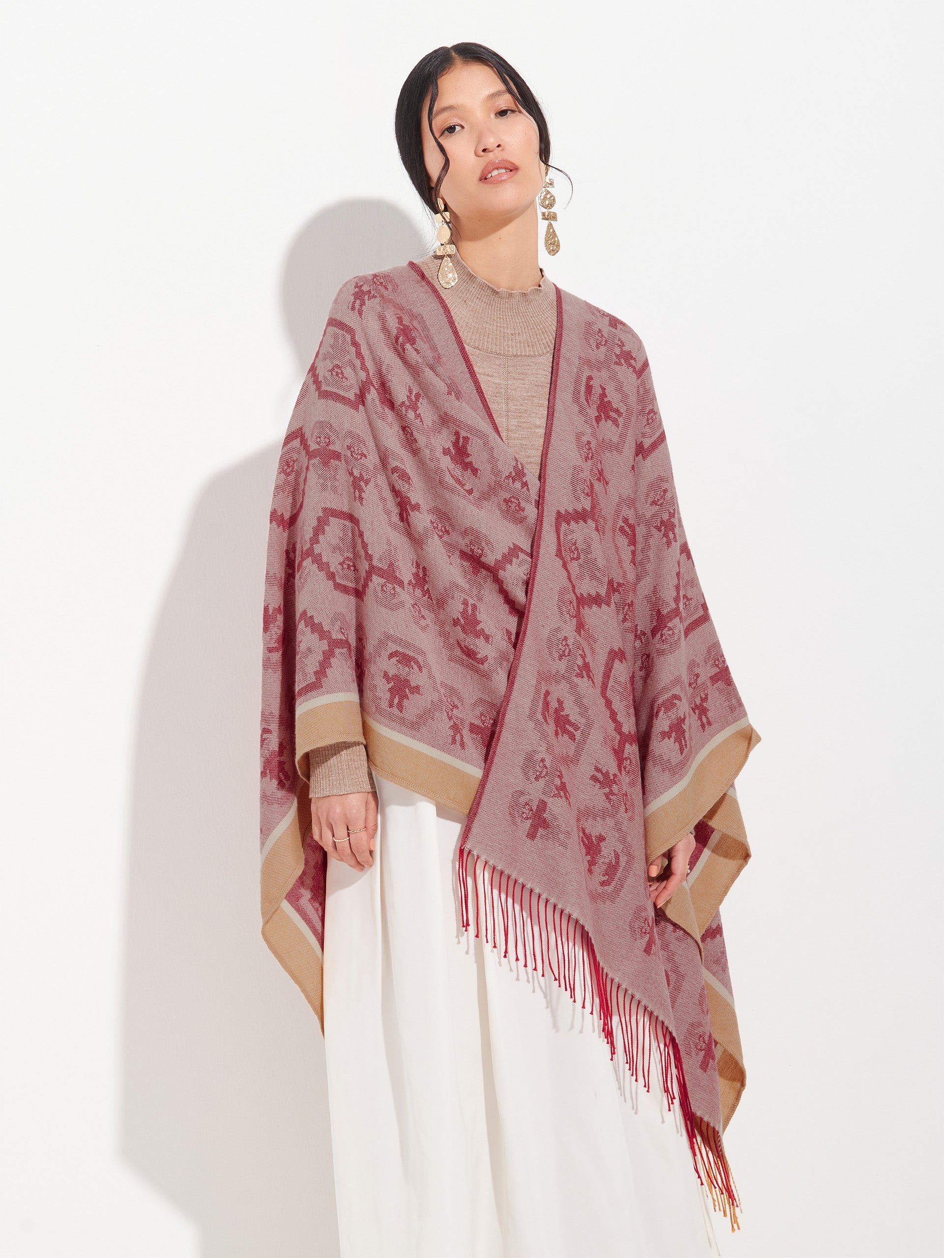 Chimu 12 poncho in red, made from 100% Royal Alpaca using the Jacquard satin technique (single fabric). This reversible garment, inspired by the Chimú culture, reflects the value of ancestral tradition through a design steeped in cultural identity. | Predominant material: Royal Alpaca