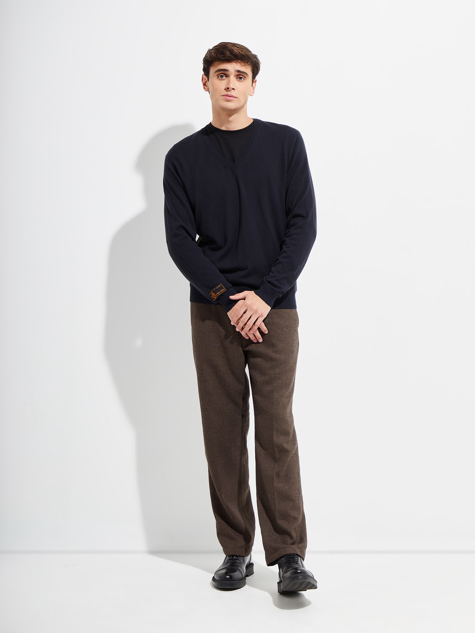 Suéter exclusivo de cuello en V elaborado en vicuña, la fibra natural más fina y excéntrica del mundo. Una interpretación superior de un clásico del vestuario masculino. Nuestro suéter Brian es cálido, ligero y ultra suave. Una prenda dedicada a los clientes que aprecian un material verdaderamente único.
