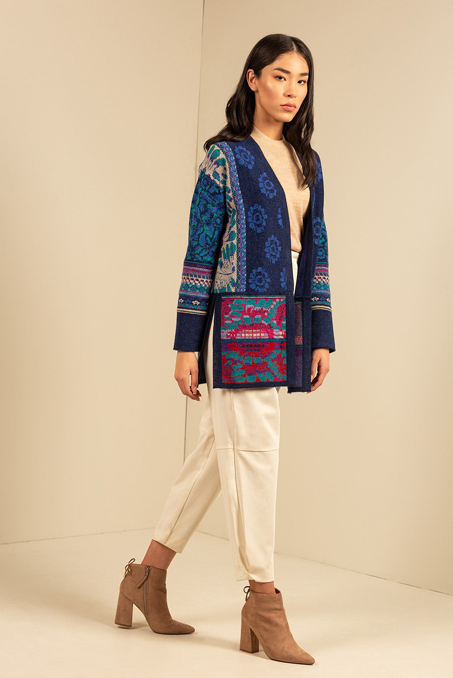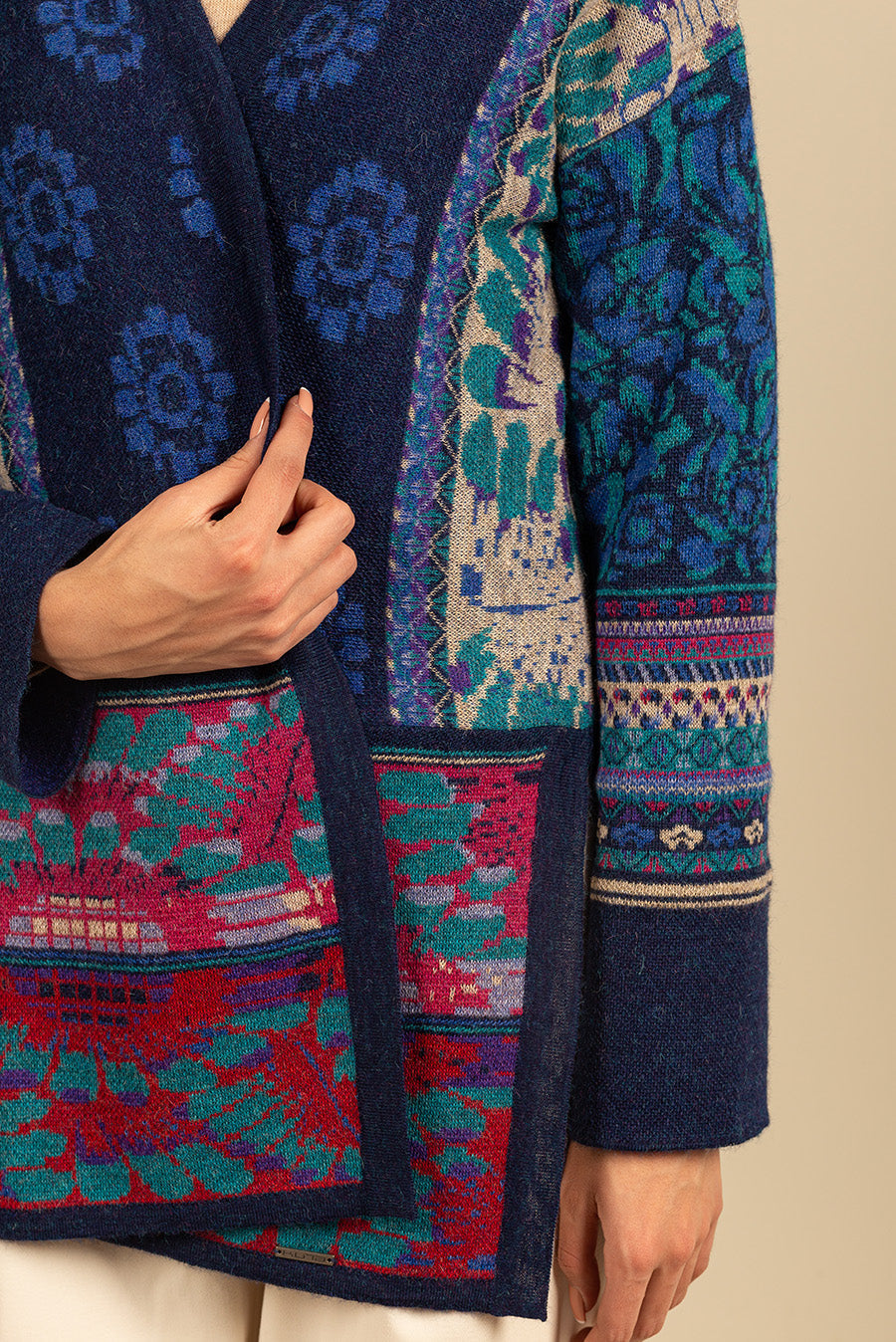 Los suaves hilos de alpaca bebé de este cárdigan jacquard colorido lo convierten en la prenda perfecta para cualquier ocasión. Tiene aberturas en los laterales que le dan un aspecto único. Está disponible en dos combinaciones de colores vivos.
