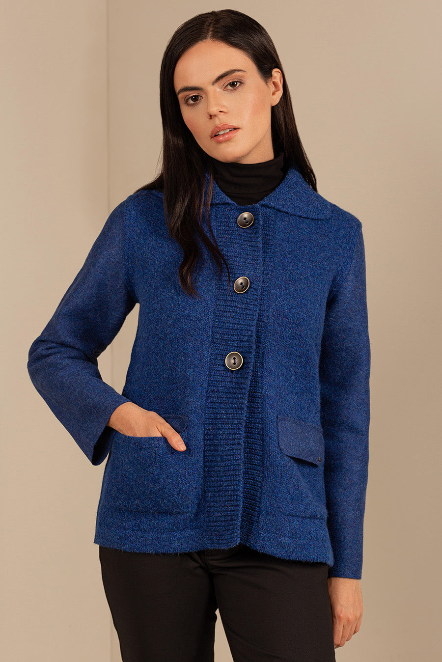 Un cárdigan con personalidad de saco, combinamos tejido de punto con nuestro tejido de fieltro para realizar esta atractiva prenda. Tiene cuello de punto, corte recto, además los grandes botones metálicos para cerrarlo le aportan un toque de singularidad y atractivo visual.