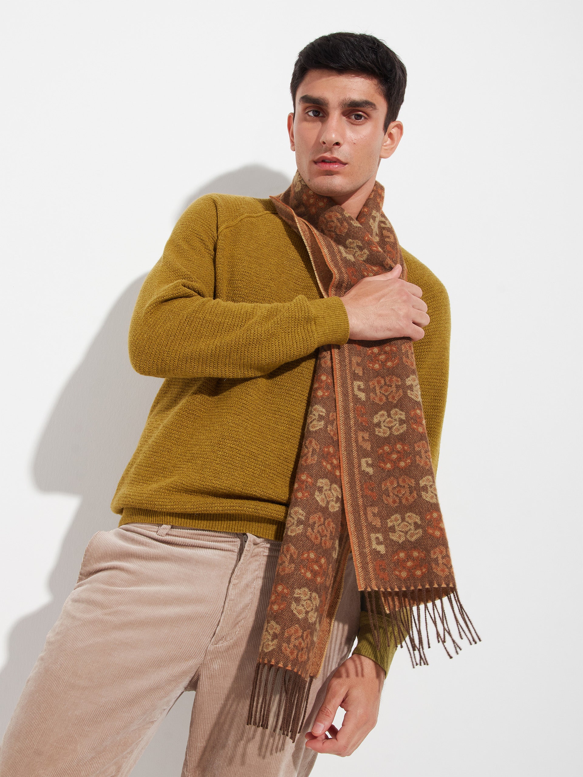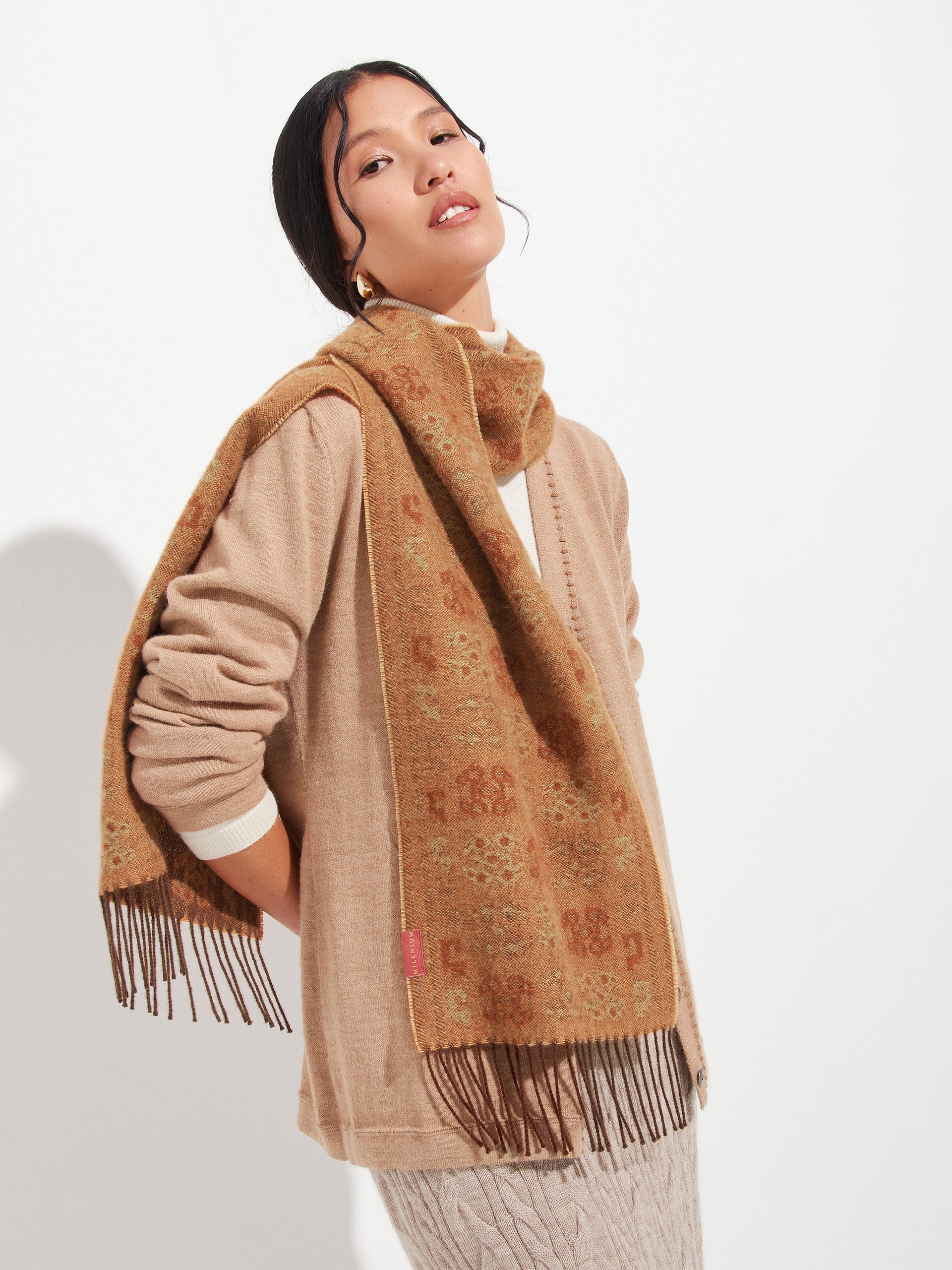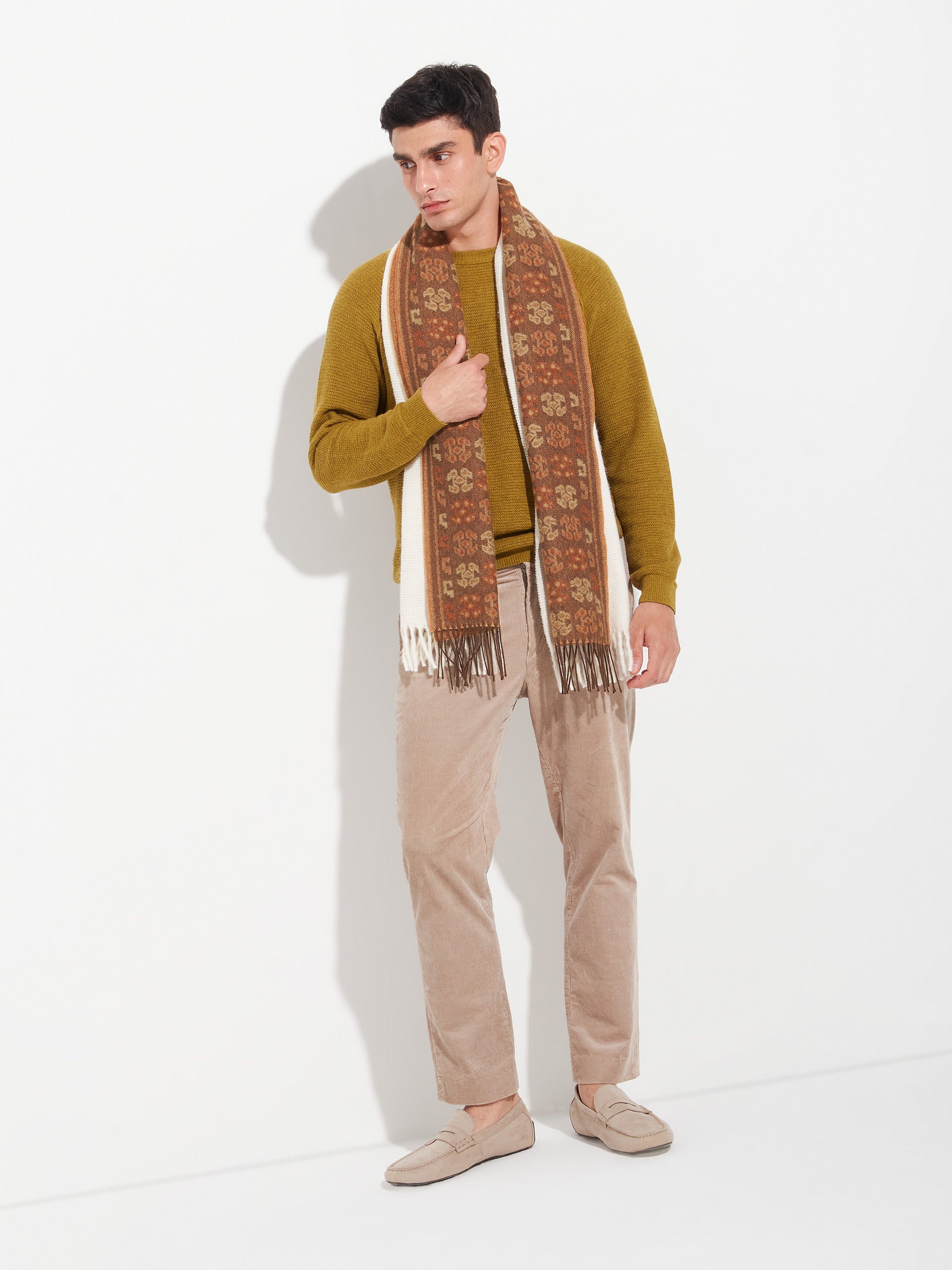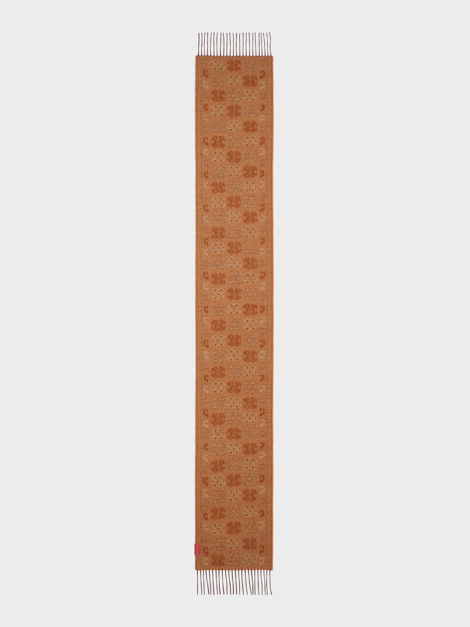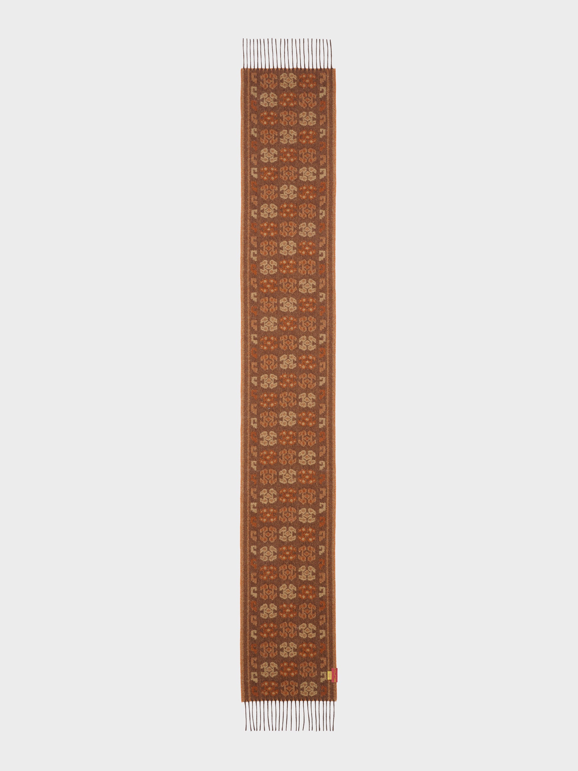 Chancay 36 scarf in brown, made from 100% baby alpaca using a double-sided Jacquard technique. Measuring 180/164 x 25 cm, it is inspired by the Chancay culture. A unisex accessory that connects with ancestral memory through an authentically cultural design. | Predominant material: Baby Alpaca