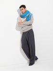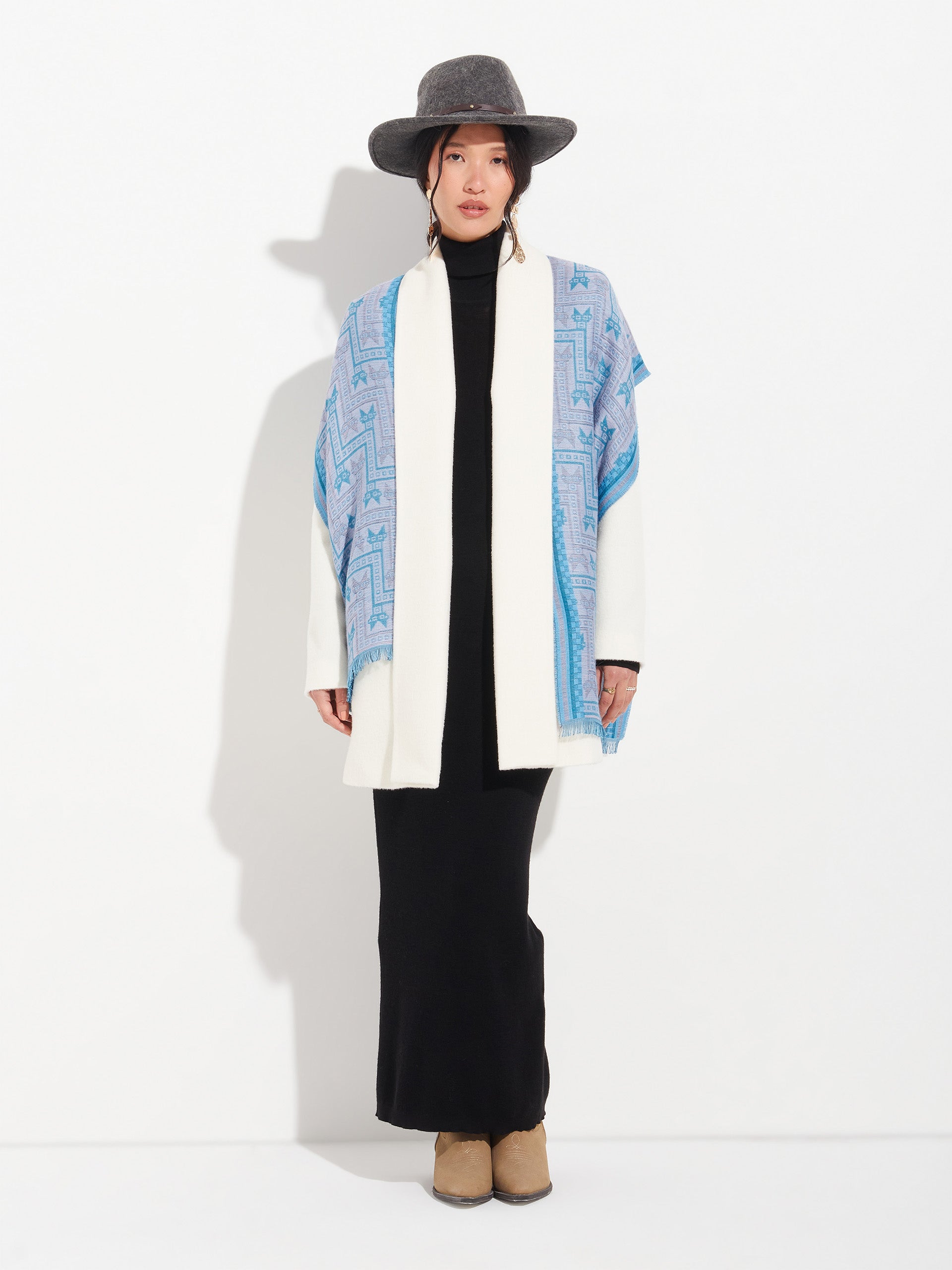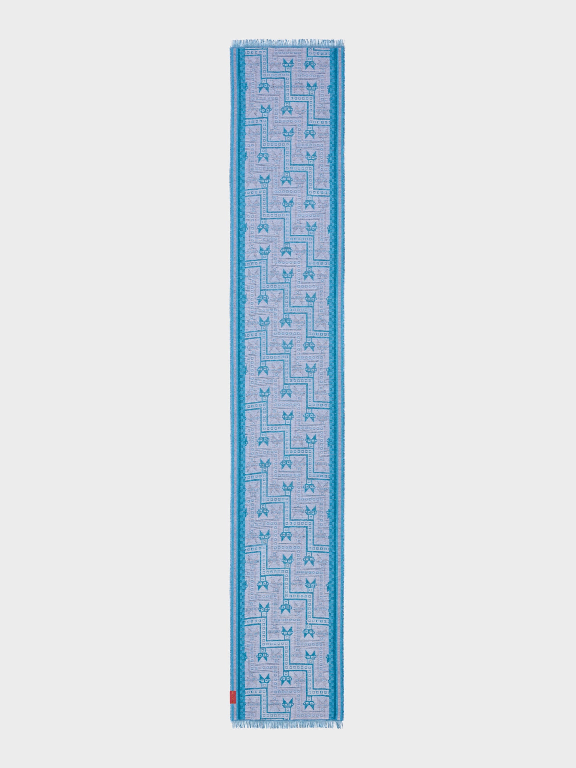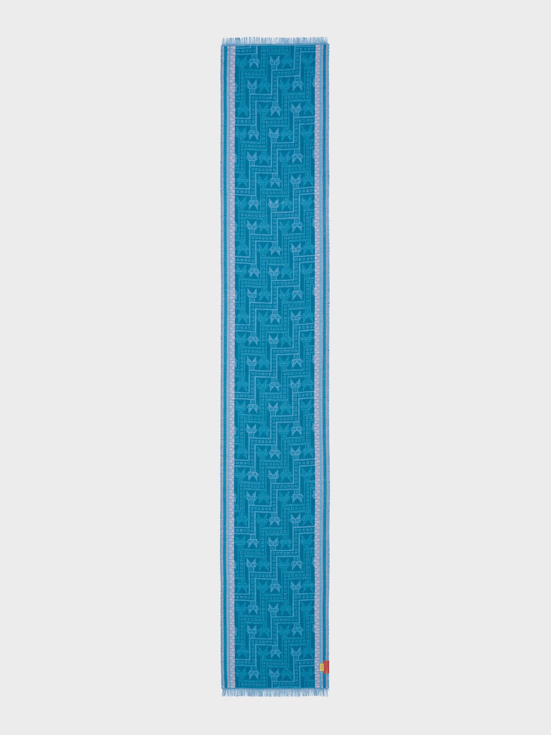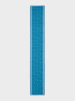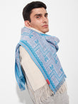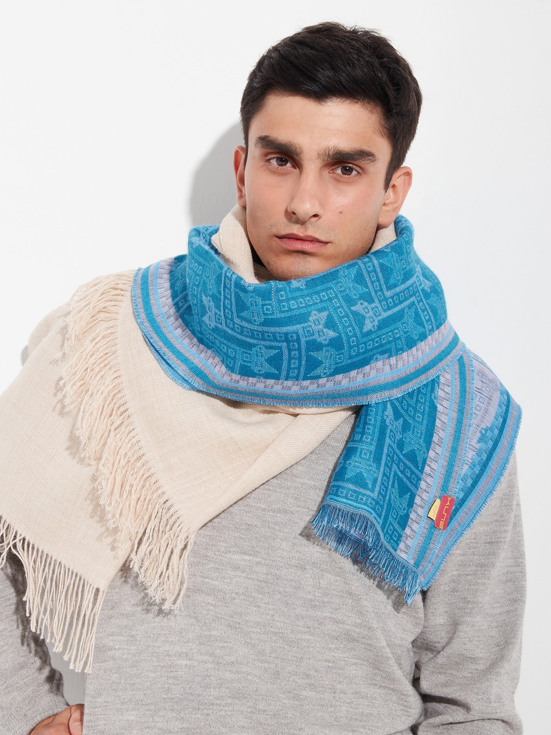 Chancay 39 scarf in blue, made from 70% baby alpaca and 30% silk, using a double-weave Jacquard technique with hidden weft insertion. Measuring 180/176 x 30 cm, it is a unisex and reversible accessory, inspired by the Chancay culture, which evokes the richness of ancient traditions through a design with cultural identity. | Predominant material: Baby Alpaca