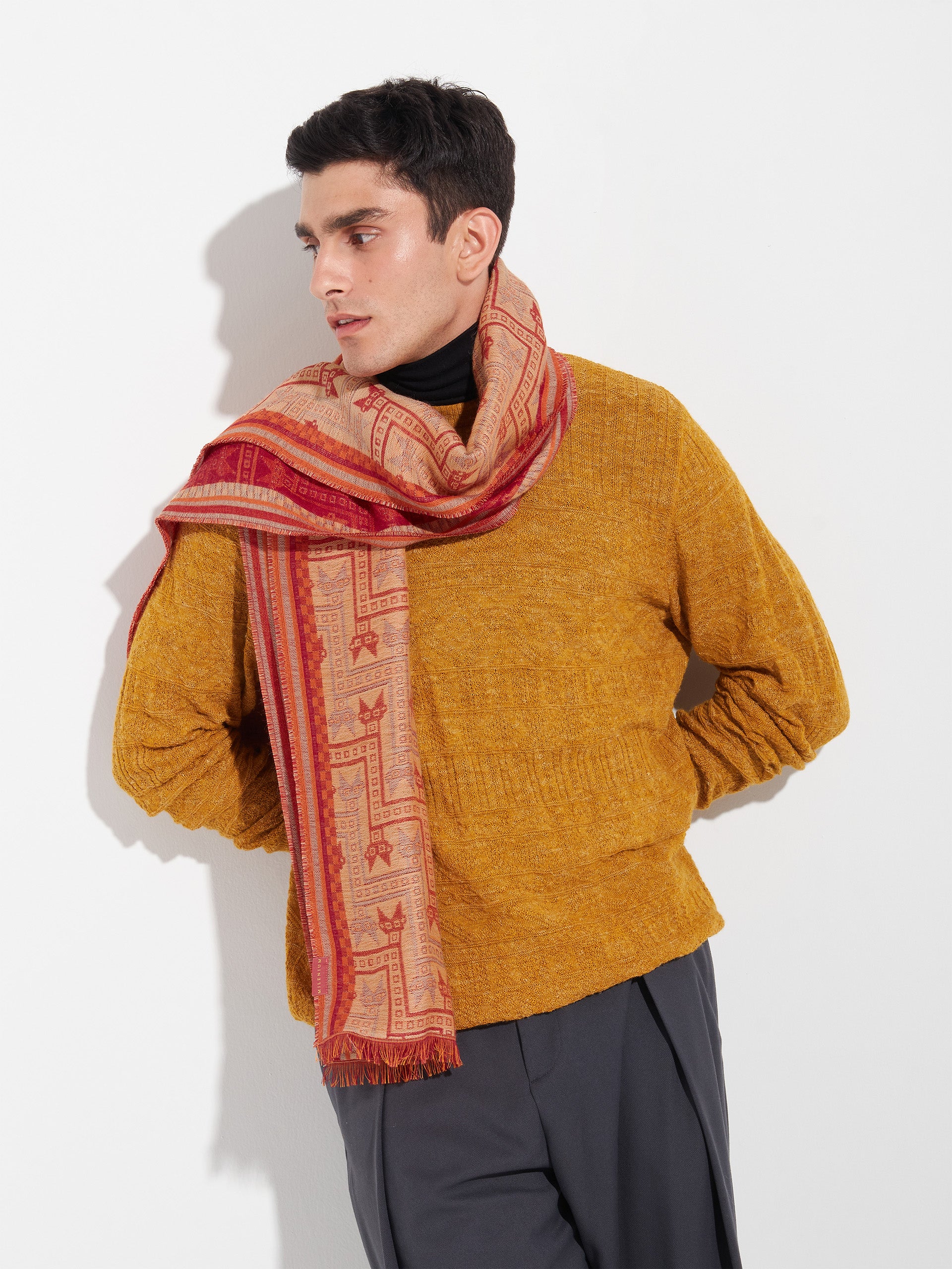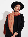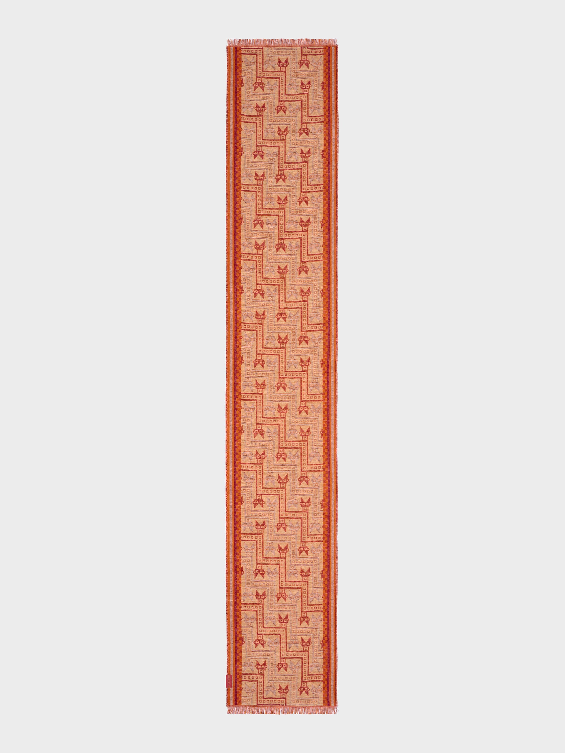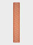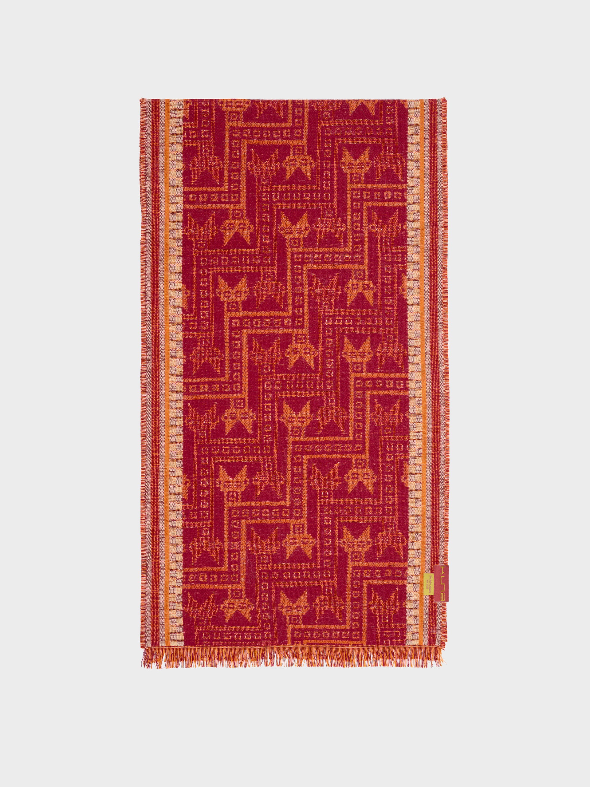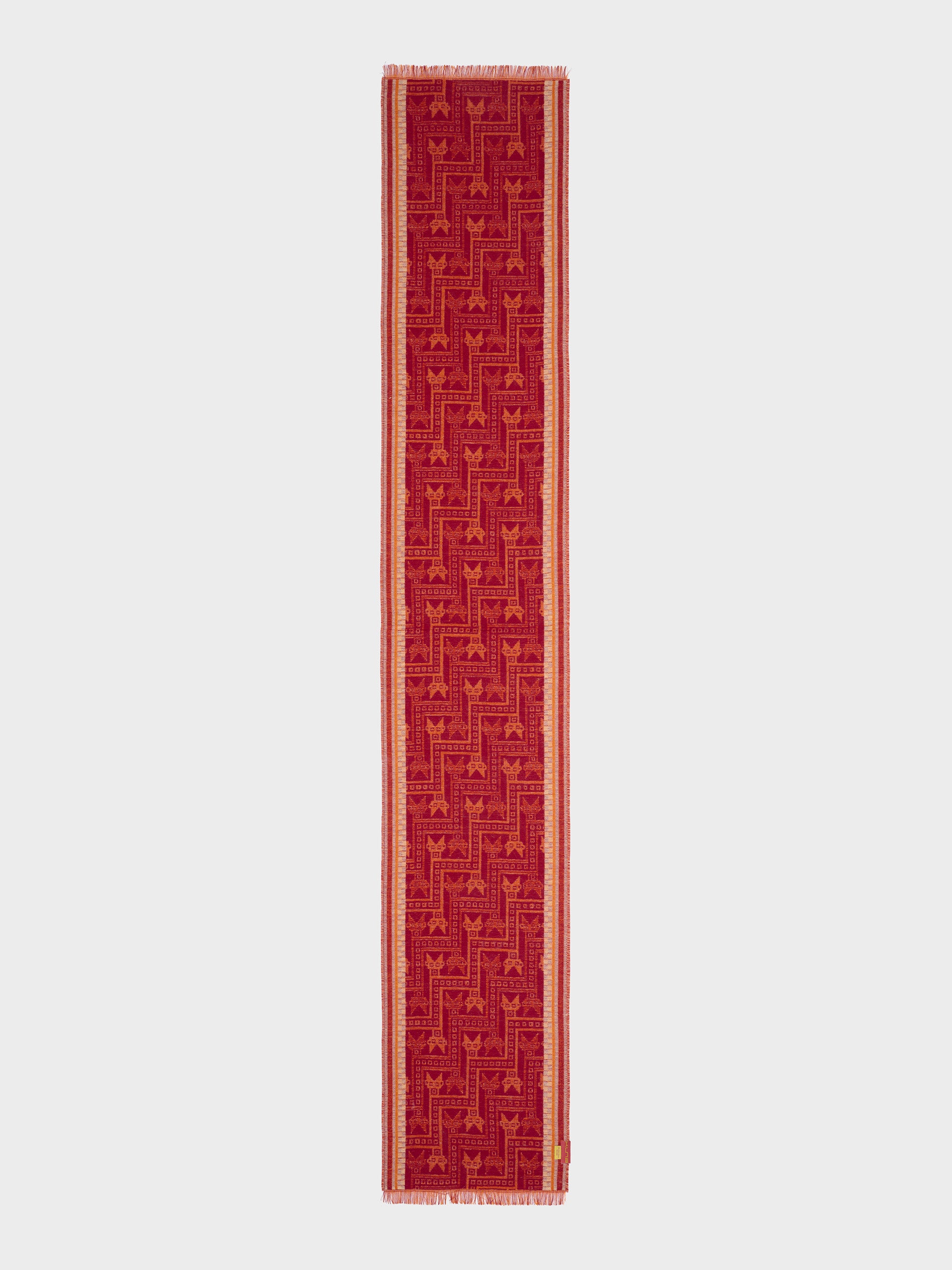 Chancay 39 scarf in red, made from 70% baby alpaca and 30% silk, using a double-weave Jacquard technique with hidden weft insertion. Measuring 180/176 x 30 cm, it is a unisex and reversible accessory, inspired by the Chancay culture, which evokes the richness of ancient traditions through a design with cultural identity. | Predominant material: Baby Alpaca