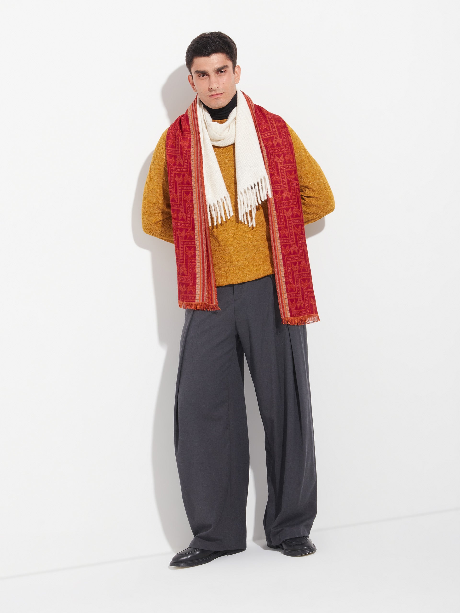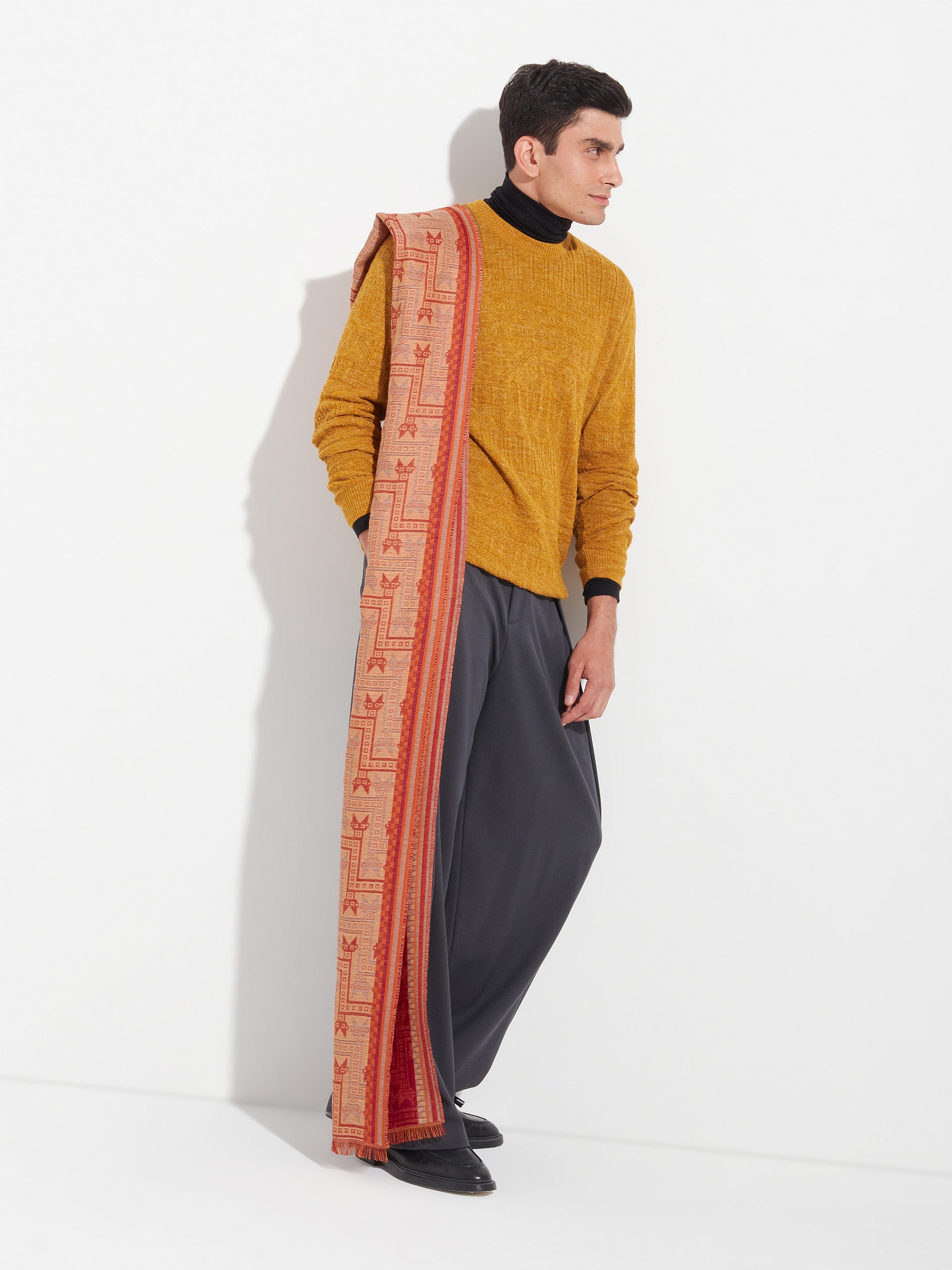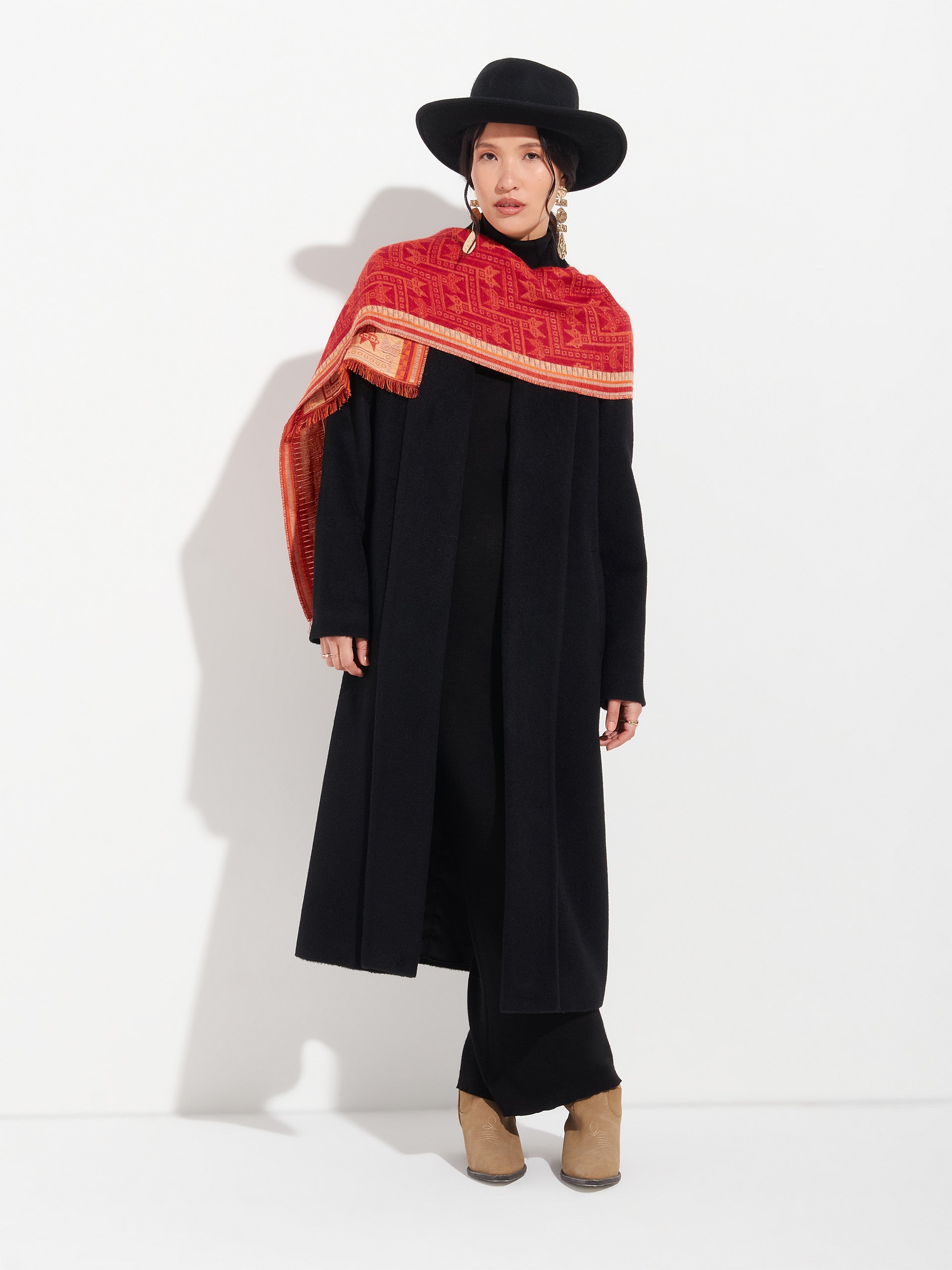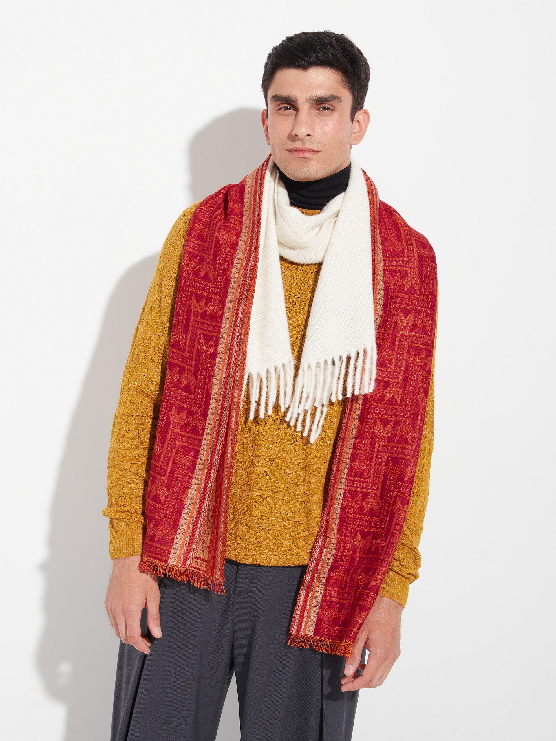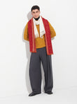Chancay 39 scarf in red, made from 70% baby alpaca and 30% silk, using a double-weave Jacquard technique with hidden weft insertion. Measuring 180/176 x 30 cm, it is a unisex and reversible accessory, inspired by the Chancay culture, which evokes the richness of ancient traditions through a design with cultural identity. | Predominant material: Baby Alpaca