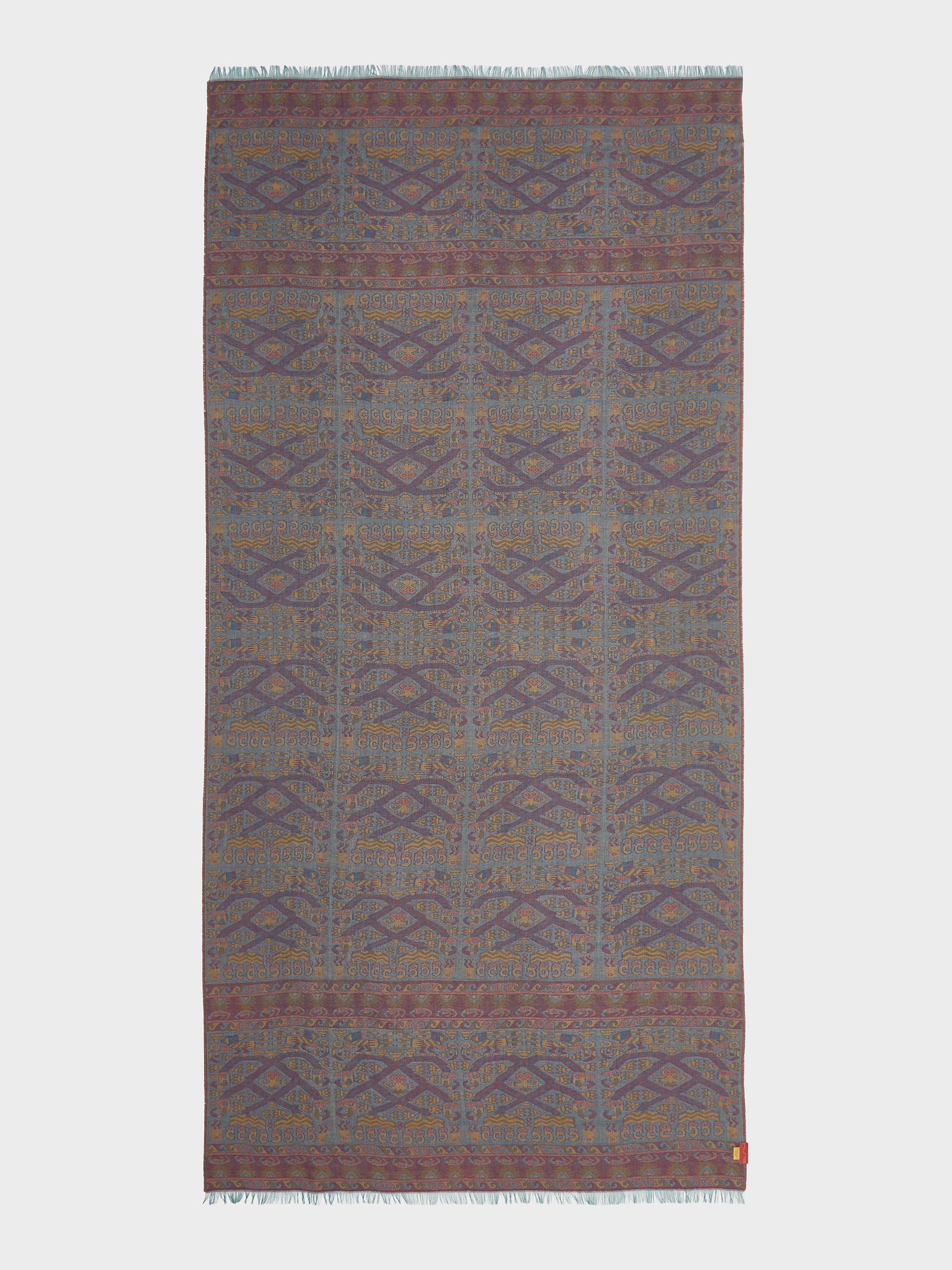Lambayeque 8 stole in blue, made from 50% Royal alpaca and 50% silk, using the Jacquard technique on double fabric with hidden weft insertion. Measuring 200/196 x 93 cm, it is a reversible garment inspired by the Lambayeque culture, keeping the ancestral tradition alive in a design that represents cultural identity. | Predominant material: Royal Alpaca And Silk