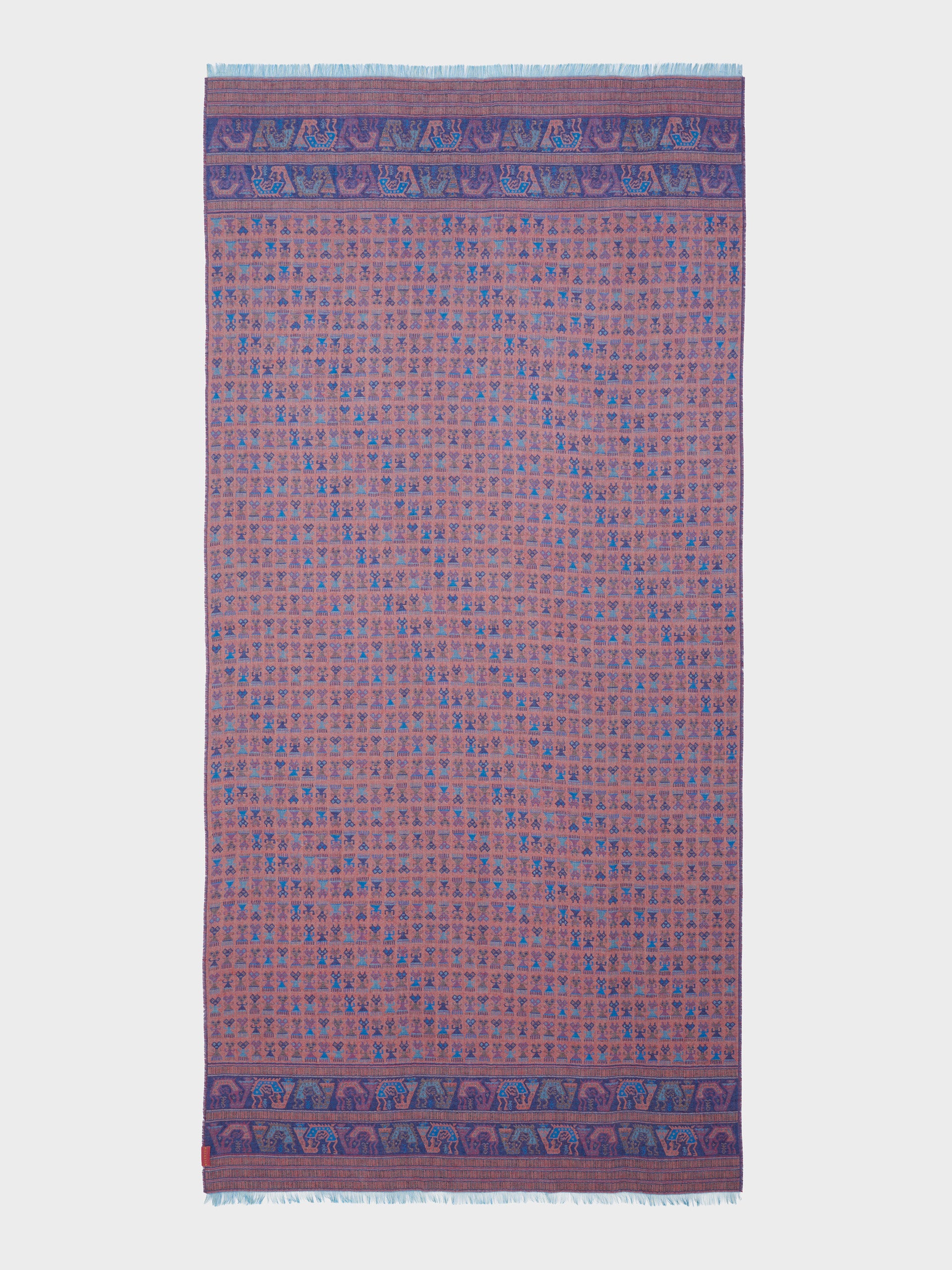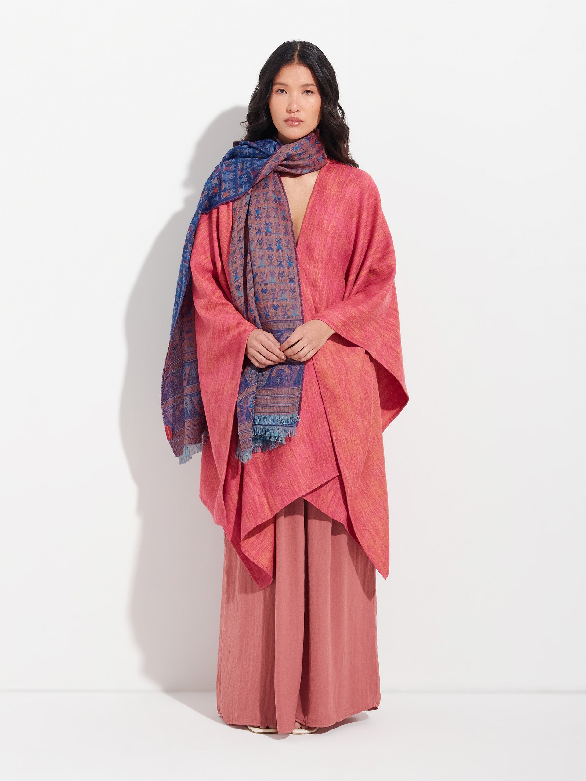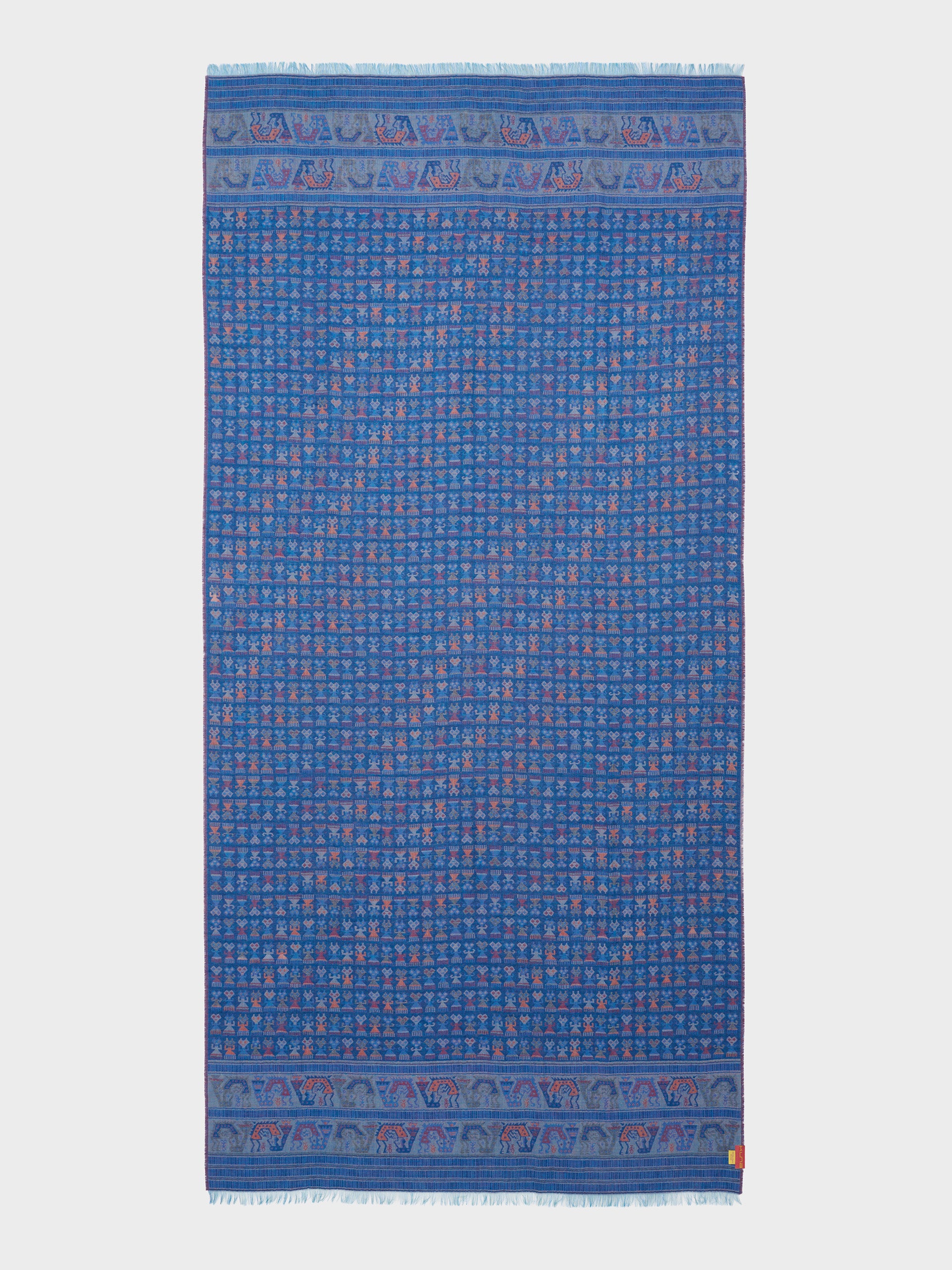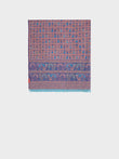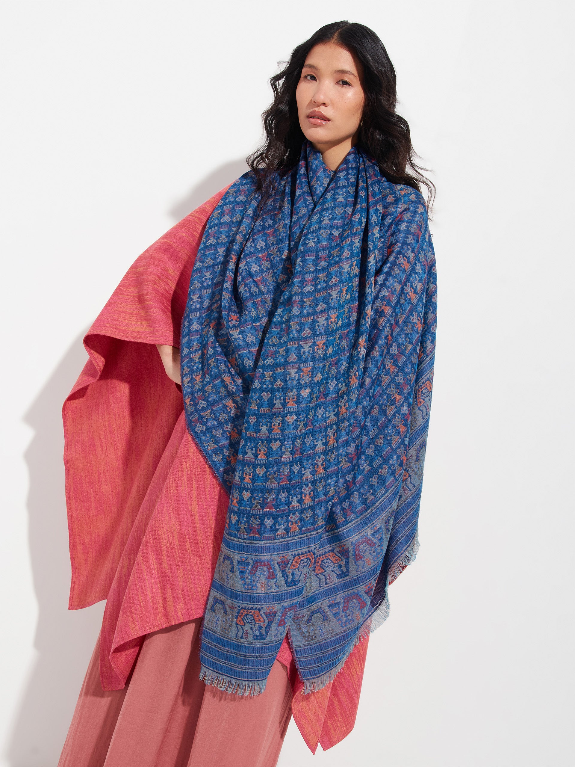 Lambayeque 9 stole in blue, made from 50% Royal alpaca and 50% silk, using the Jacquard technique on double fabric with hidden weft insertion. Measuring 200/196 x 93 cm, it is a reversible garment inspired by the Lambayeque culture, which reinterprets ancestral tradition through a design with cultural essence. | Predominant material: Royal Alpaca And Silk