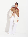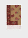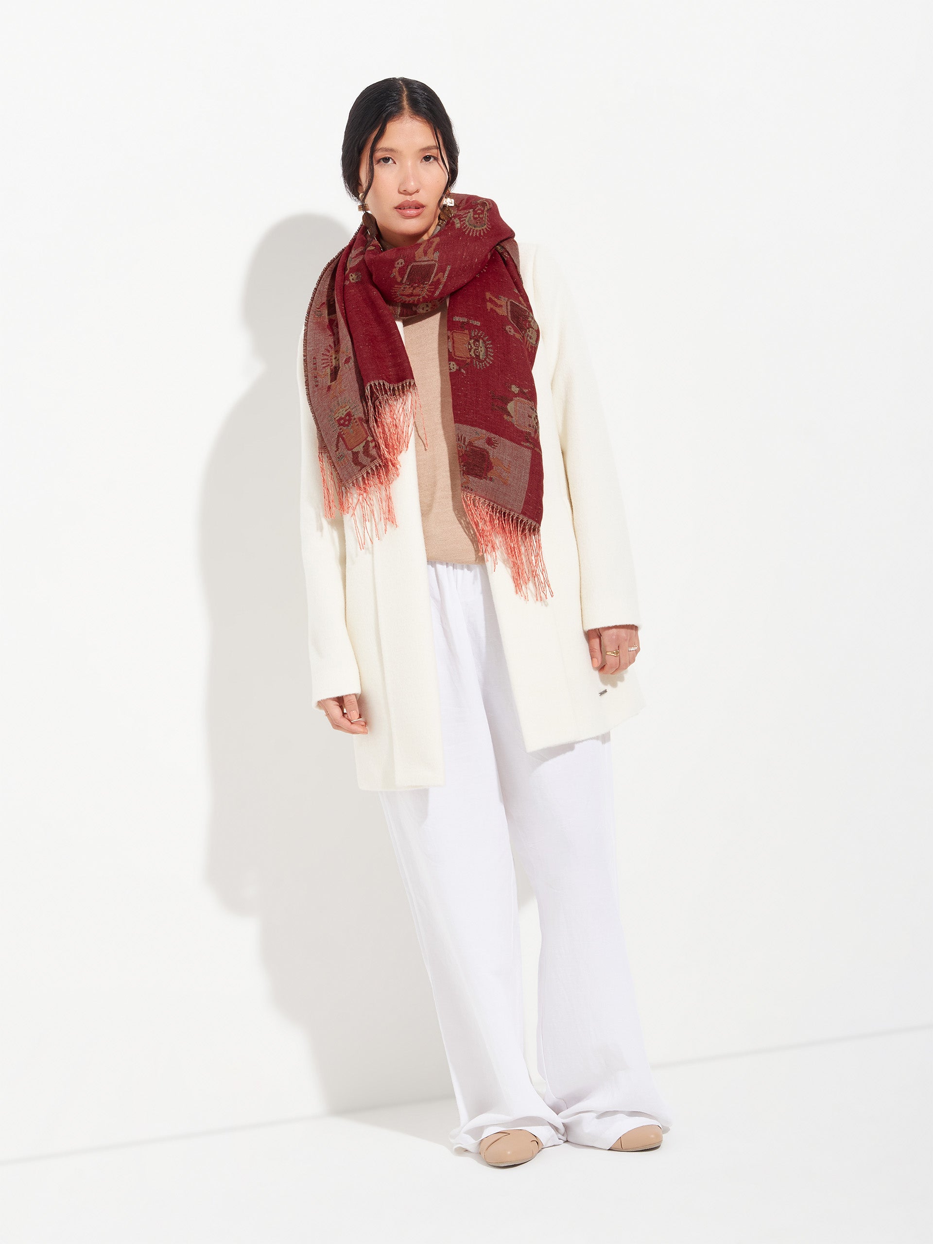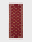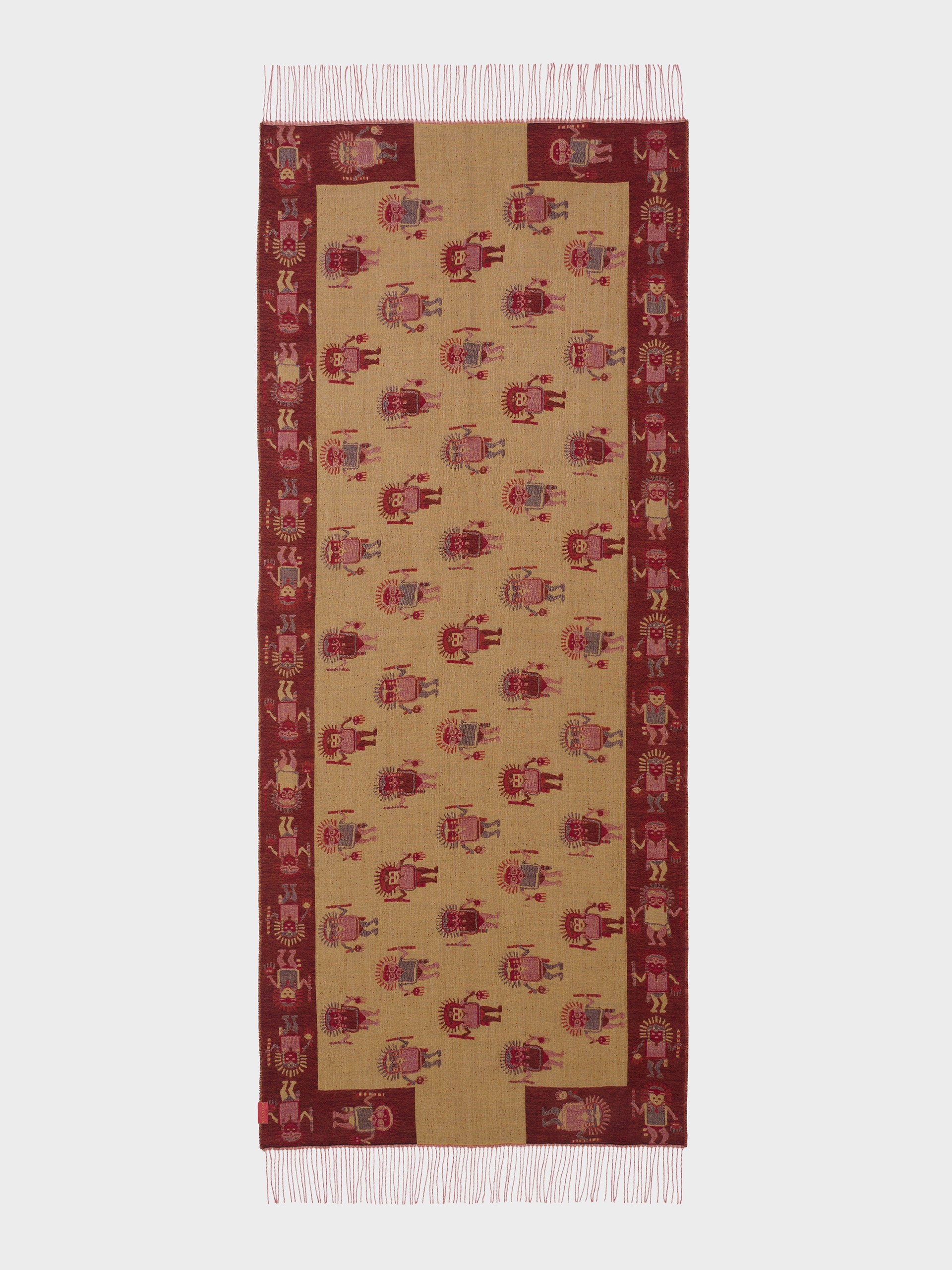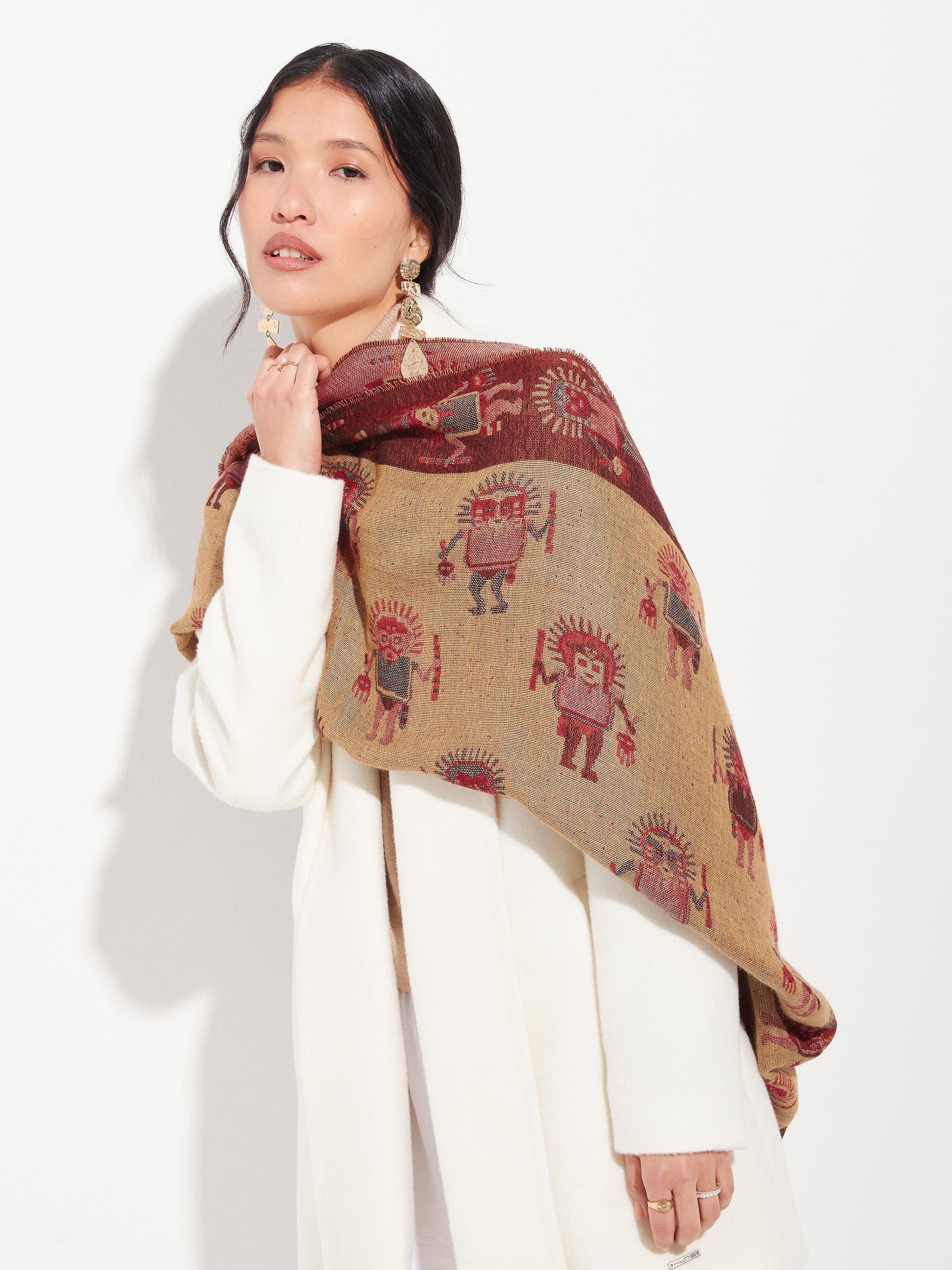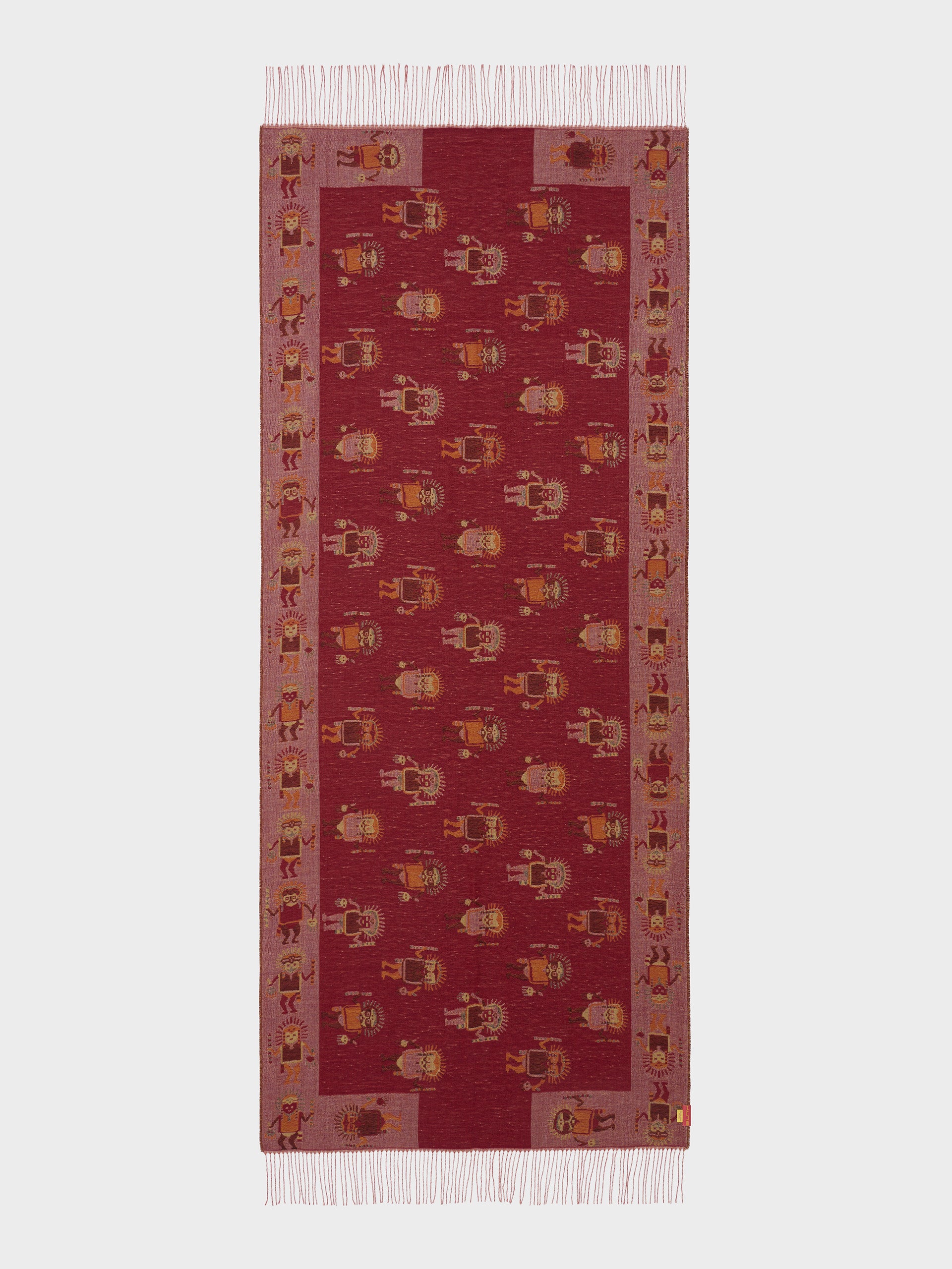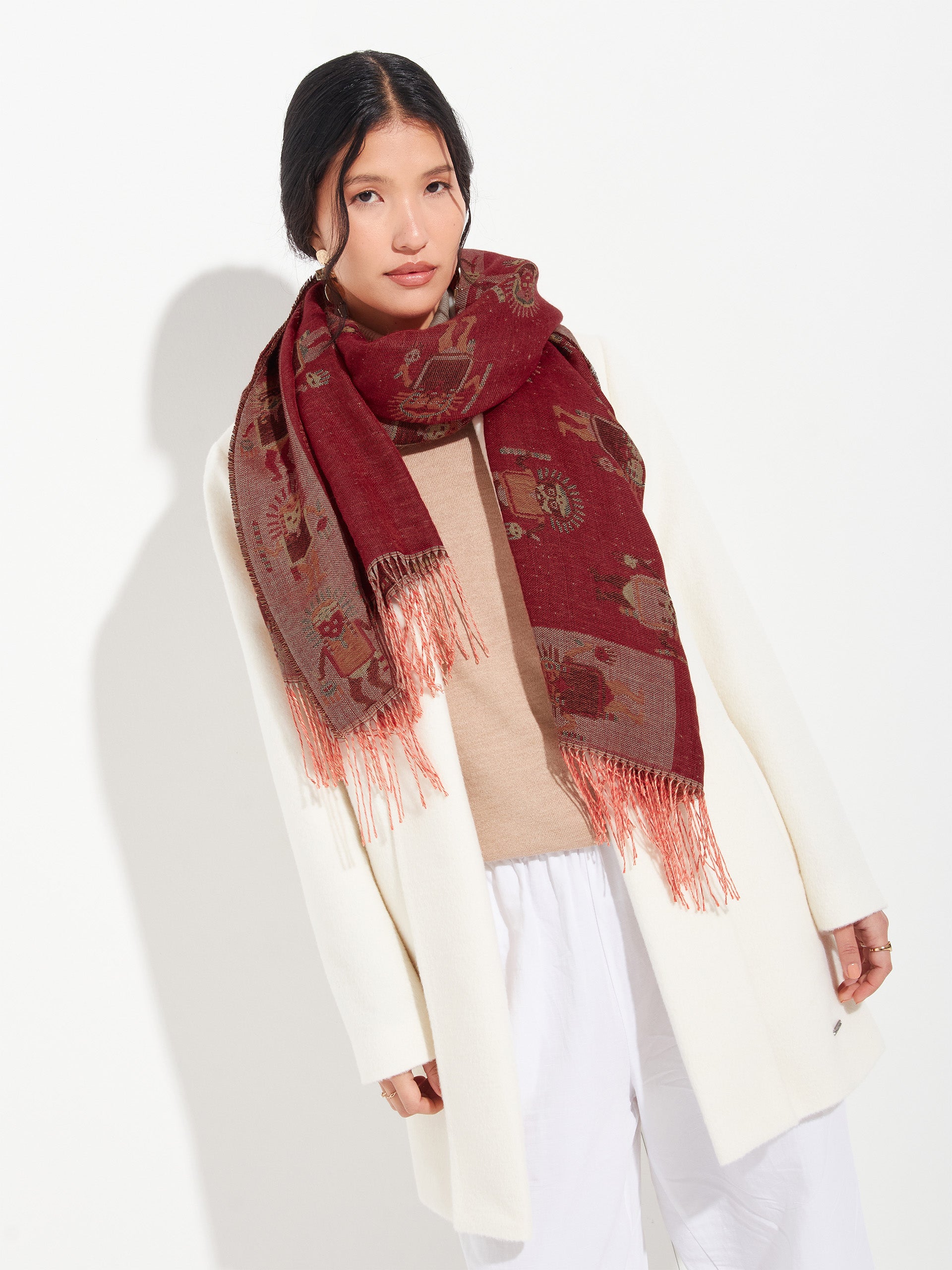Nazca 53 stole in red, made from 70% baby alpaca and 30% silk, crafted in double-weave Jacquard with hidden weft insertion. It measures 200/180 x 75 cm and is a reversible piece inspired by the Nazca culture, reviving the ancestral legacy through a design based on the indigenous culture. | Predominant material: Baby Alpaca