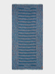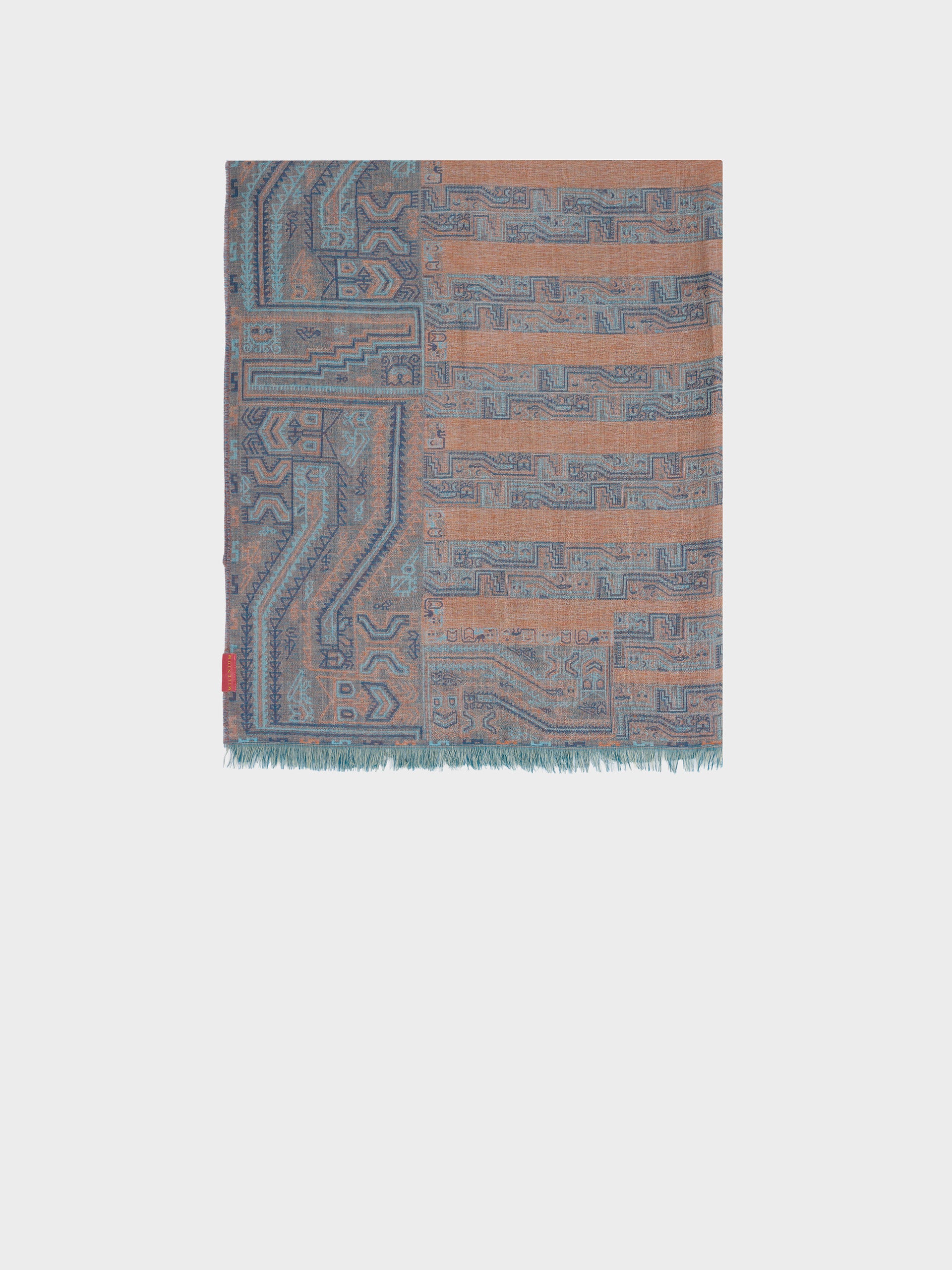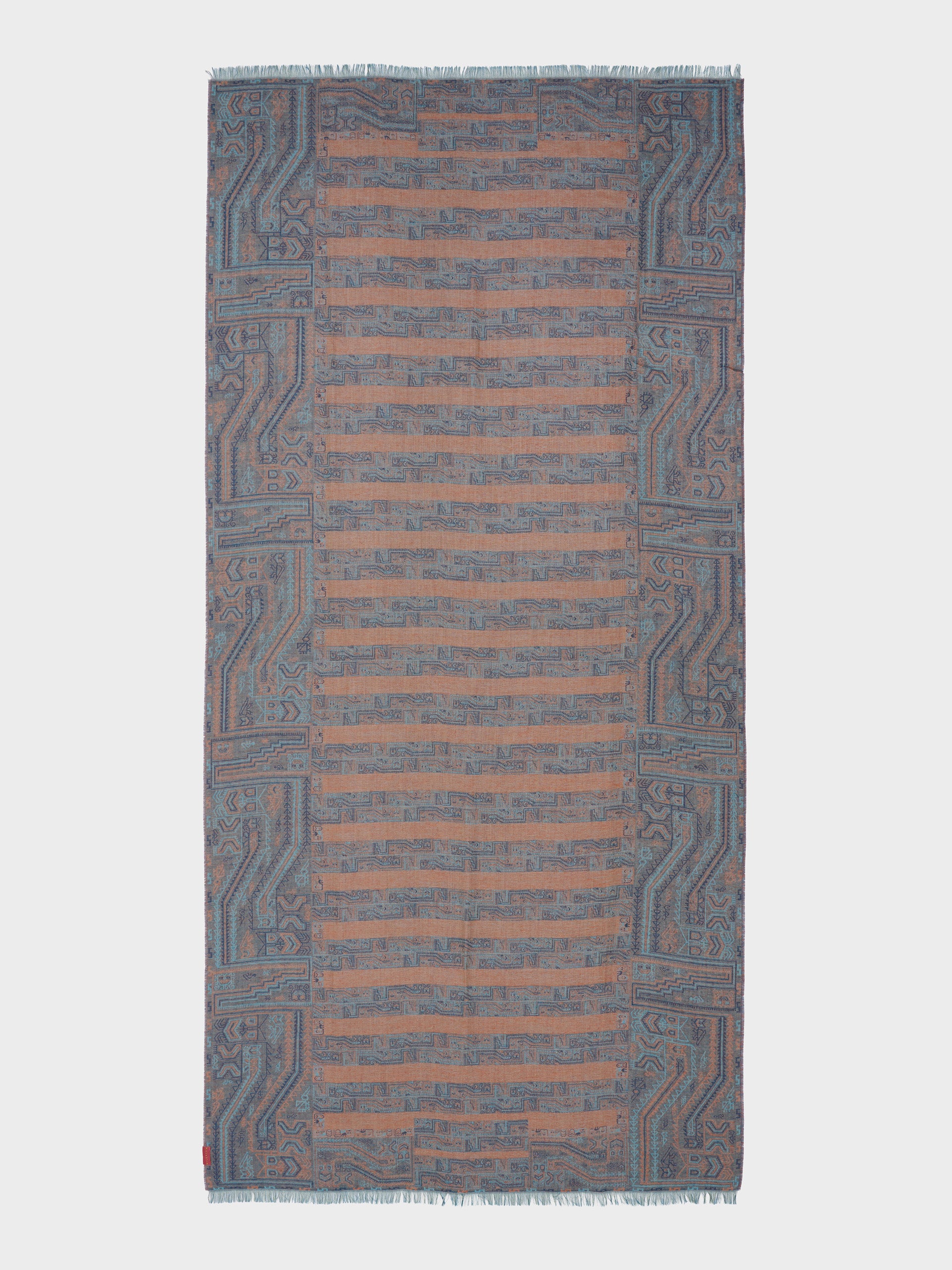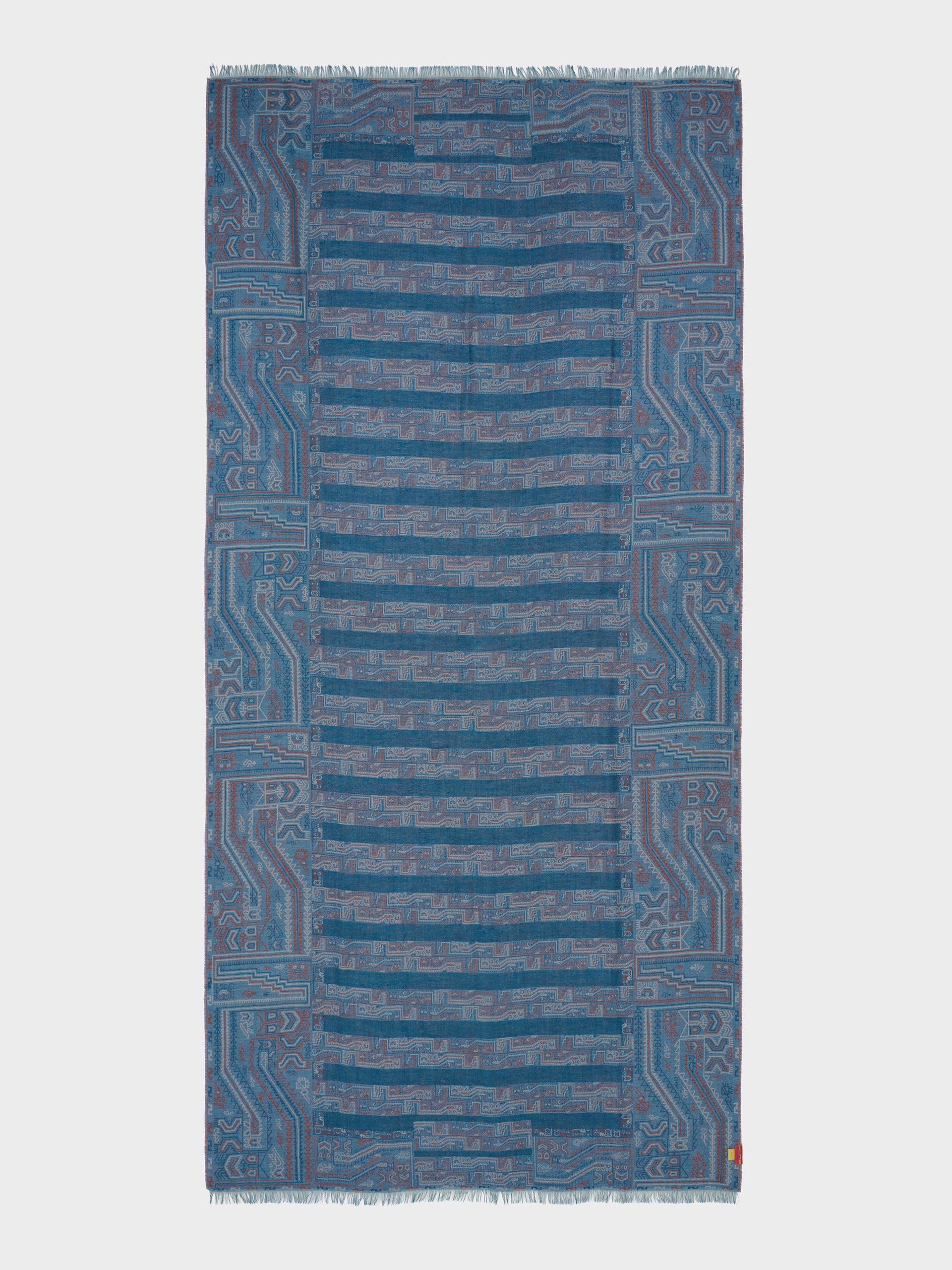Paracas 19 stole in blue, made from 50% Royal alpaca and 50% silk, using a double fabric Jacquard technique and hidden weft insertion. Measuring 200/196 x 93 cm, this reversible garment is inspired by the Paracas culture and conveys ancestral heritage through a design with deep cultural significance. | Predominant material: Royal Alpaca And Silk