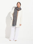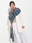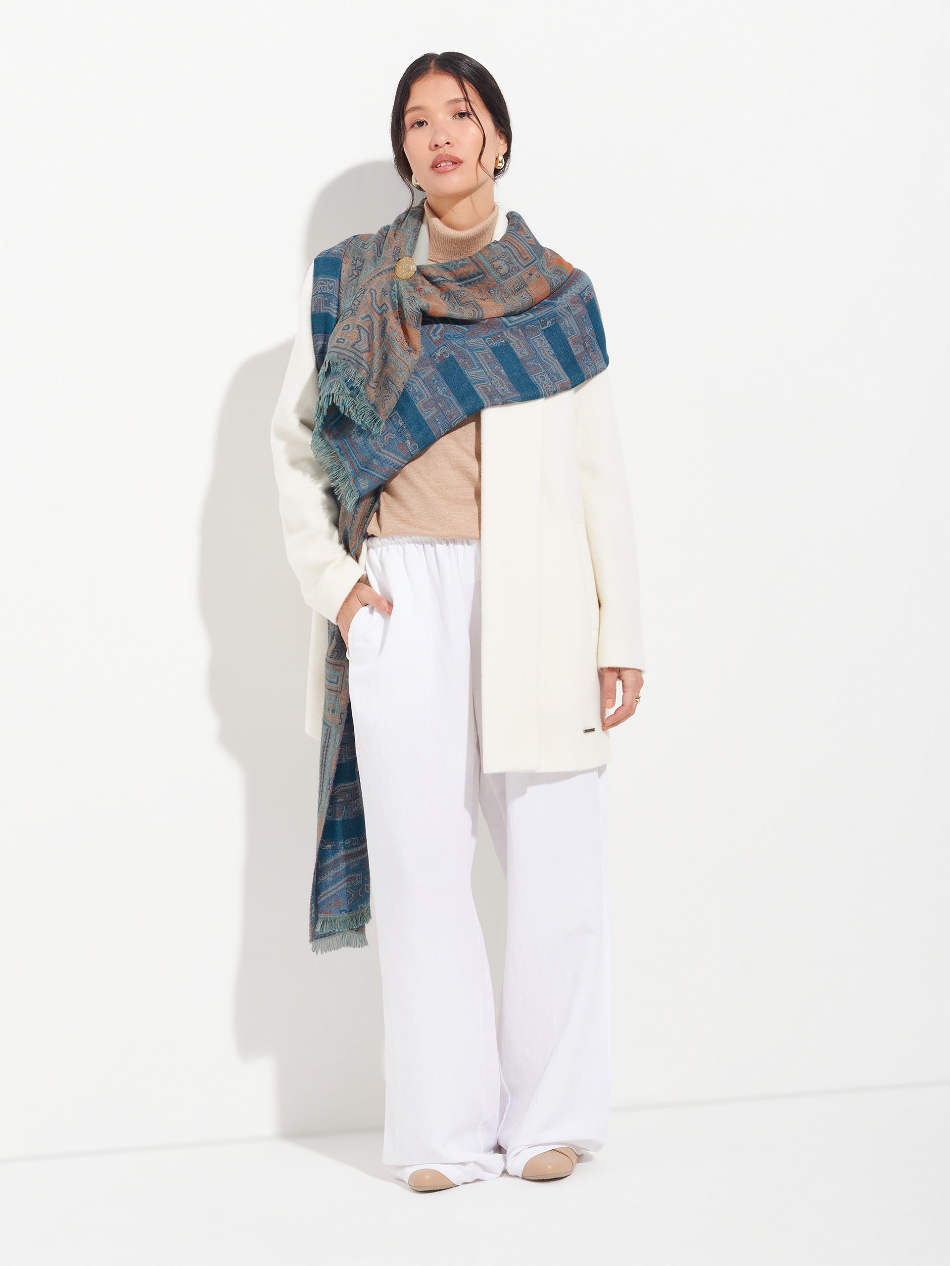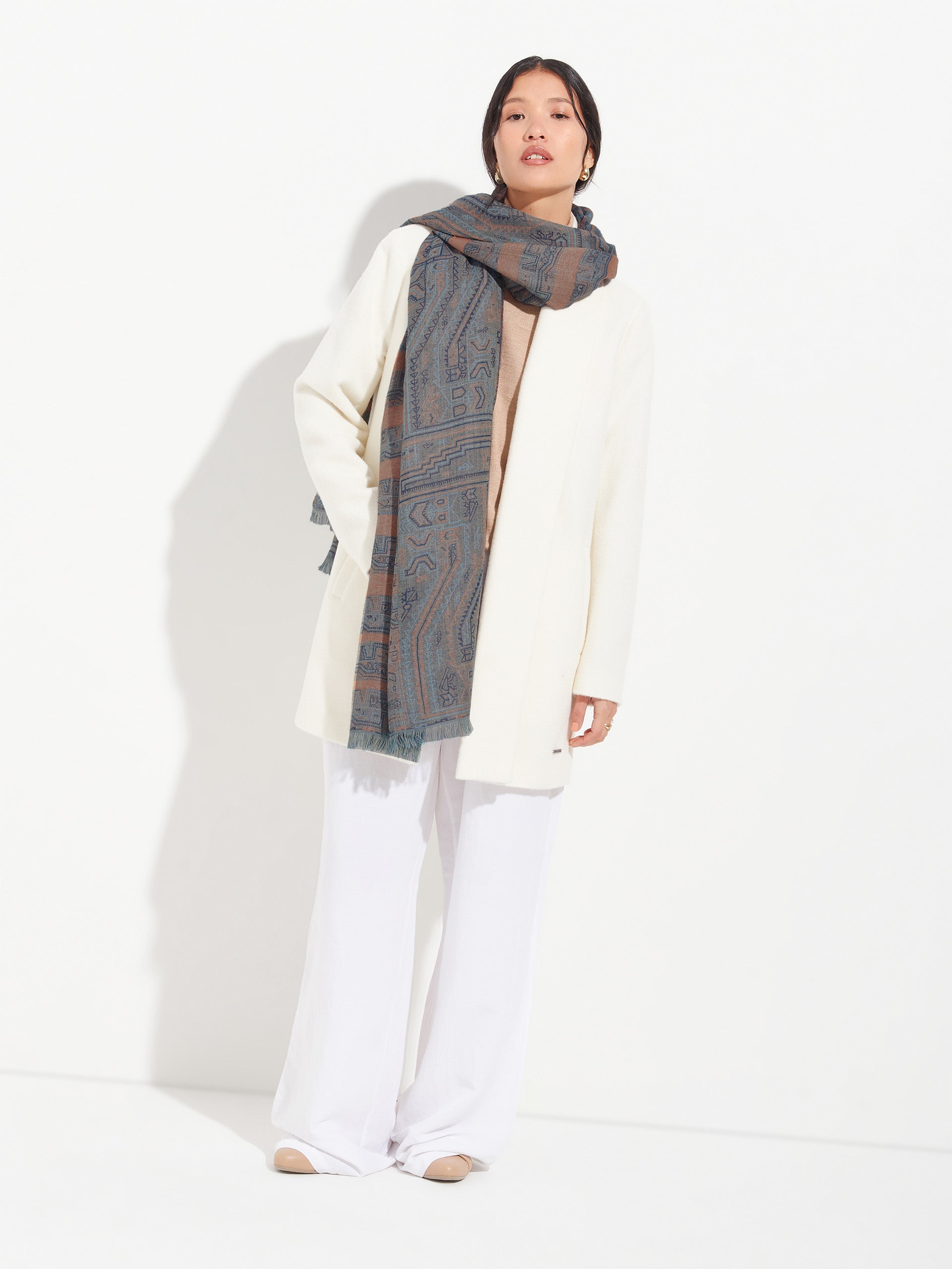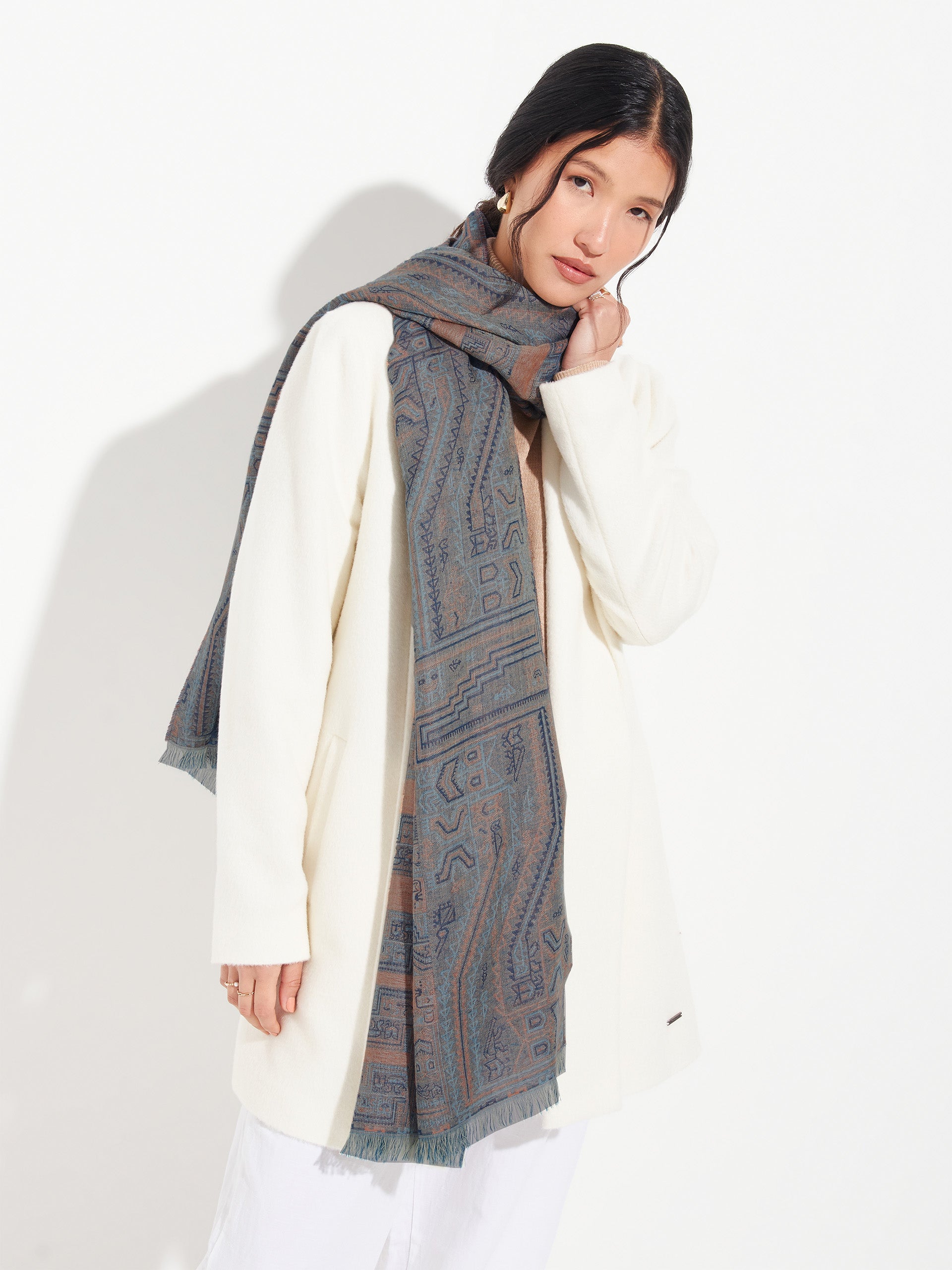 Paracas 19 stole in blue, made from 50% Royal alpaca and 50% silk, using a double fabric Jacquard technique and hidden weft insertion. Measuring 200/196 x 93 cm, this reversible garment is inspired by the Paracas culture and conveys ancestral heritage through a design with deep cultural significance. | Predominant material: Royal Alpaca And Silk