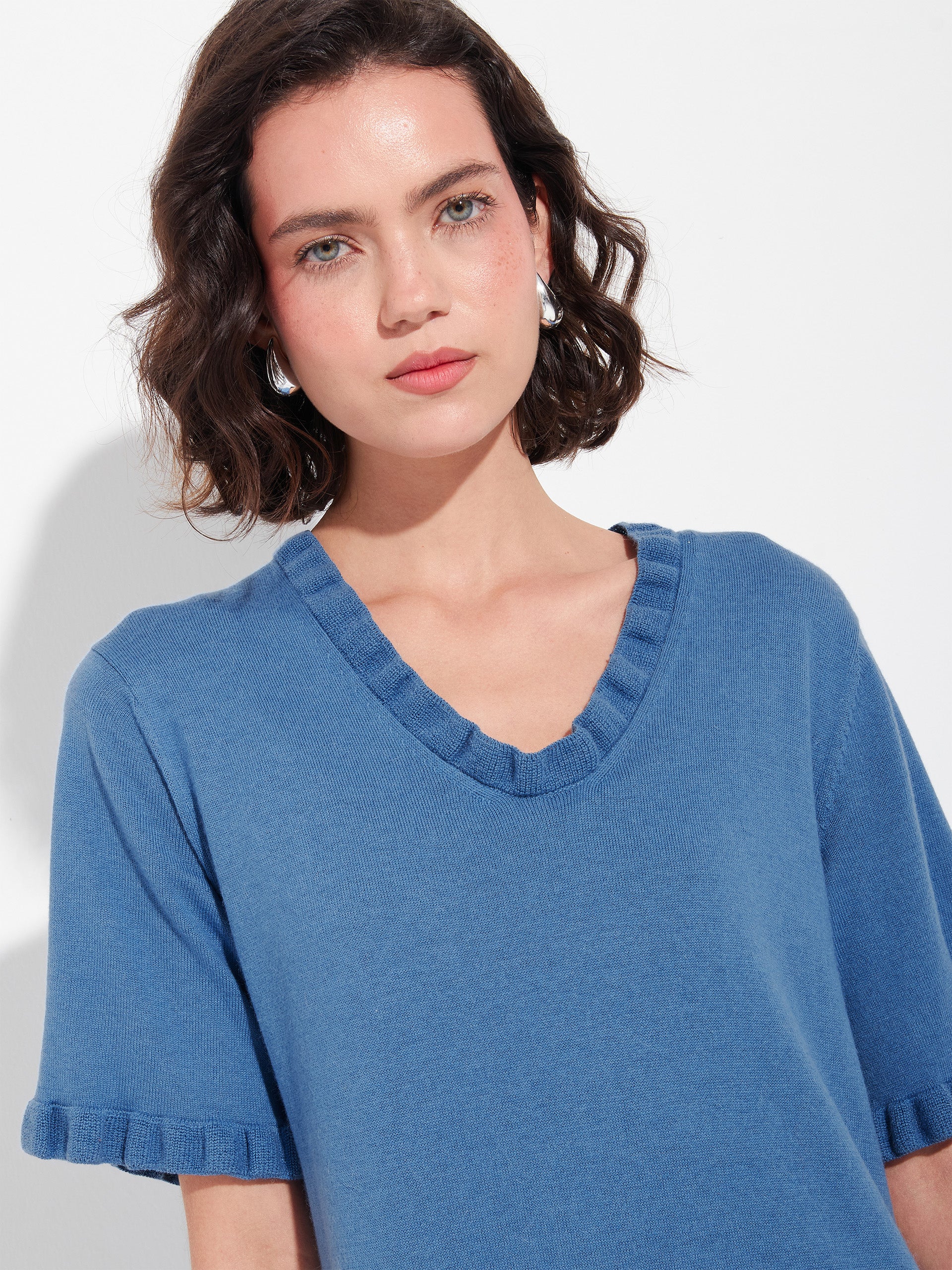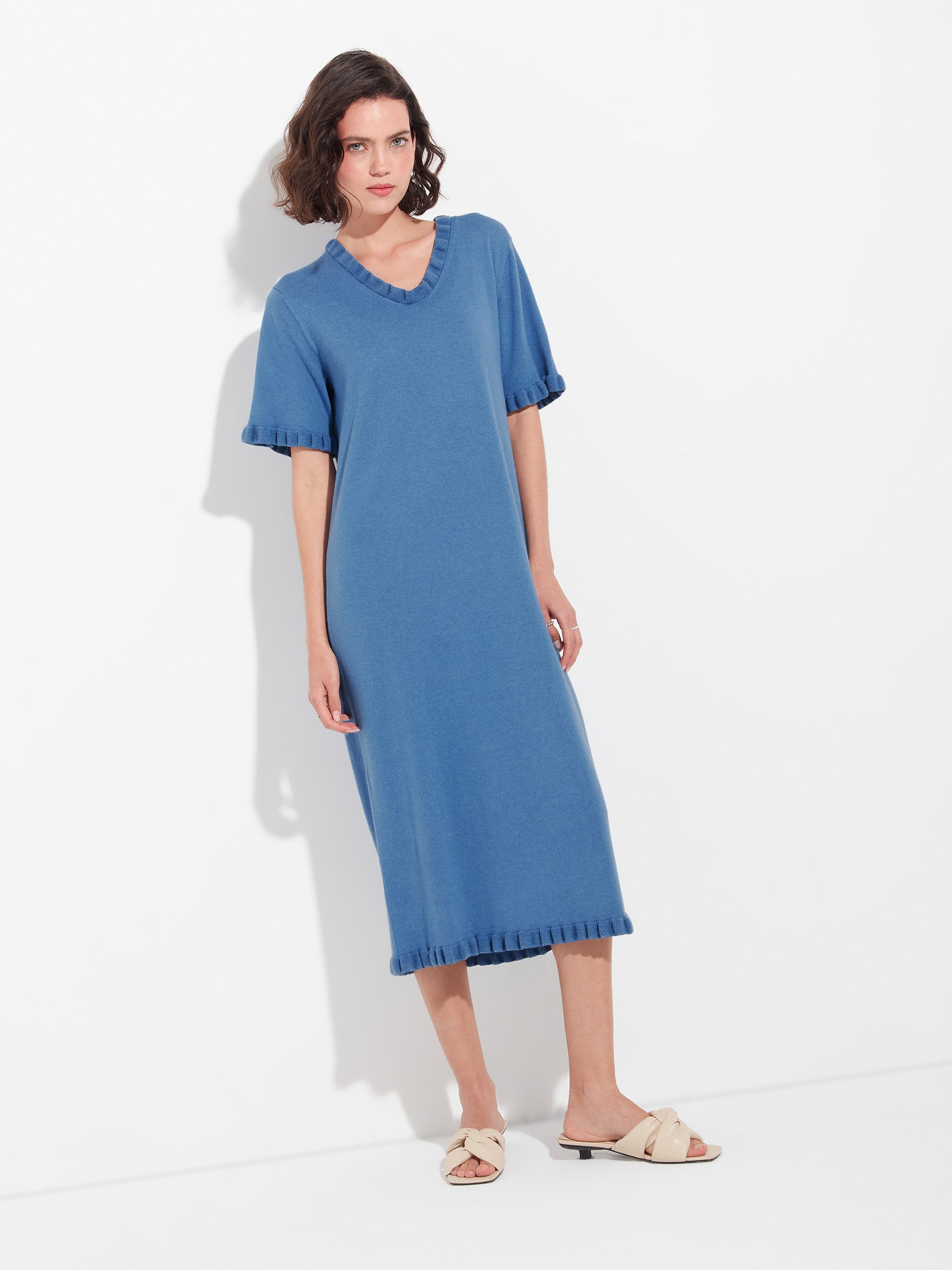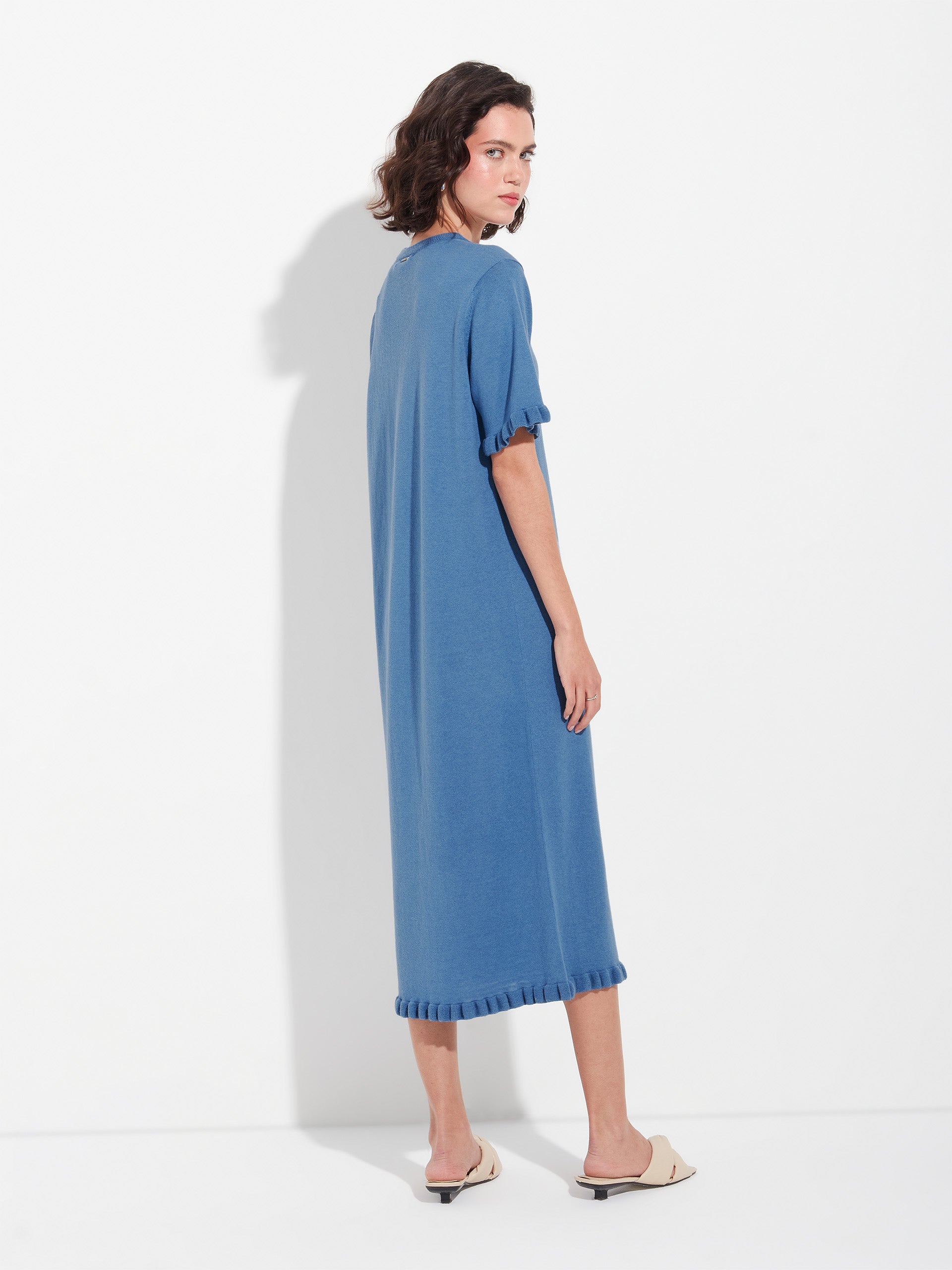 Zabrina dress in blue, made from a blend of organic cotton and baby alpaca. It features a plain knit with a slit and pockets, offering a soft texture and a comfortable design with a modern, natural style. | Predominant material: Cotton