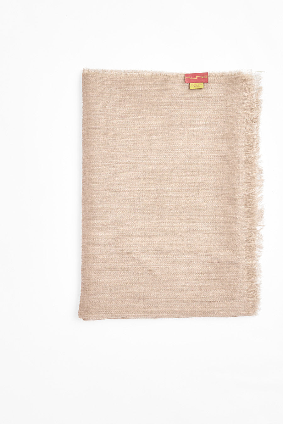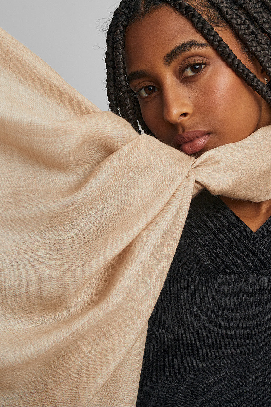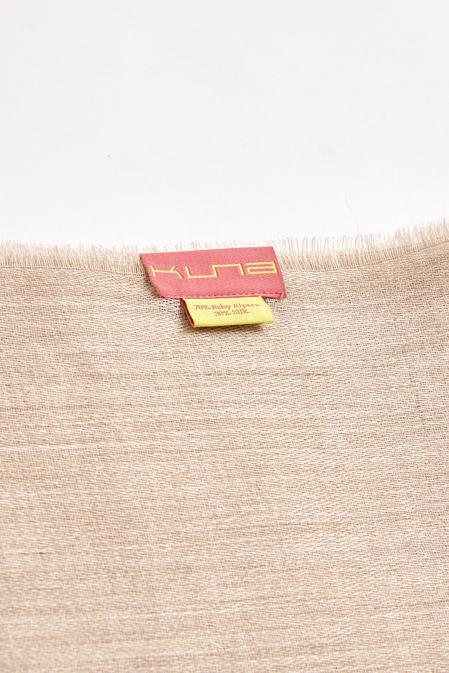 This elegant shawl in neutral tones is a baby alpaca and silk piece which accentuates any attire.