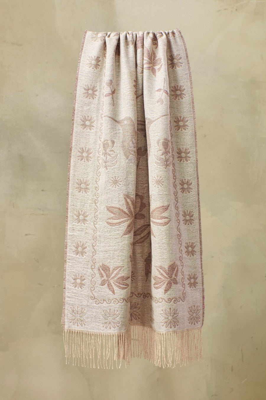 Floral designs and bird motifs adorn this baby alpaca and silk shawl, making it the perfect thing to use on any occasion.
