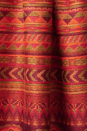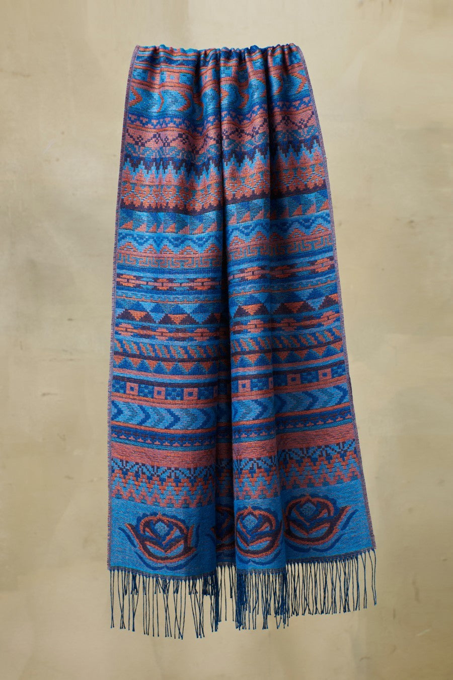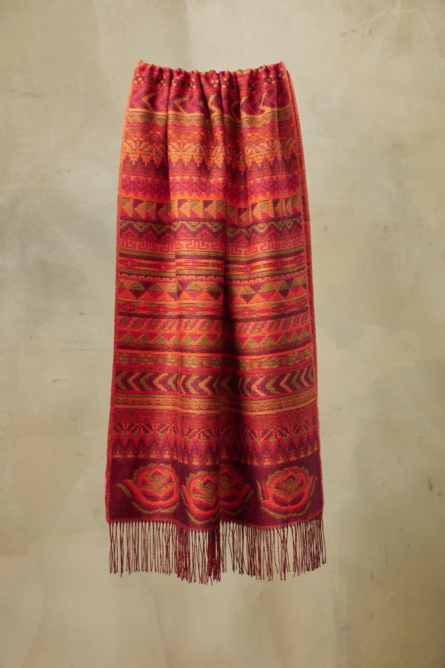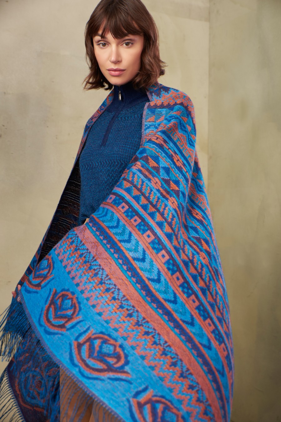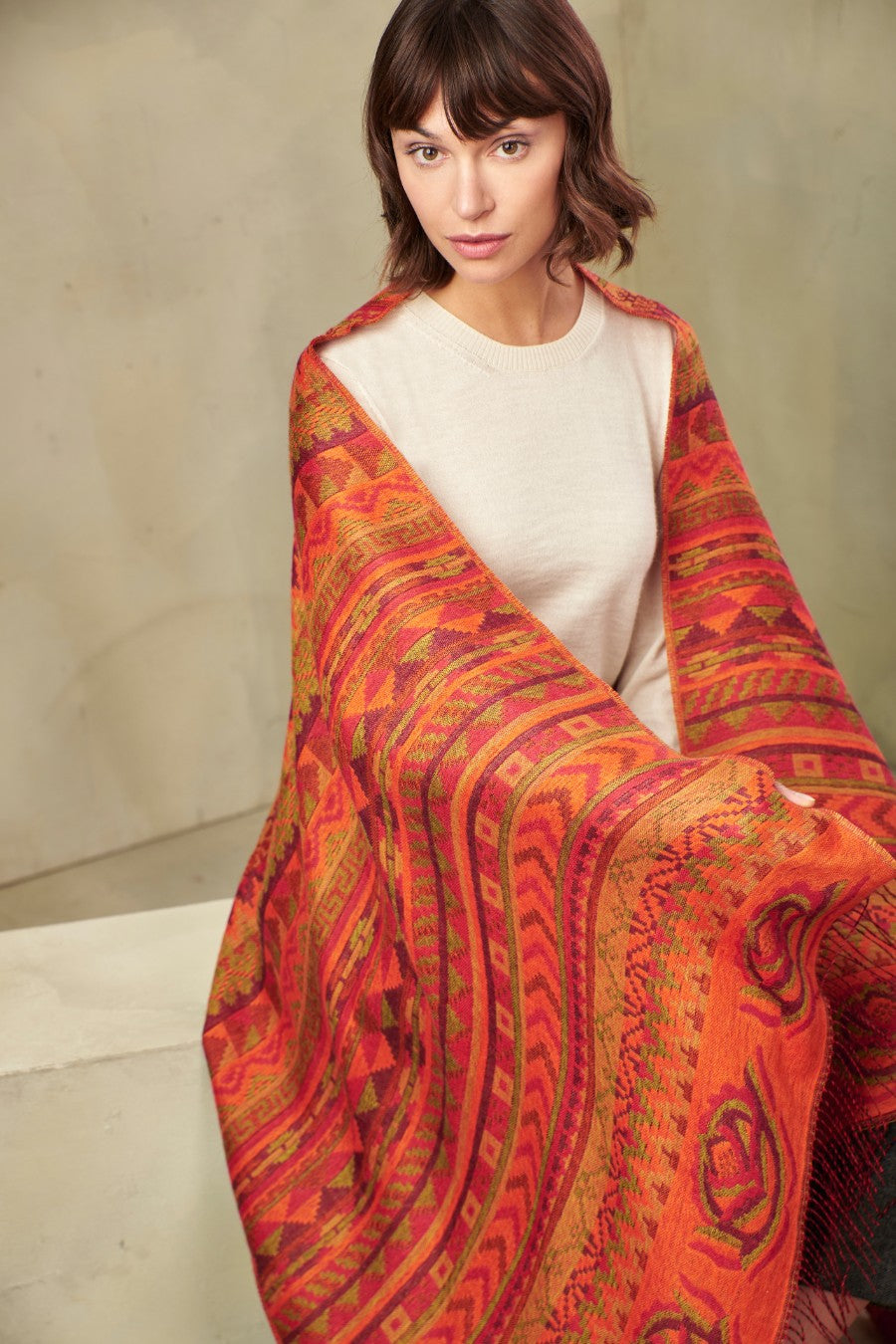 Flowers and geometric figures in intense tones make this baby alpaca and silk shawl the ideal garment for any occasion.