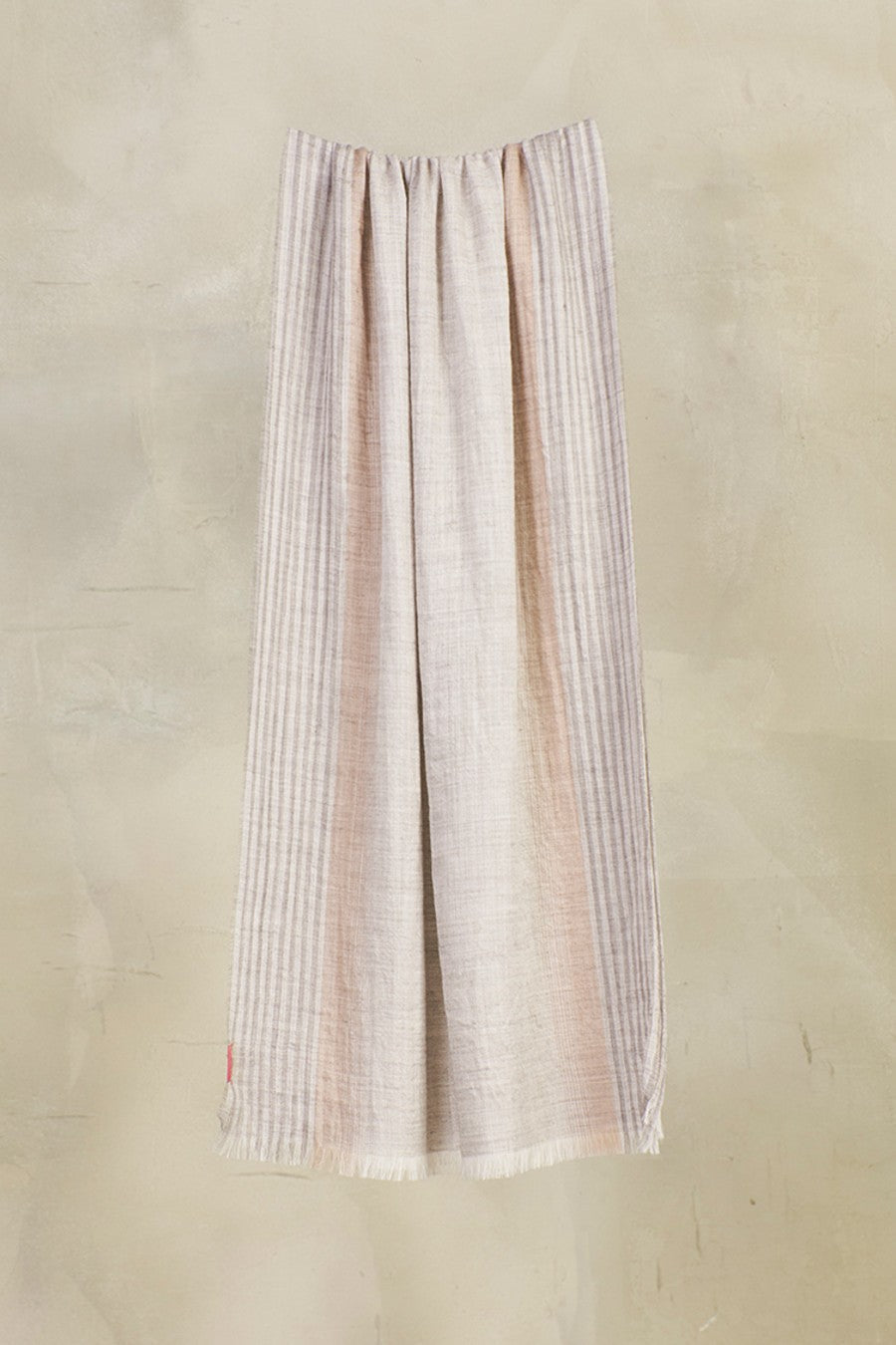 This elegant baby alpaca and silk shawl features neutral colours which give balance and style to any look.