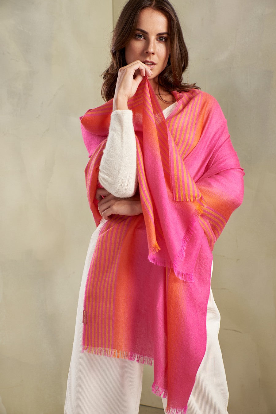 This elegant baby alpaca and silk shawl features neutral colours which give balance and style to any look.