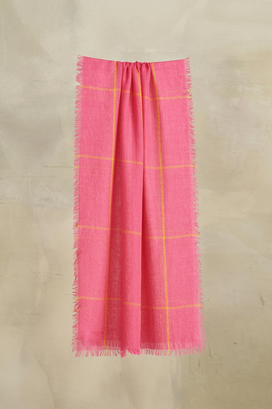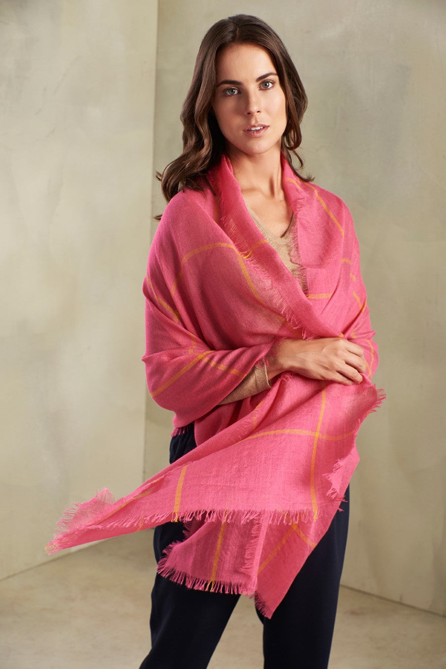 This soft baby alpaca and silk shawl designed in a sobre gingham pattern is perfect for any occasion.