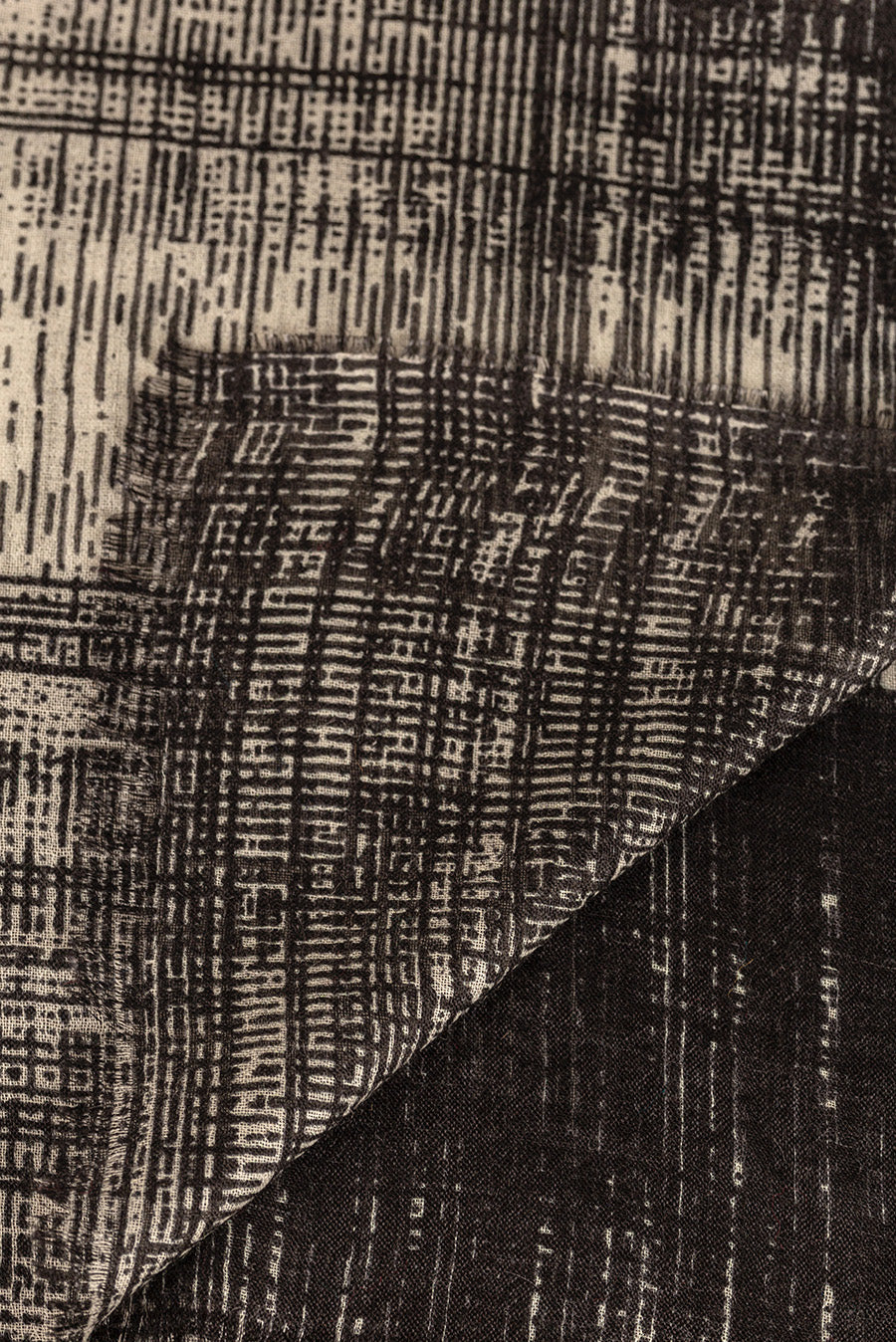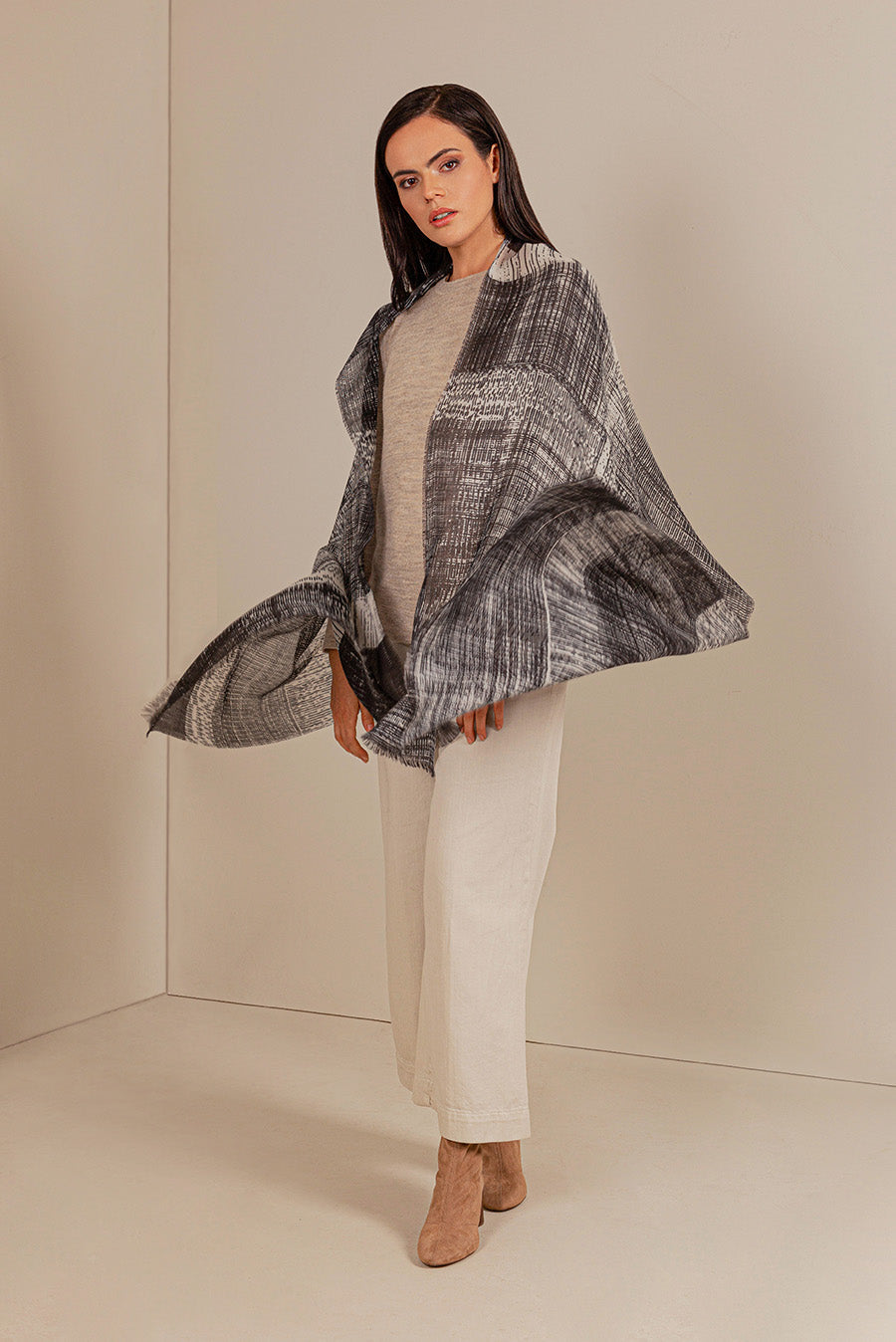Soft and bold, Ulfrida combines baby alpaca and silk, two exquisite fibres that create a luxurious skin-on-skin effect. A beautiful design in neutral tones embellishes this unique accessory.