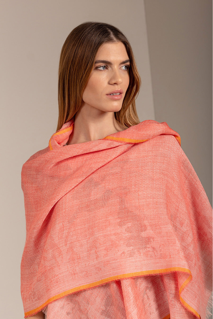 Marine live motifs embellish our Unlimited shawl in great summer colours. A light and soft blend of baby alpaca and silk, make it a versatile piece, ideal to create unique looks.