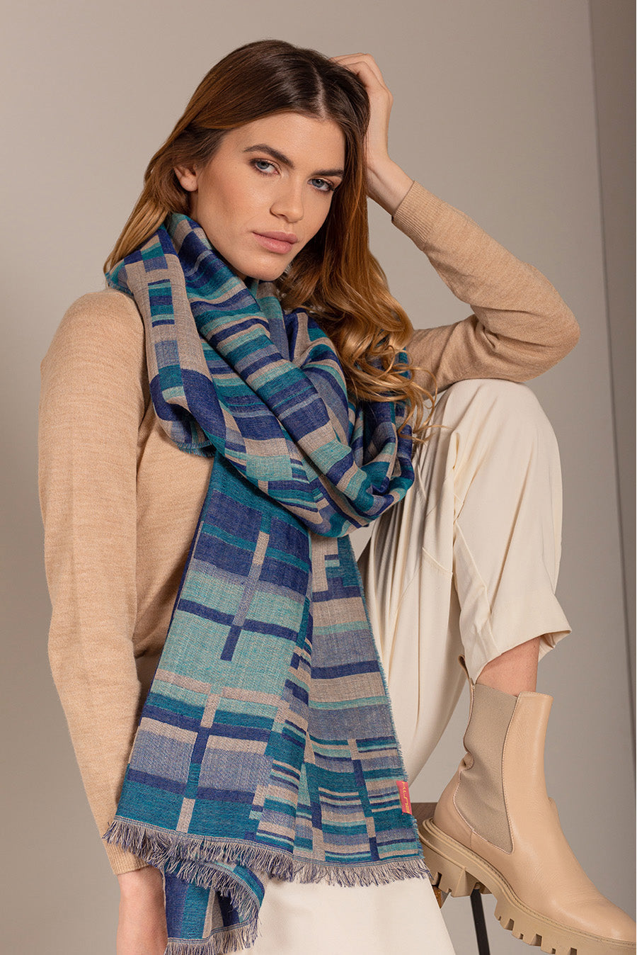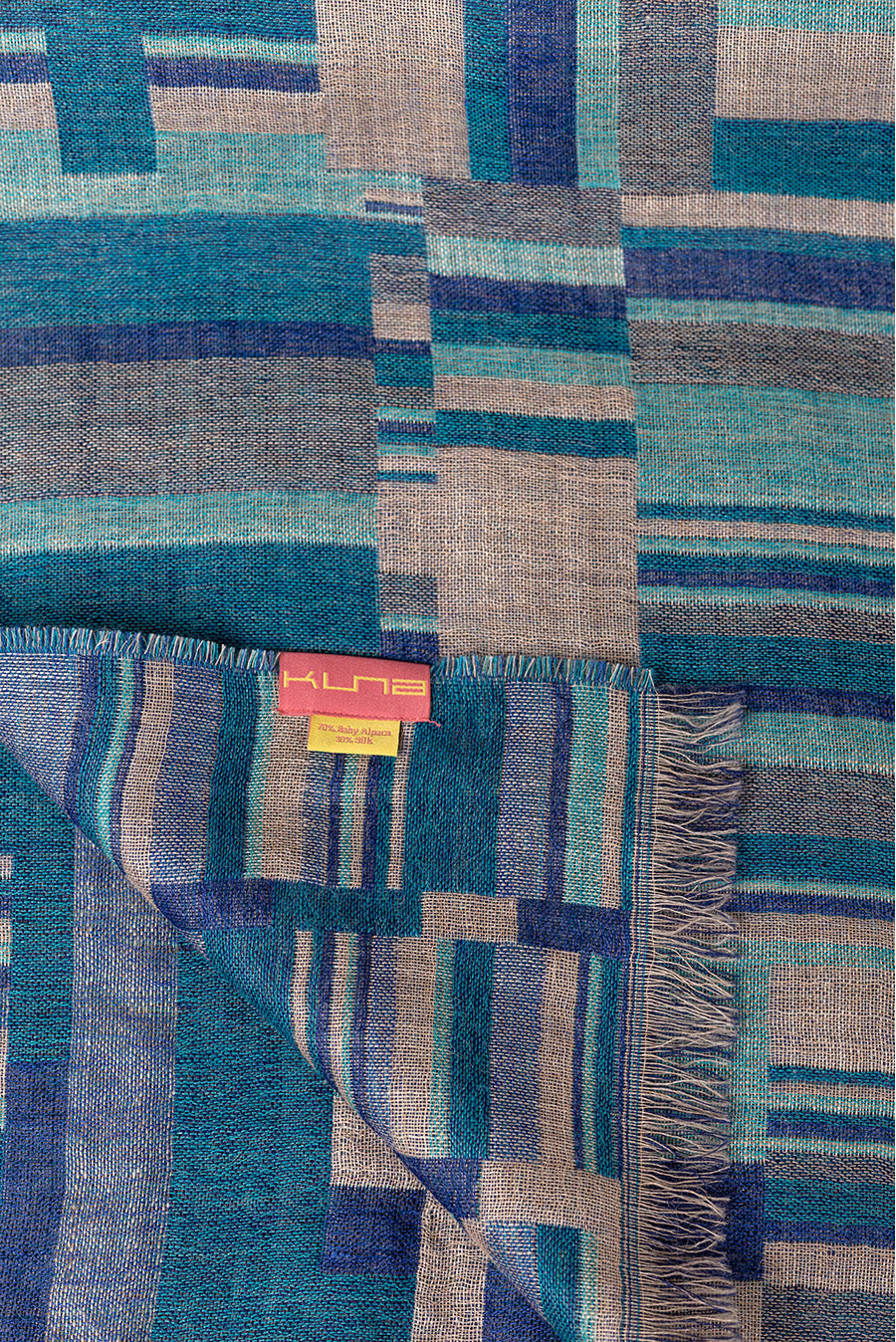 Made of baby alpaca and silk, our Up shawl is soft and light. The jacquard design and bright colours make it a must-have accessory for cold days.