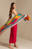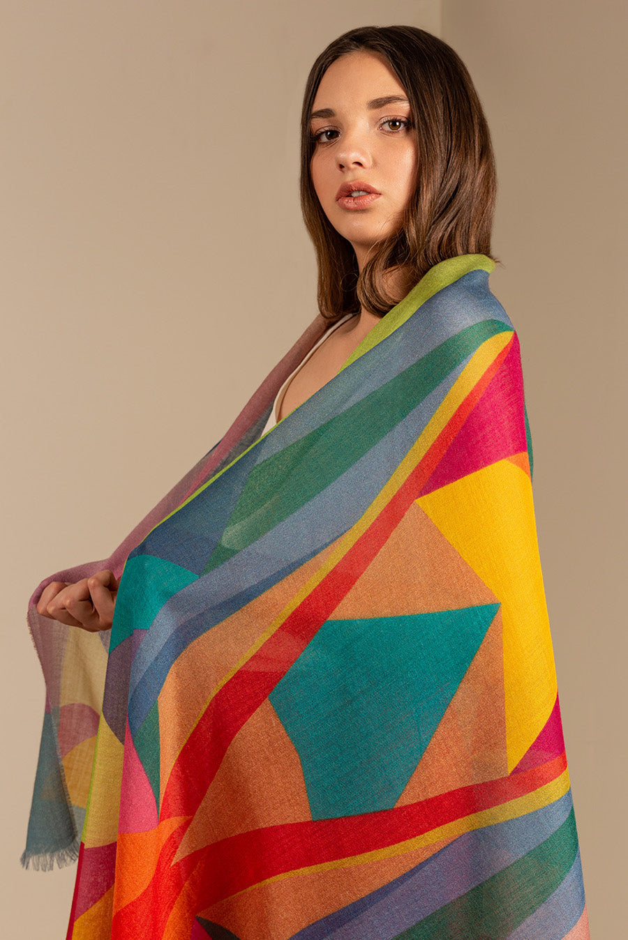 A colourful geometric design embellishes this unique accessory made of baby alpaca and silk. Incredibly light and soft, this piece is perfect for special occasions.