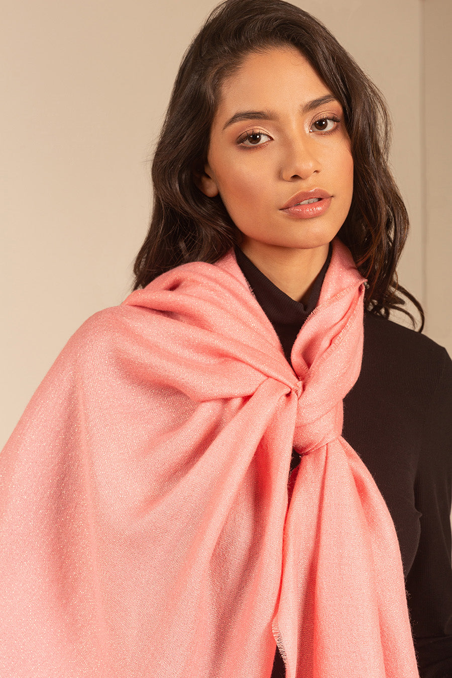 The quality of our materials exalts the style of this special stole with a refined touch. The shimmering reflections displayed by the lurex yarn merge with the soft and enveloping effect of the noble natural fibers of baby alpaca and silk. A sophisticated accessory that enhances feminine charm.