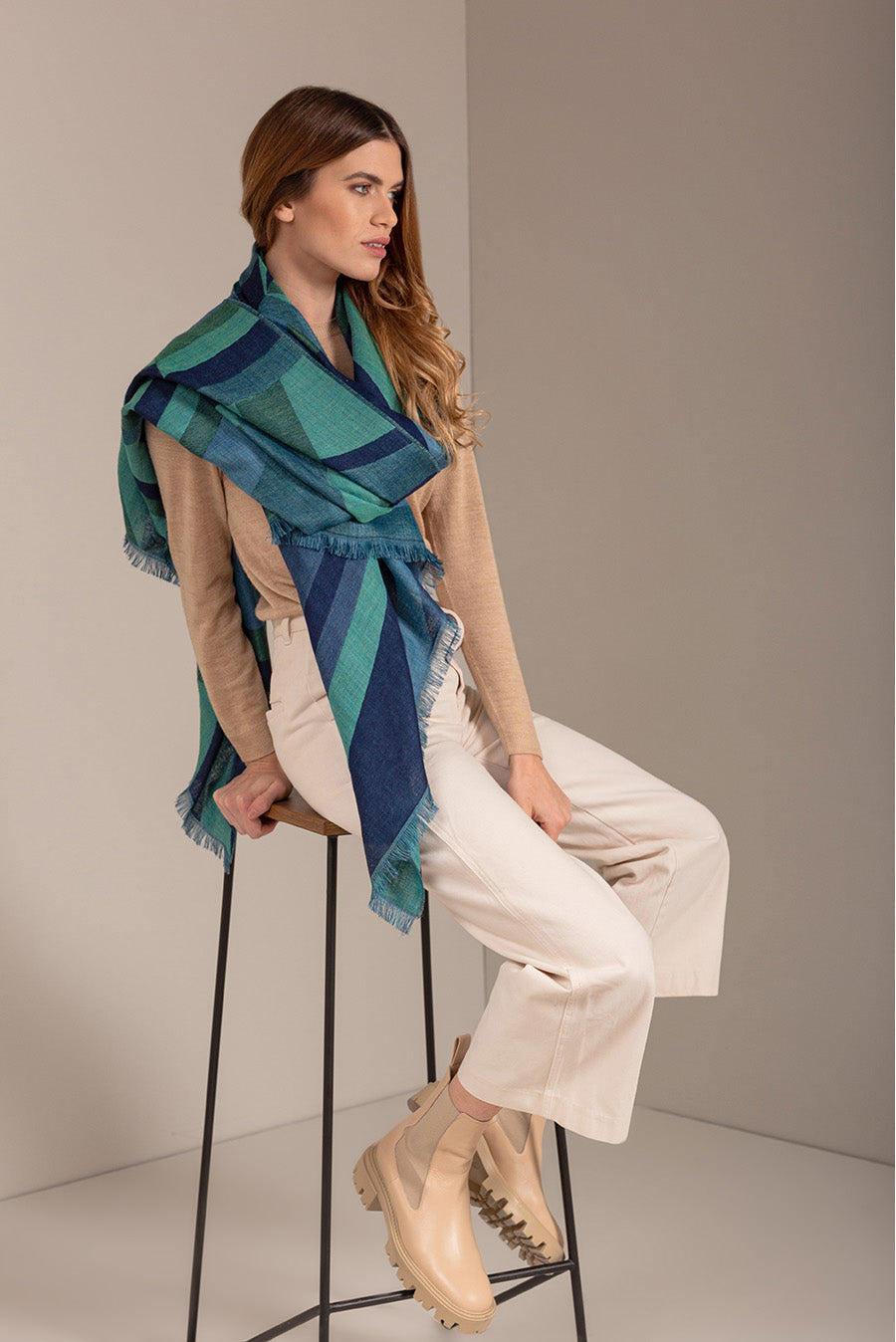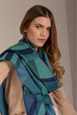 Made of baby alpaca and silk, our Ursula jacquard shawl is embellished by a beautiful geometric design in bright colours. Soft and elegant, it is a versatile accessory, perfect to wear with any outfit.