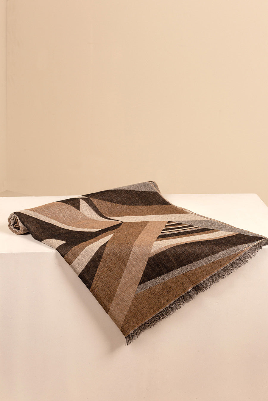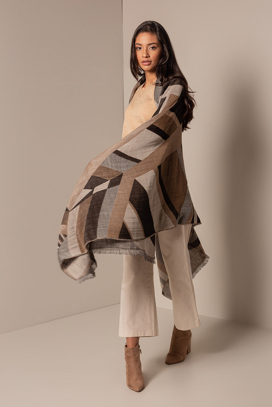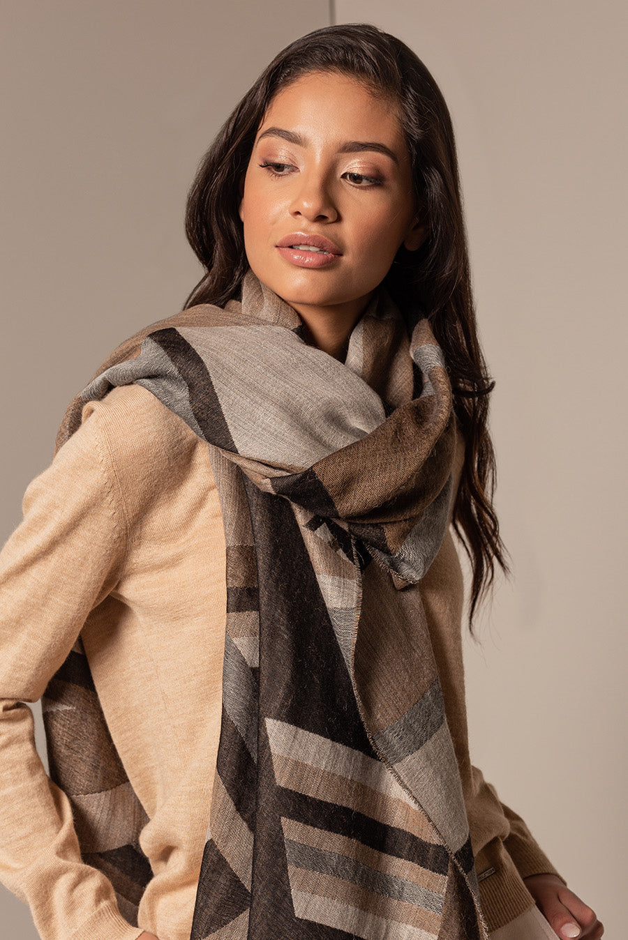 Made of baby alpaca and silk, our Ursula jacquard shawl is embellished by a beautiful geometric design in bright colours. Soft and elegant, it is a versatile accessory, perfect to wear with any outfit.