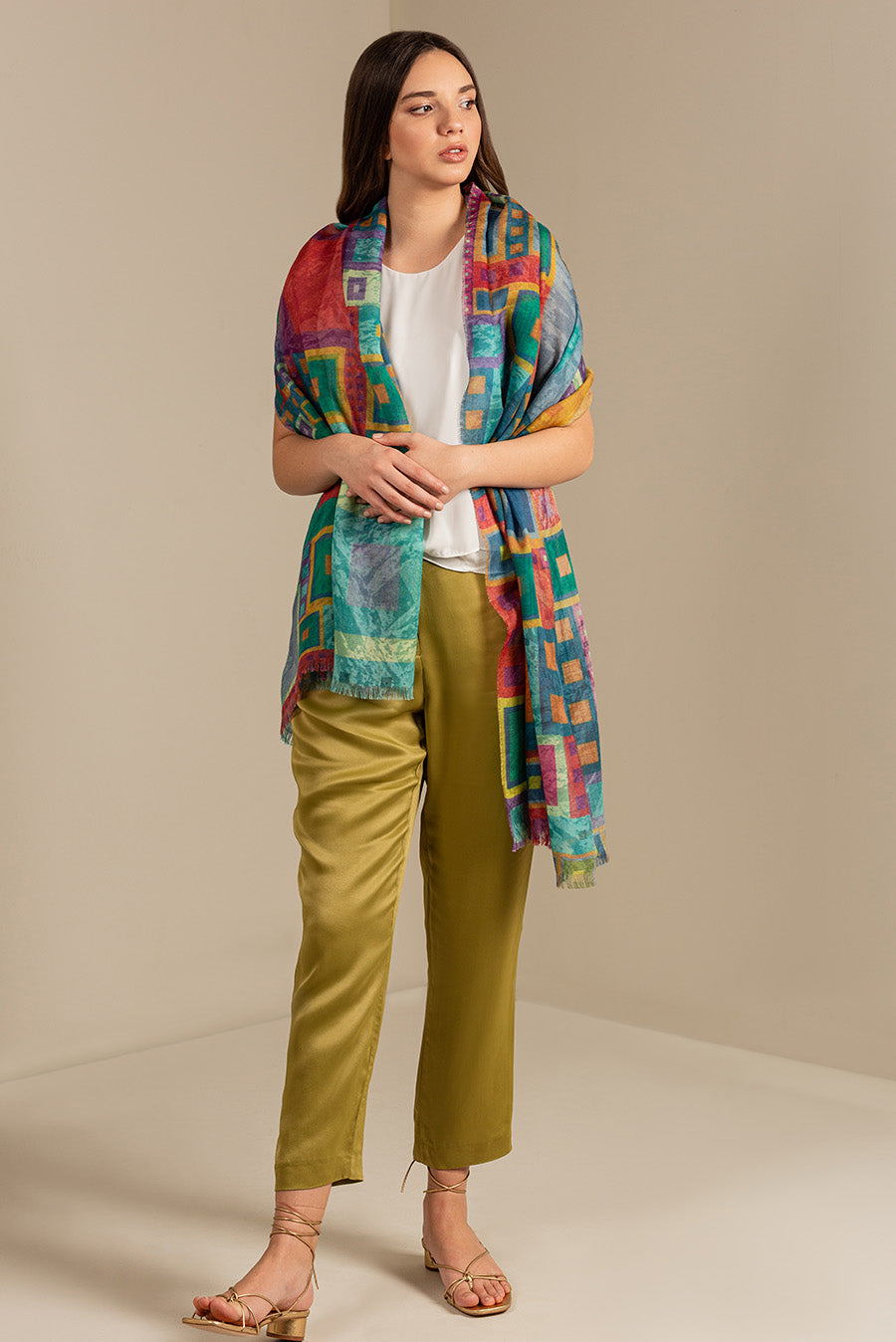 Light and soft, our Uslo shawl features a colourful geometric design that will add a unique vibe to your outfits.