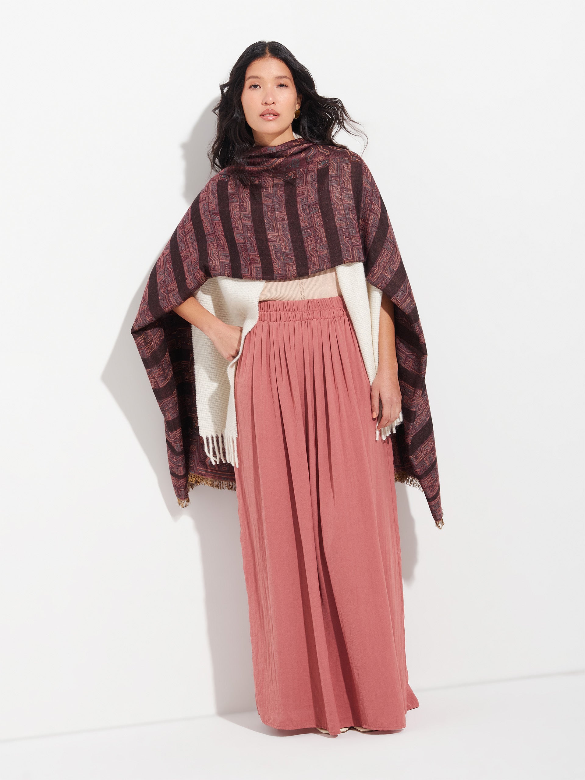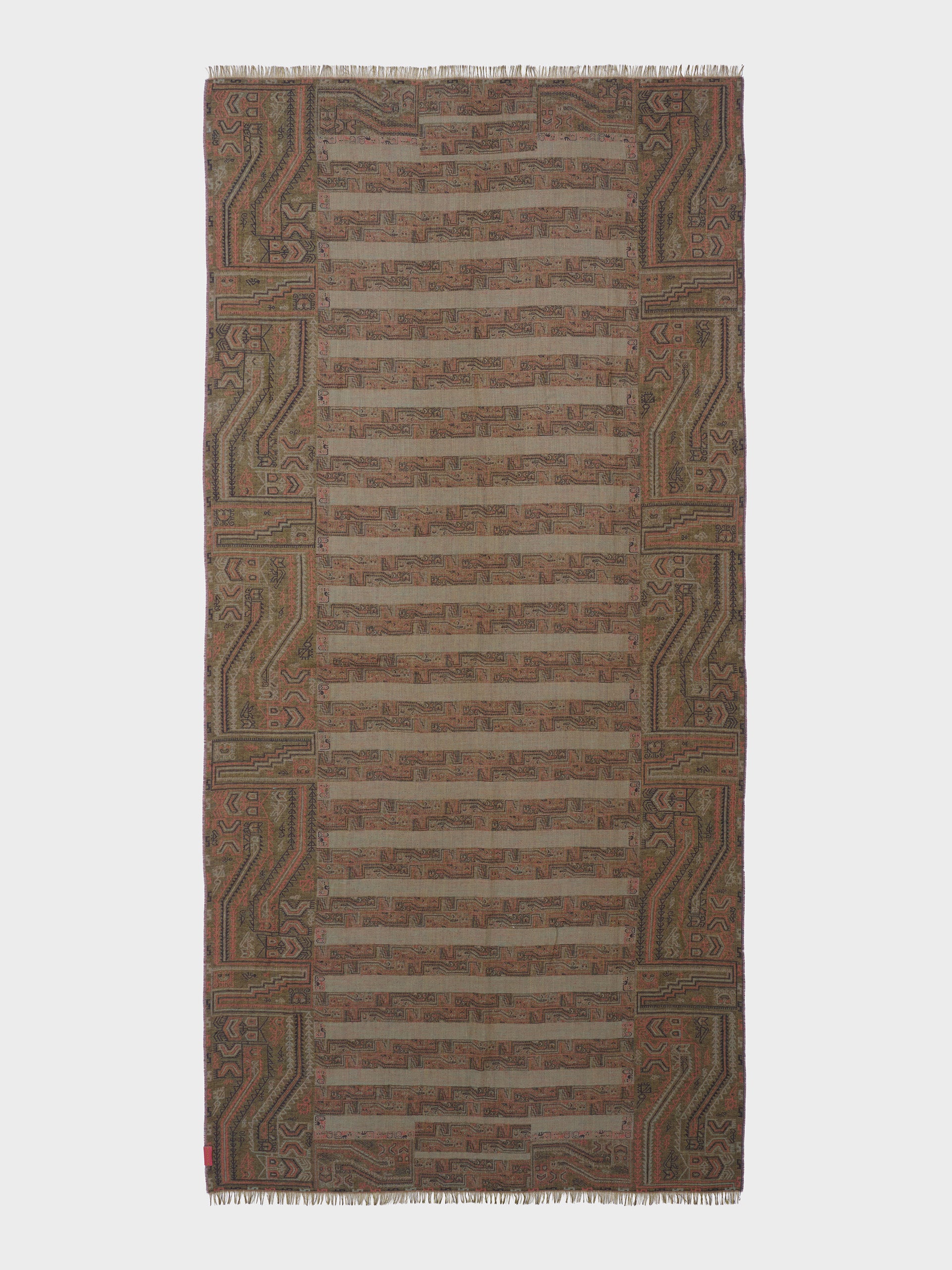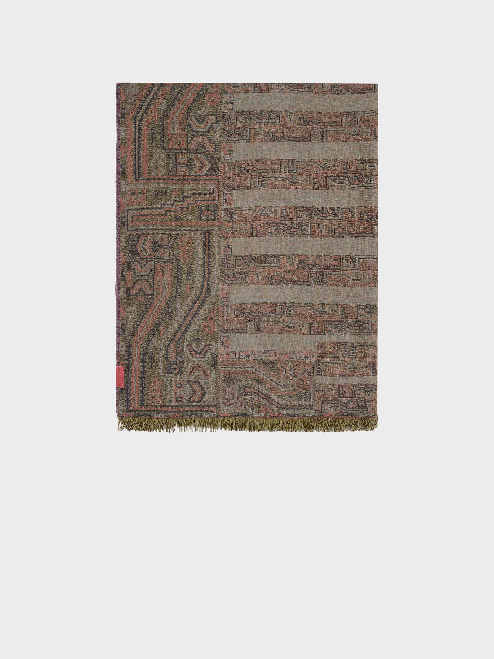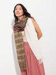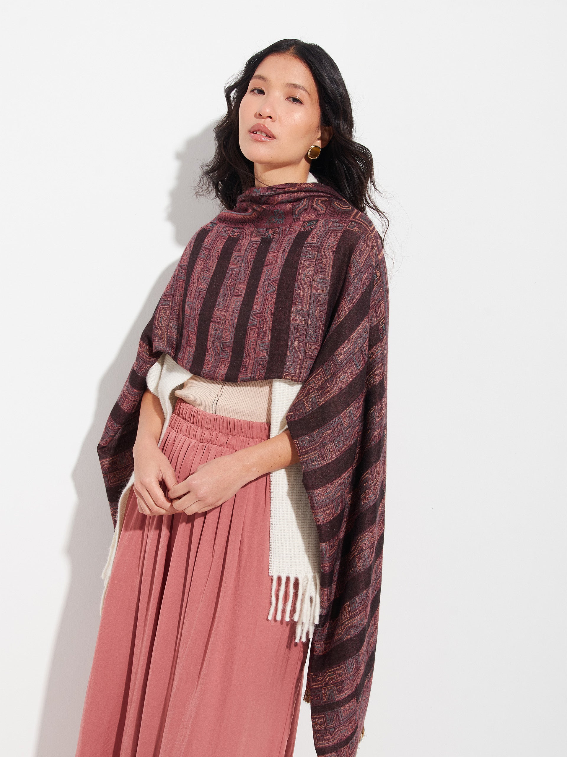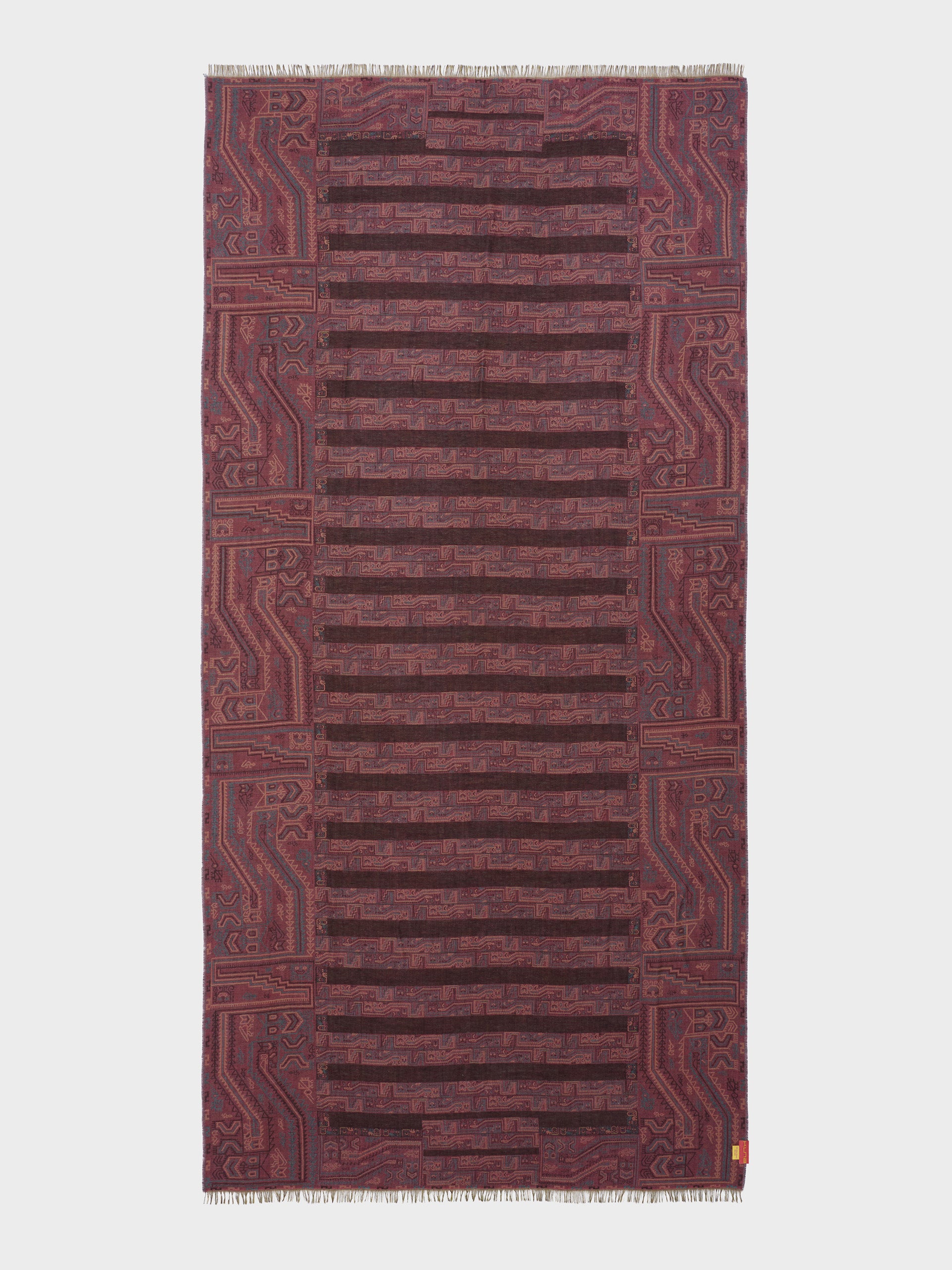 Paracas 19 stole in brown, made from 50% Royal alpaca and 50% silk, using a double fabric Jacquard technique and hidden weft insertion. Measuring 200/196 x 93 cm, it is a reversible garment inspired by the Paracas culture, conveying ancestral heritage through a design with deep cultural significance. | Predominant material: Royal Alpaca And Silk