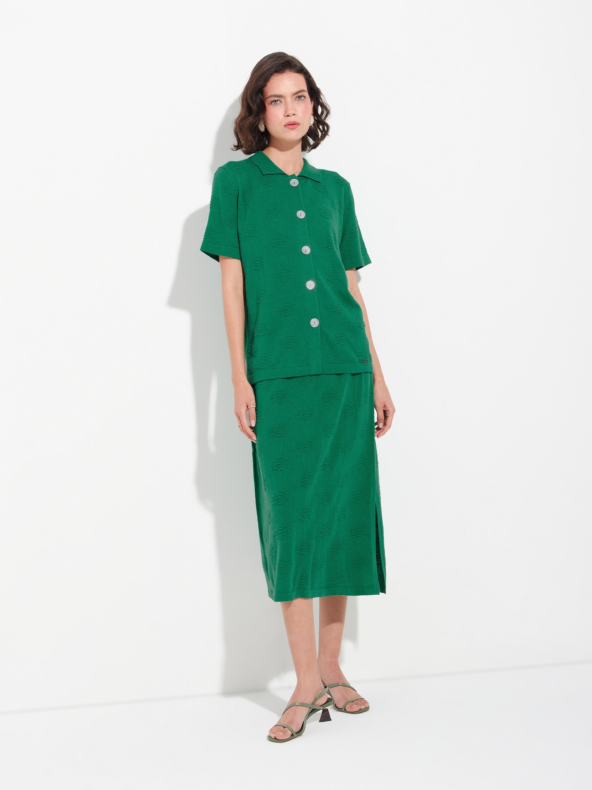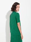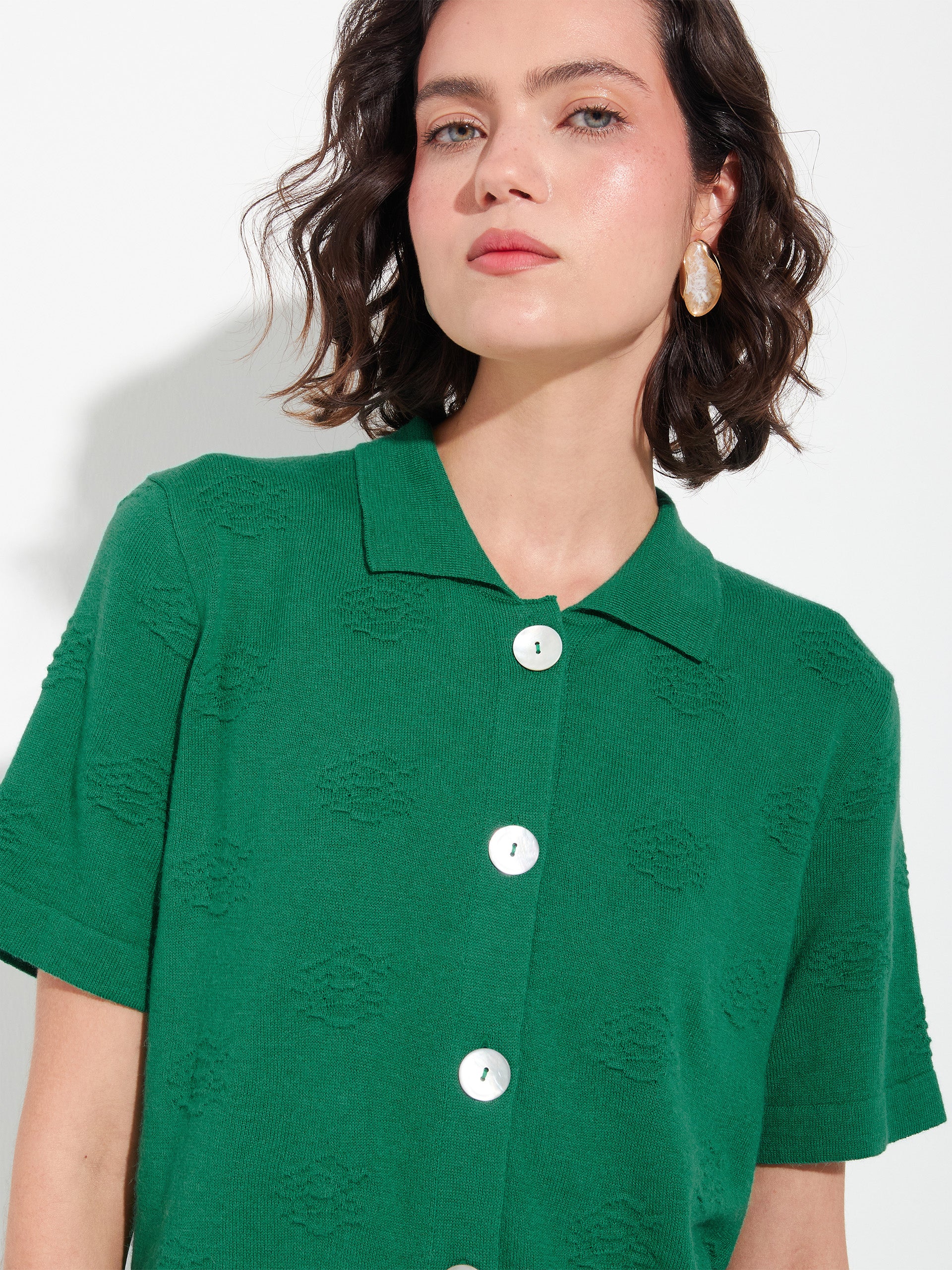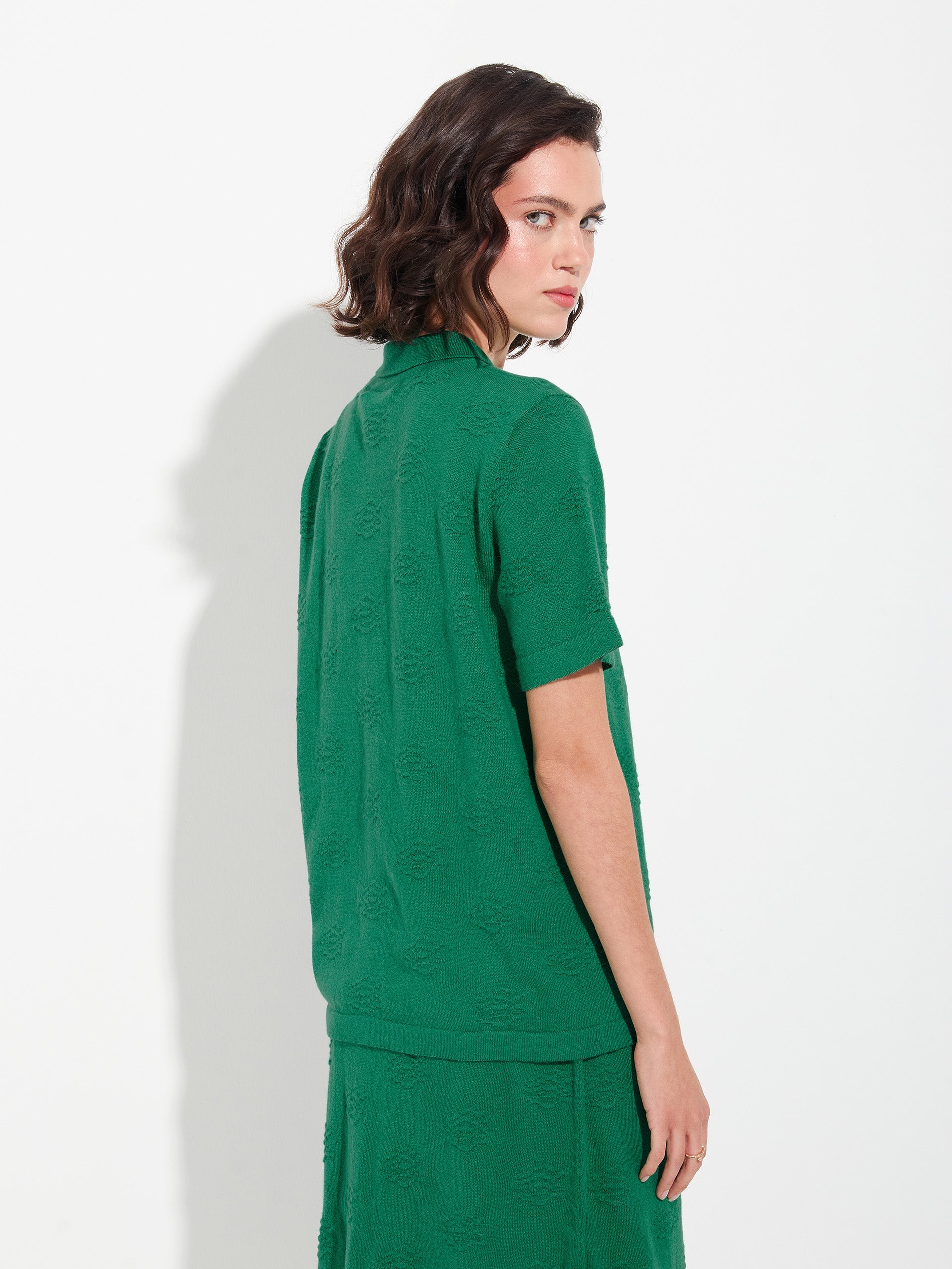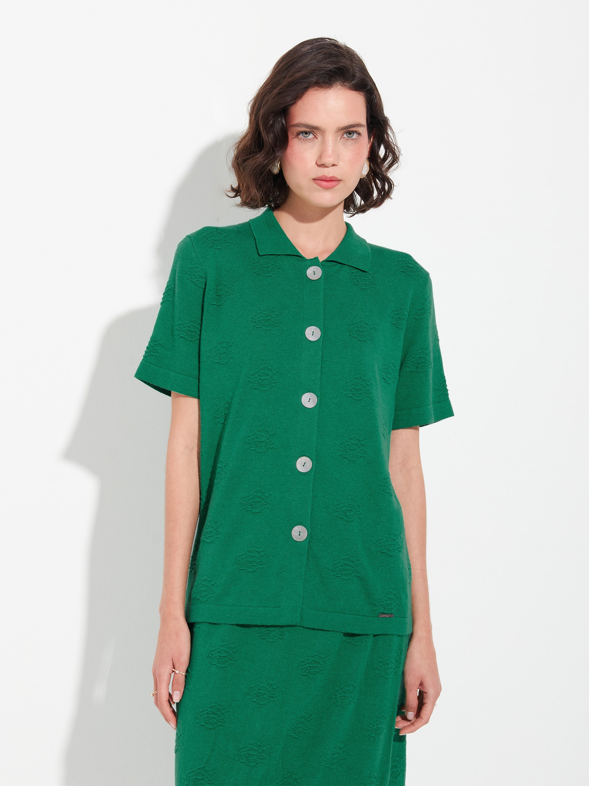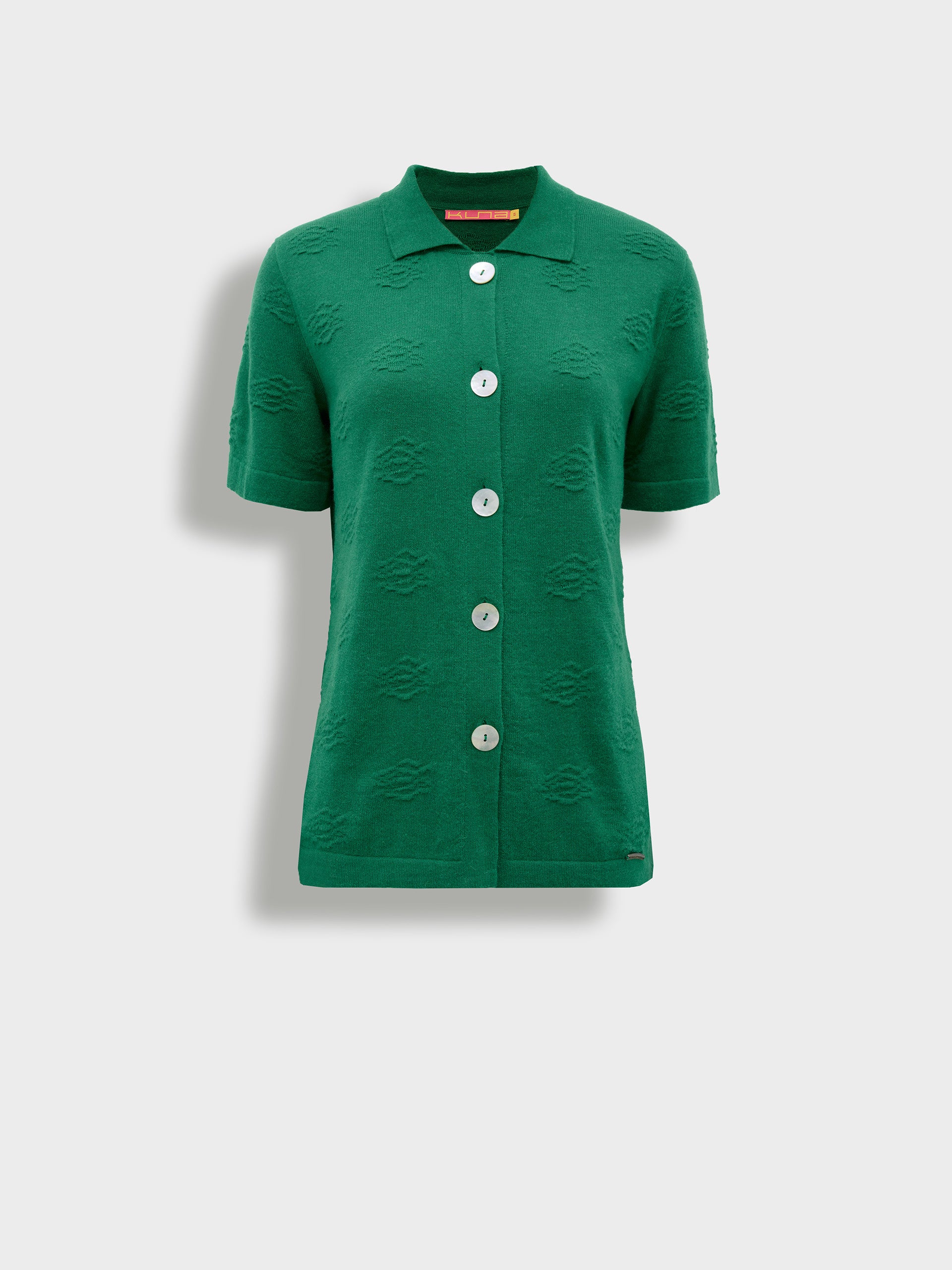 Zabeth blouse in green, made from organic cotton and baby alpaca. It features short sleeves, stockinette stitch, and pearl shell buttons, which enhance its natural and sophisticated design. Ideal for a fresh and feminine look. | Predominant material: Cotton