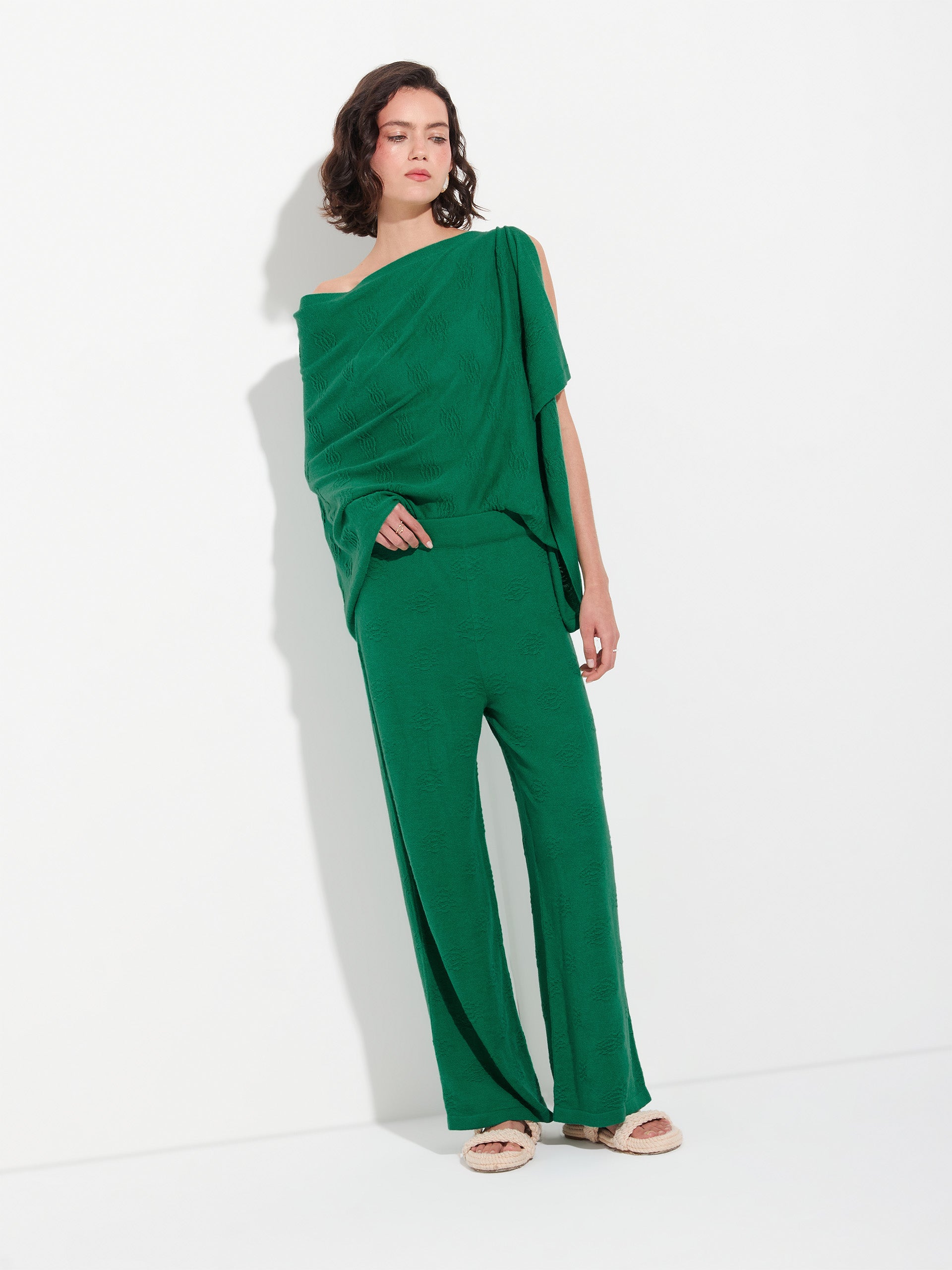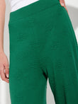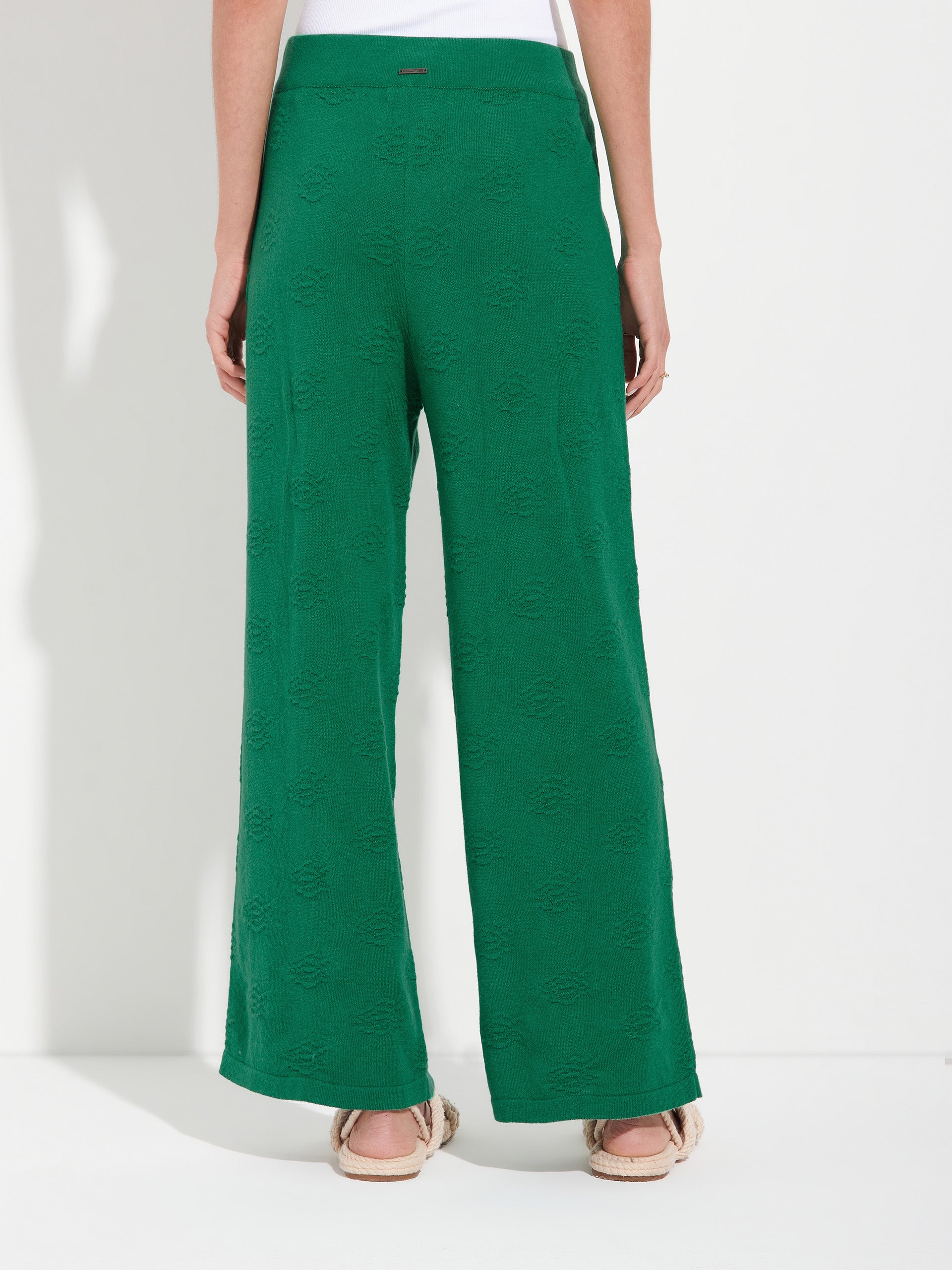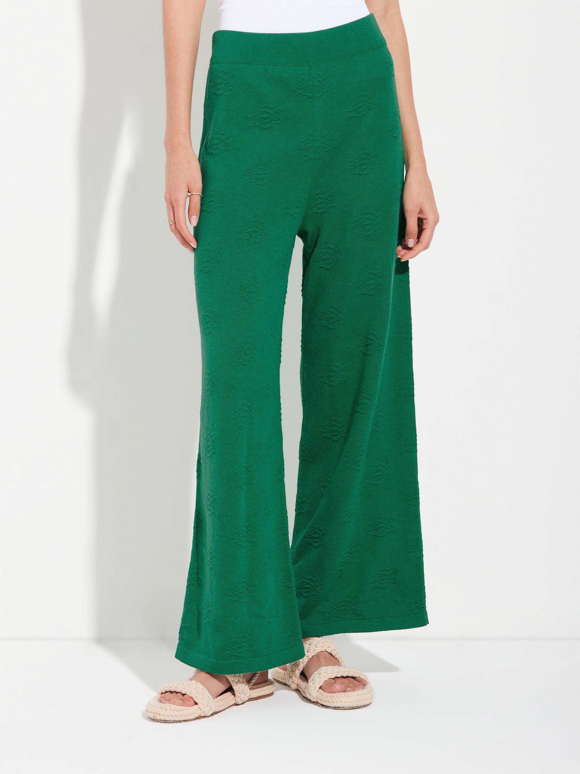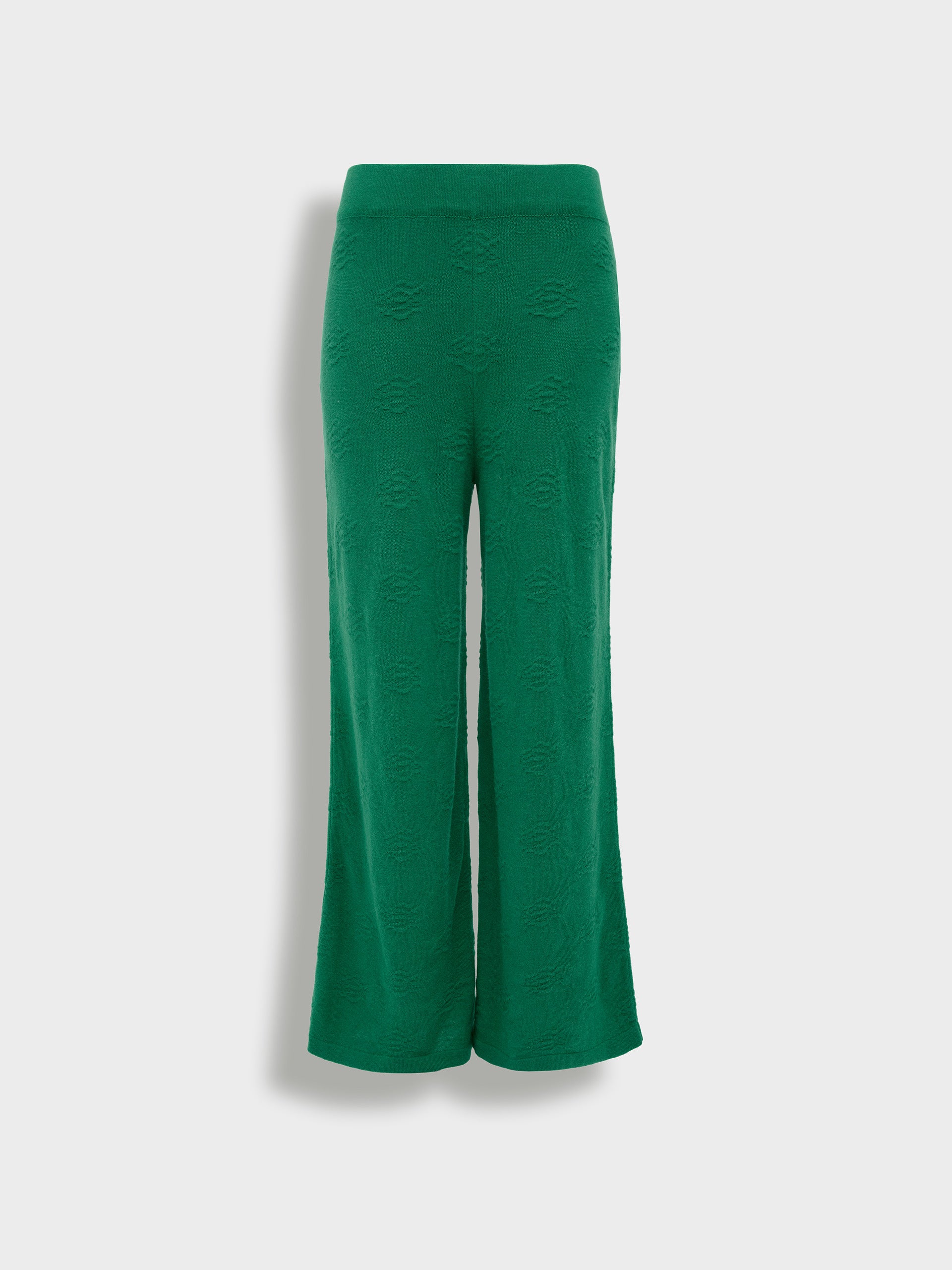 Zabeth pants in green, made from organic cotton and baby alpaca. They feature a plain knit and a delicate rose-shaped gathered detail below the waist. They combine comfort, softness, and natural elegance. | Predominant material: Cotton