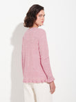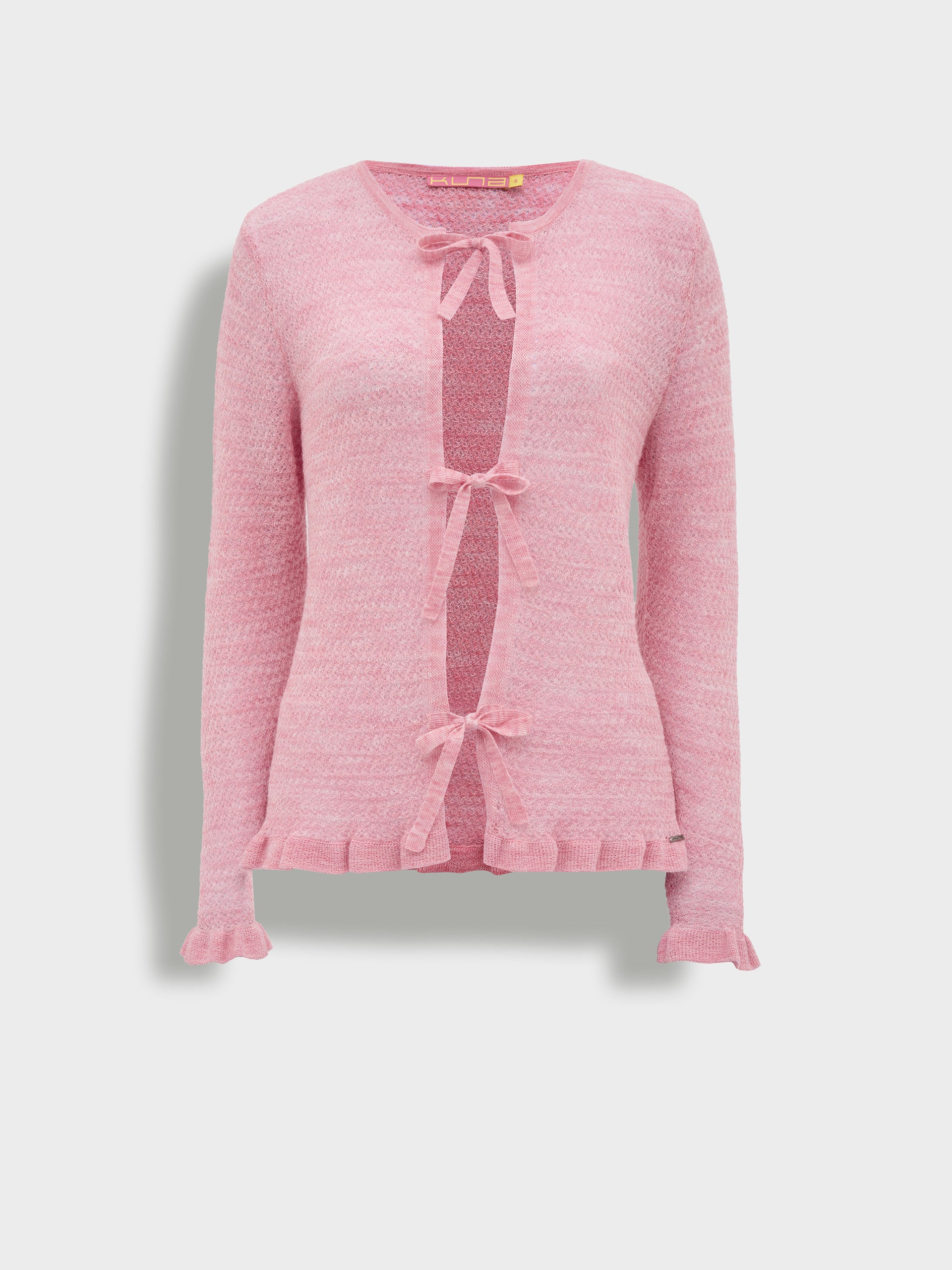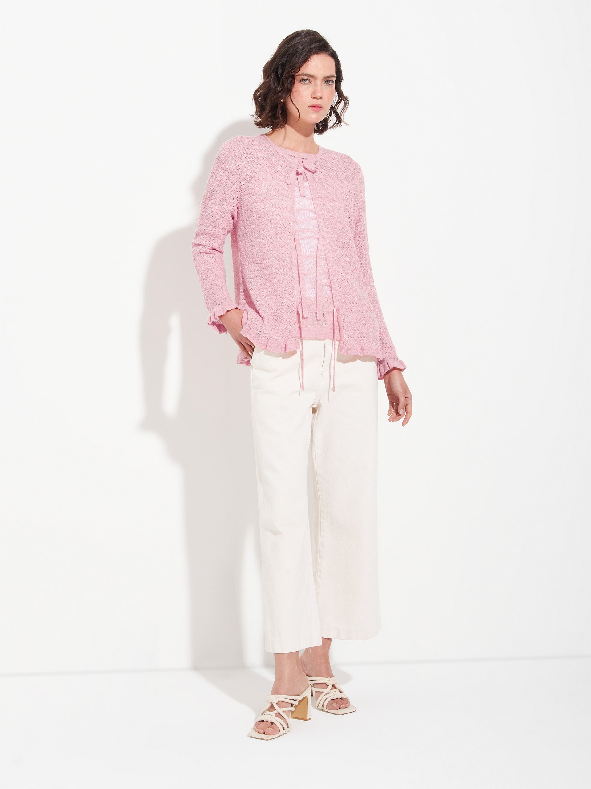 Zaeta cardigan in a pink shade, made from a blend of baby alpaca and silk. It features an open structured knit with delicate ruffles on the cuffs and waistband, as well as a button-up closure with ties that enhances its feminine and elegant style. Ideal for adding a touch of sophistication and softness to your outfit. | Predominant material: Baby Alpaca