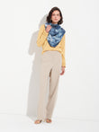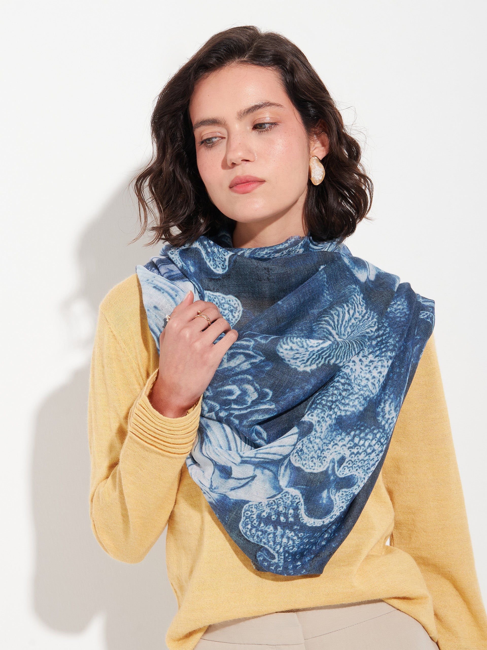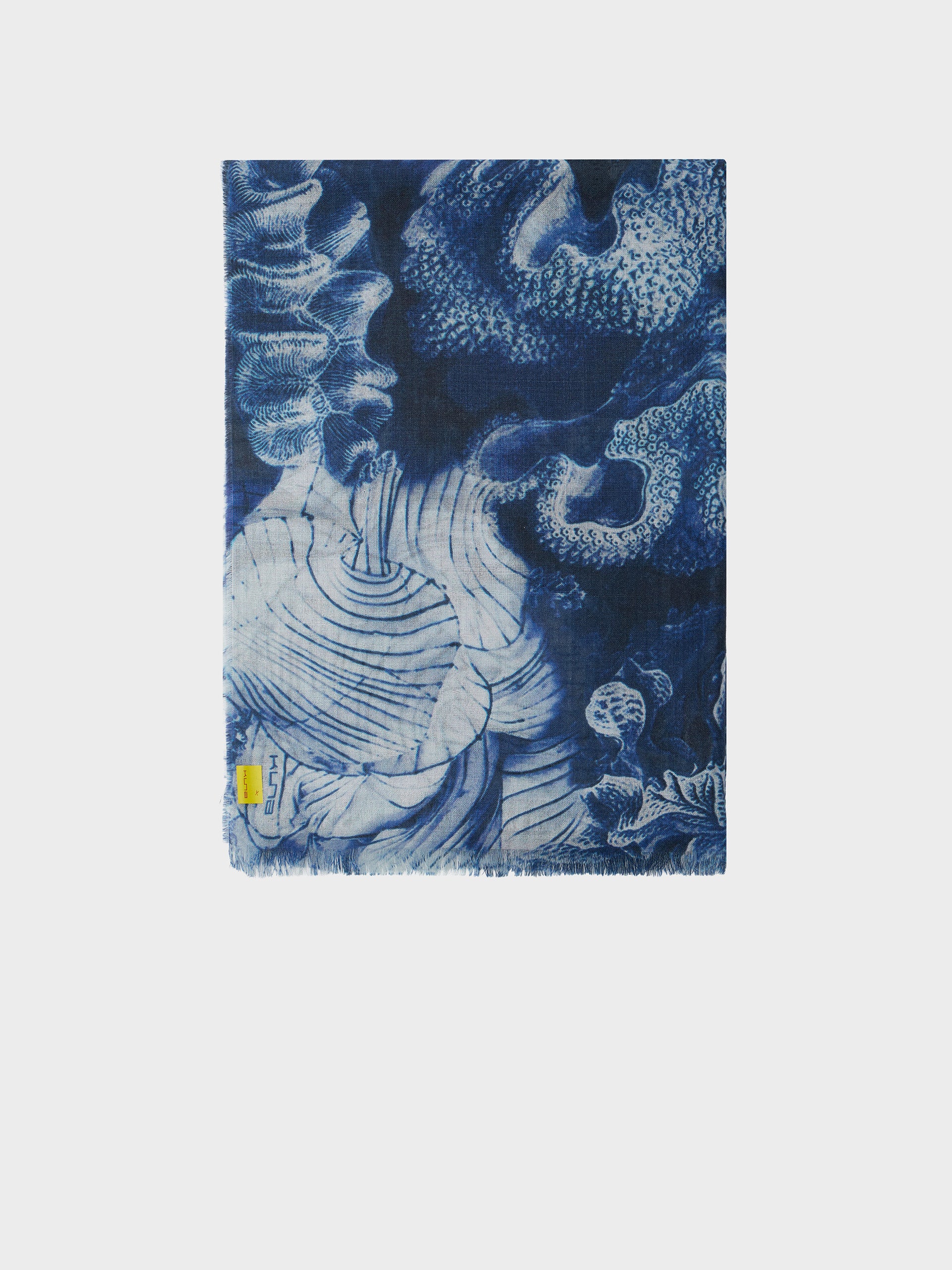 Zanone stole in blue, made from baby alpaca and silk. It features a delicate digital print and ruffles that add movement and fluidity. Ideal for adding an artistic and sophisticated touch. | Predominant material: Baby Alpaca