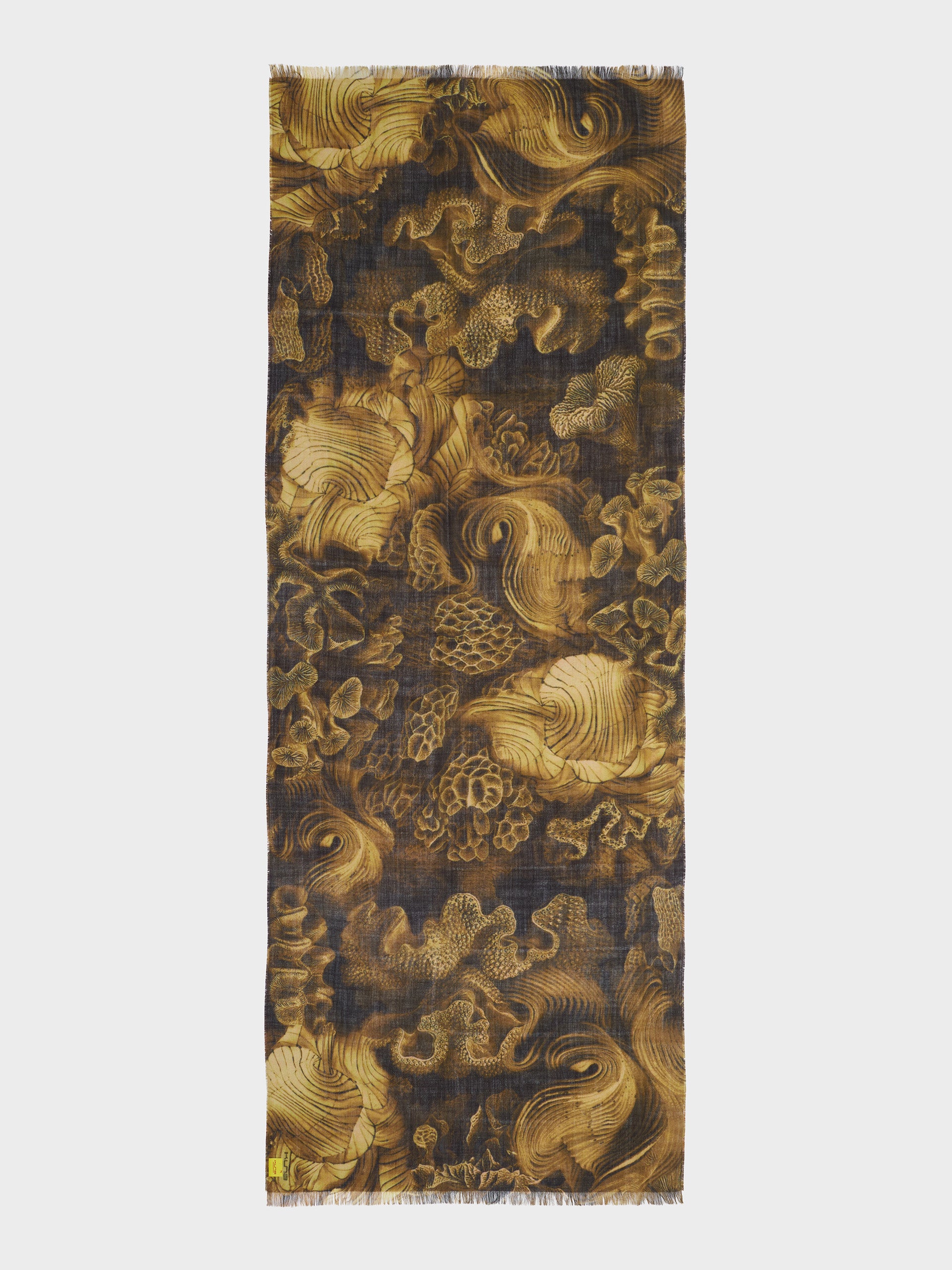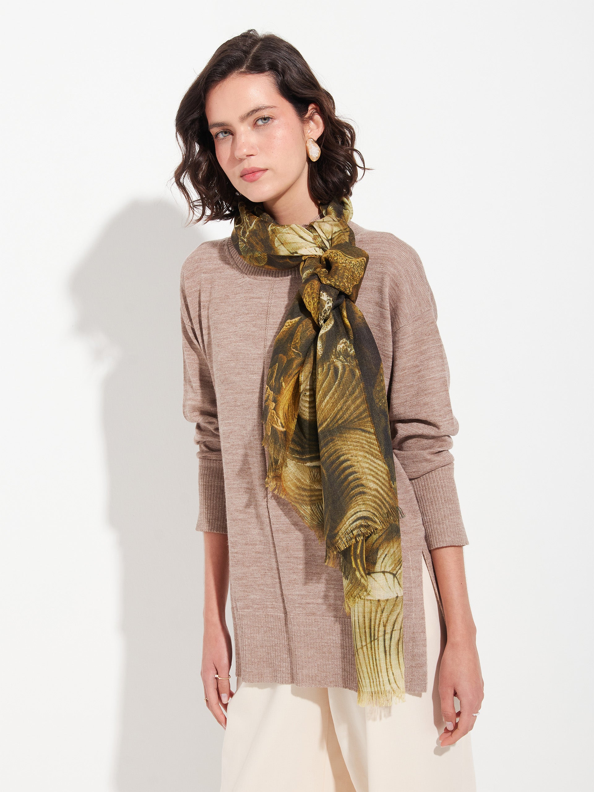 Zanone stole in yellow, made from baby alpaca and silk. It features a delicate digital print and ruffles that add movement and fluidity. Ideal for adding an artistic and sophisticated touch. | Predominant material: Baby Alpaca